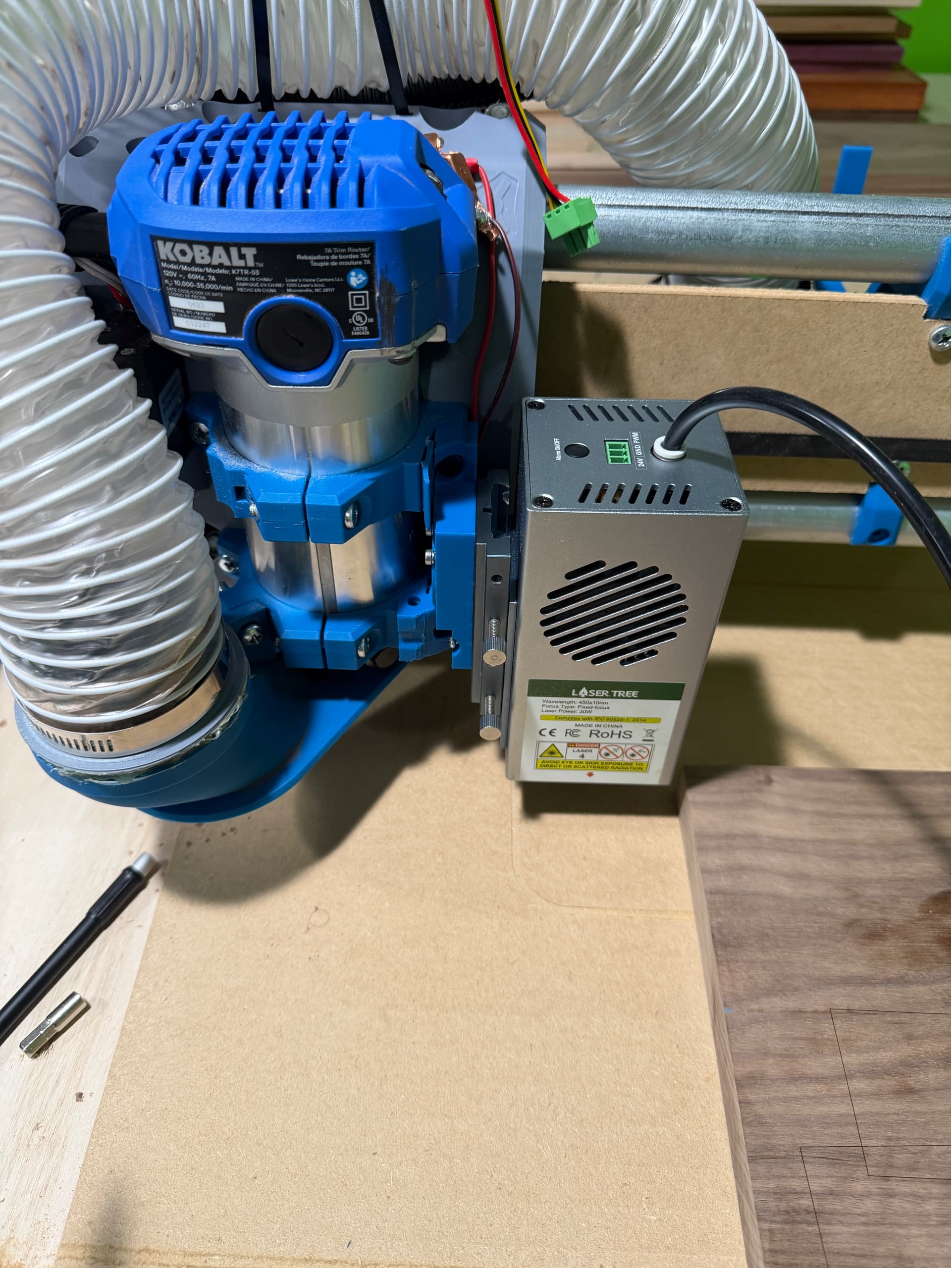 Having the laser mounted at the same time as the router gives problems with dust buildup on the laser lens (which reduces the efficiency and can cause fire), you also have the issue aligning your job with the offset position of the laser. I already have to reconfigure my system as the Jackpot board connects via wifi for router job setup, but the laser runs via usb connection for my Lightburn control. So an extra 5 mins is not a problem.