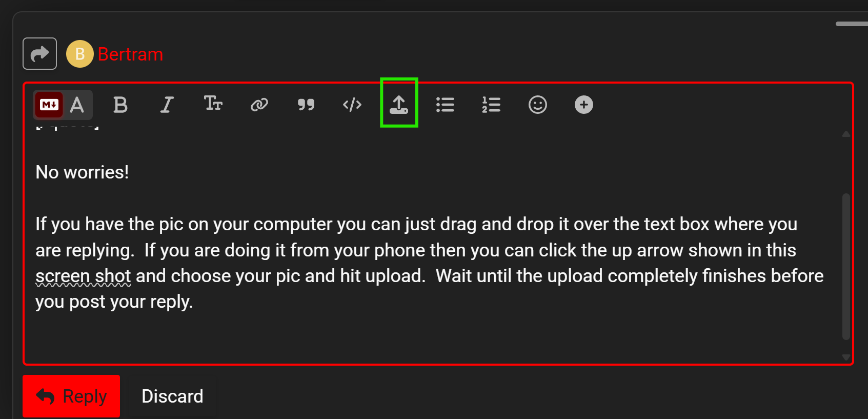 If you have the pic on your computer you can just drag and drop it over the text box where you are replying. If you are doing it from your phone then you can click the up arrow shown in this screen shot and choose your pic and hit upload. Wait until the upload completely finishes before you post your reply.