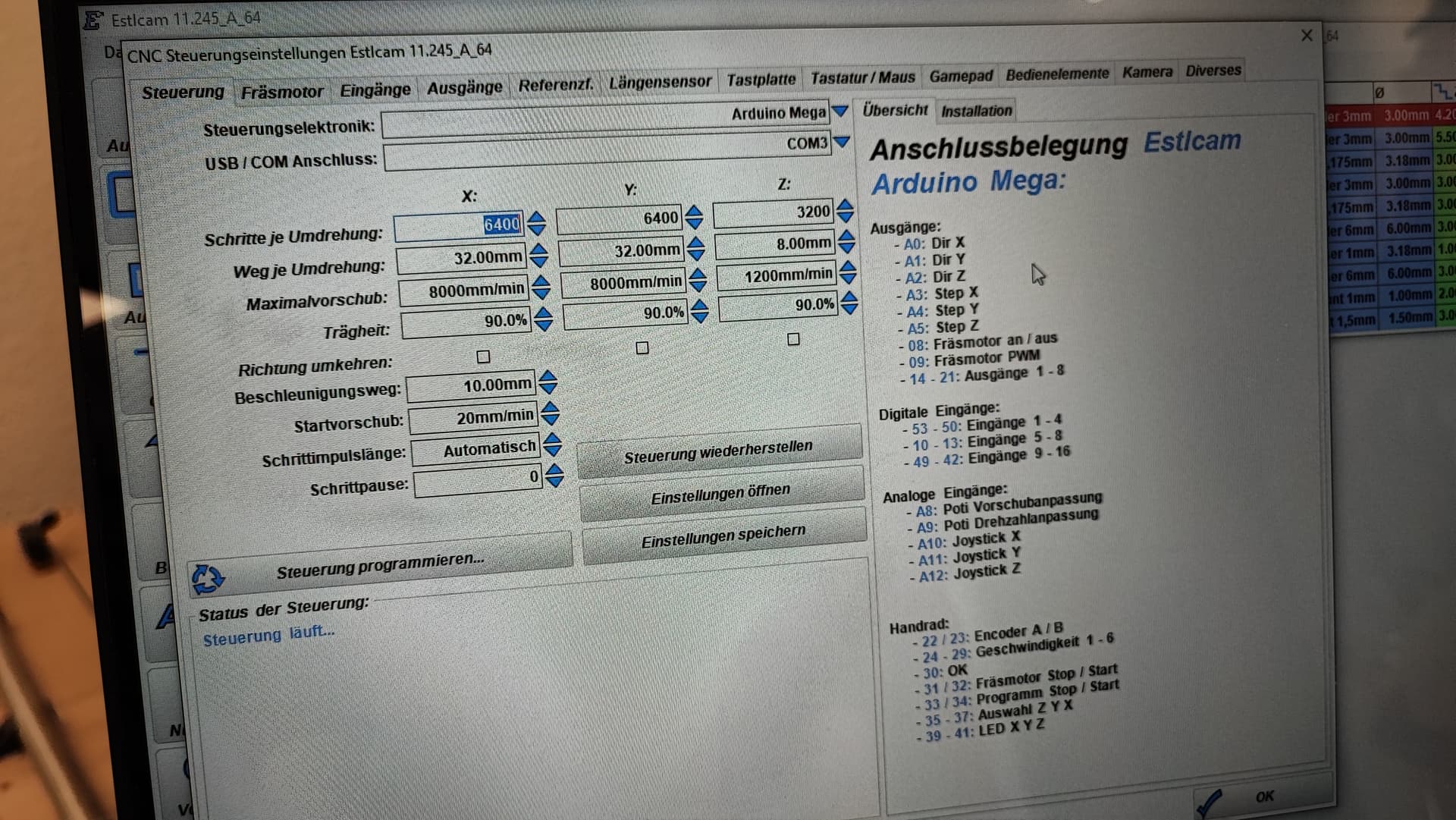 The acceleration is at the Bottom, “Beschleunigungsweg”, so how many mm it takes to reach max speed (had it to 10mm, which wasn’t enough, more makes the machine sluggish though) and “Startvorschub” that says how fast it is going to start until it reaches top speed after, in this case, 10mm. Acceleration is also not a straight line but a curve, according to Christian Knüll.
