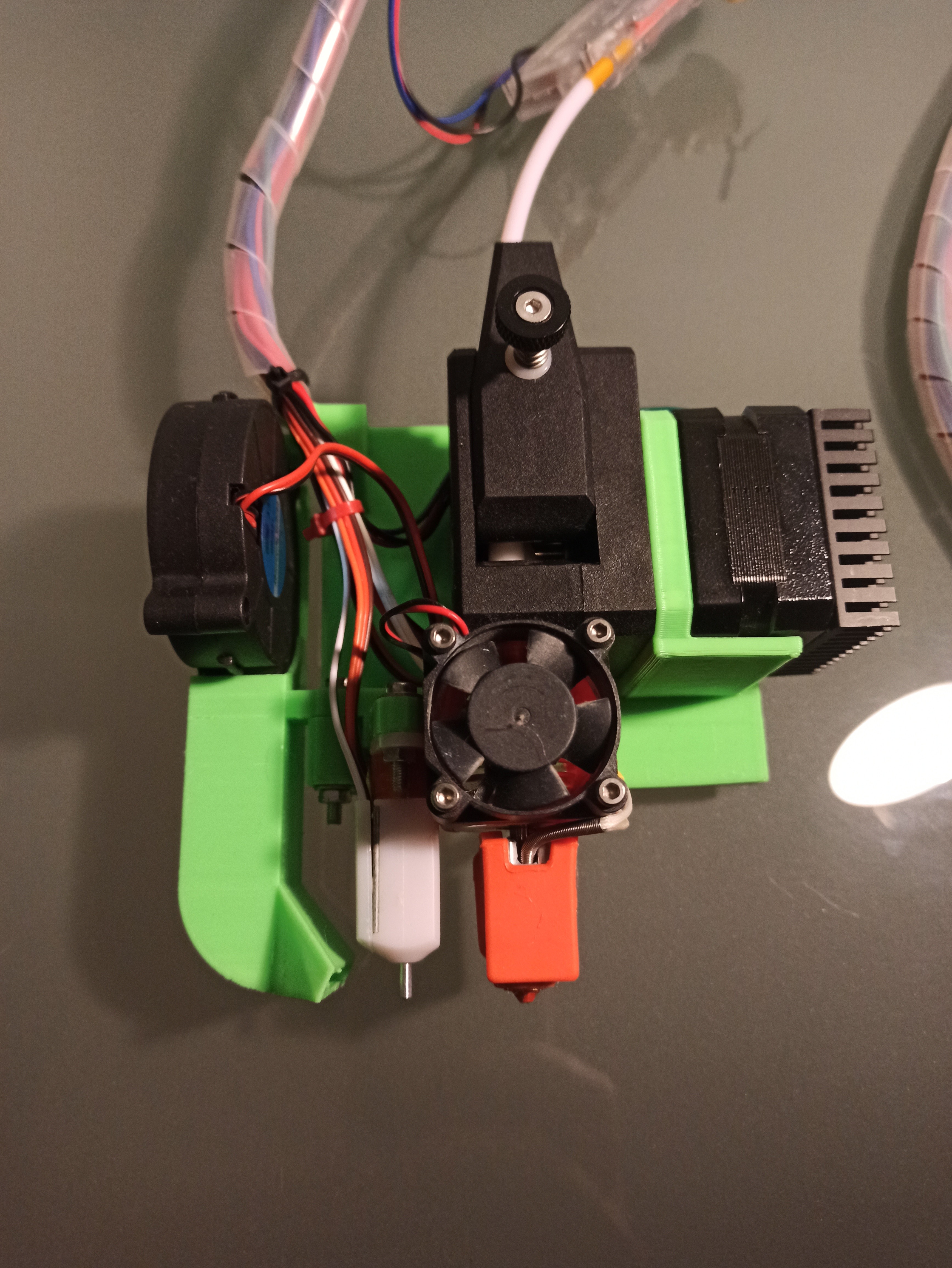 Regarding the hardware, I used this design to exchange tools, and I remodelled it a bit to fit my needs and to be able to mount the extruder, BLTouch and layer fan. I used a clone of the BMG Bondtech from Trianglelab (it works very well), the resulting part to install everything on the print head is this one: