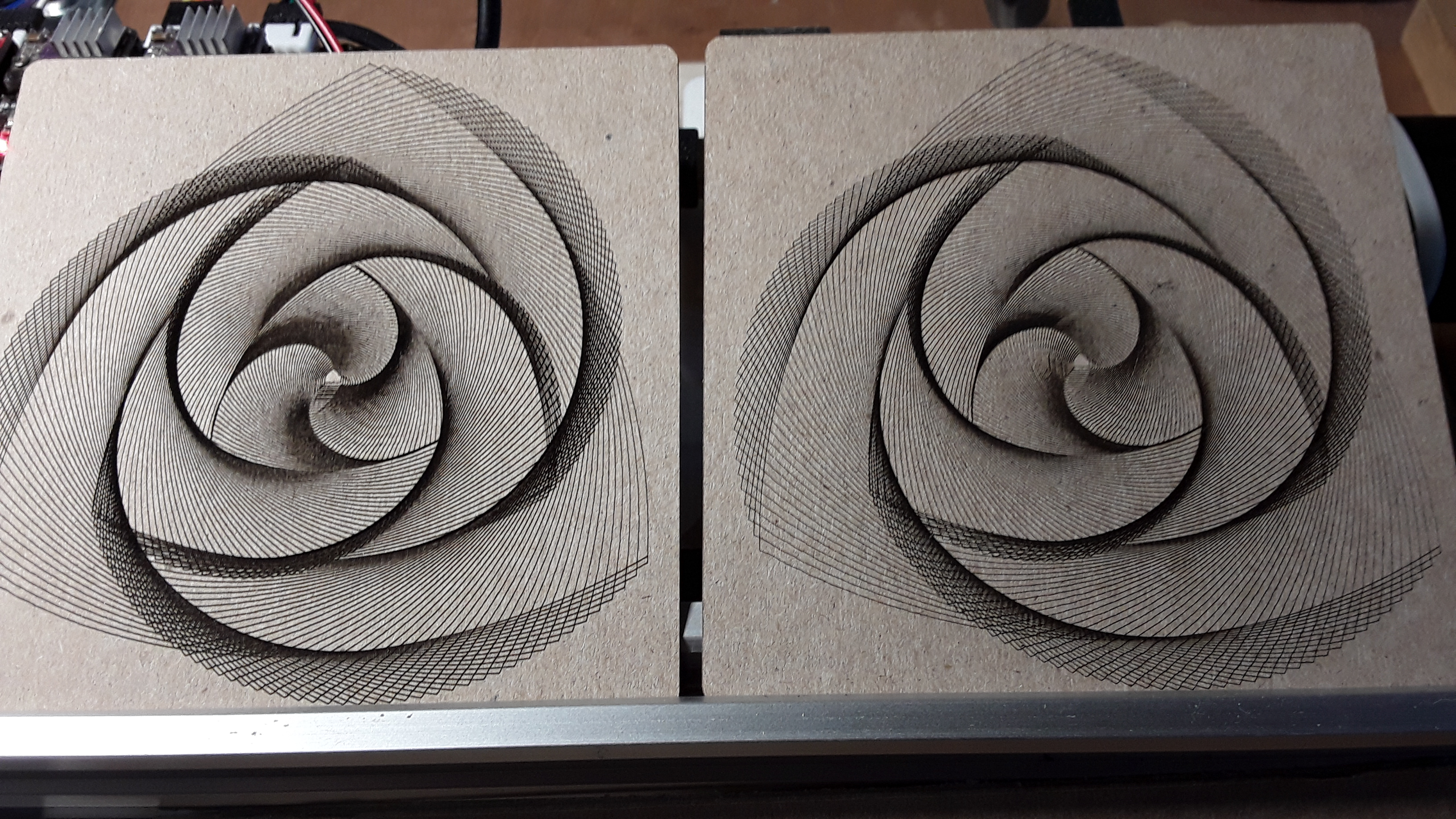 And the exact same gcode file for Jeff’s Mines pattern was plotted… Neje (left) and Eleksmaker (right).
