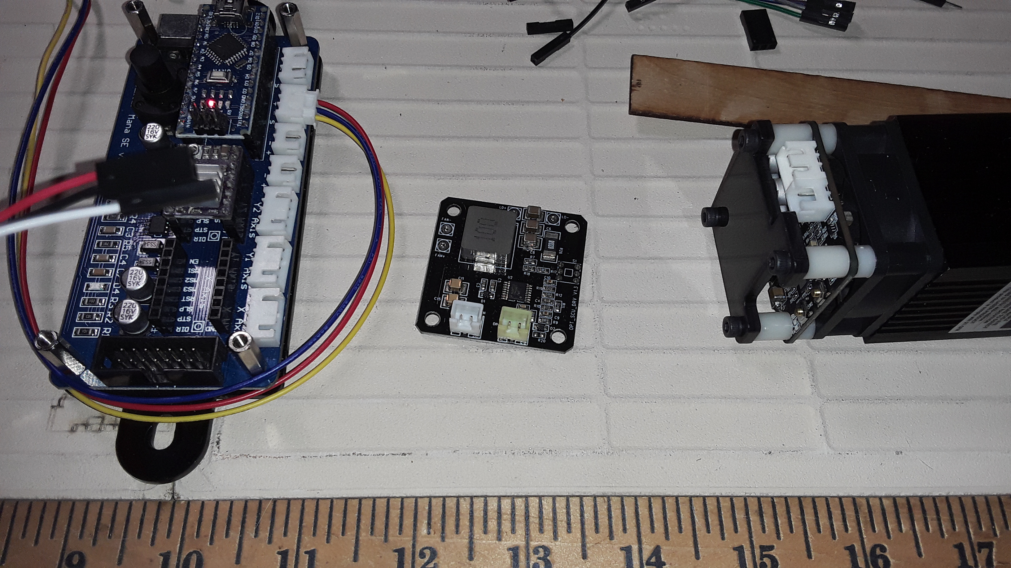 I received a second Neje 6W laser module this past week, finally catching up with @geodave… <nah-nah-na-nah-nah!> And, though I had ordered and received the 5v to 3.3v level converter boards as well, I still questioned the need for them. So I revisited all the Neje laser module webpages I could find once more, seeing time and again the 3.3v - 12V PWM claim on the modulation input… and since I had a working lashup sitting there on my “bench” I decided the heck with it. So I unpackaged one on the Neje modules and hooked up the power pins to +12V and GND… and the PWM pin to the same +5V PWM I use with all my other lasers. And, voila! A working laser.