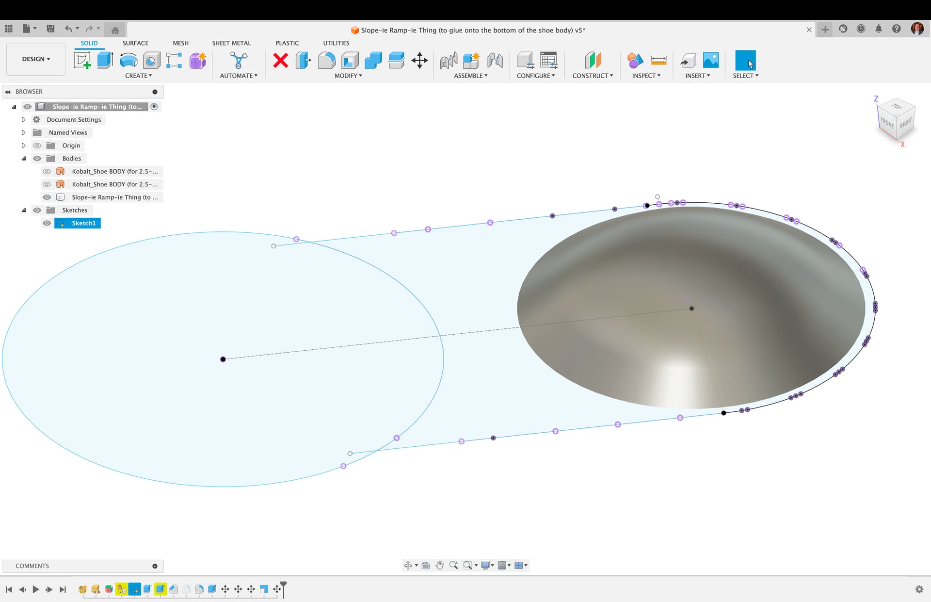 Design in F360 (sketch represents upside-down shoe body, i.e. the bottom of the shoe):