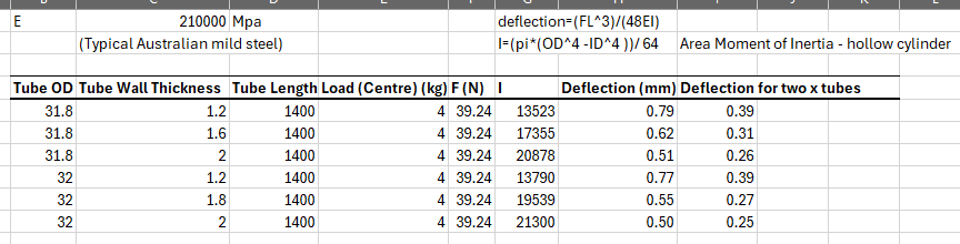 The way I see it the Bunnings 31.8mm 1.2 wall tube will have a total max deflection of 0.39mm and the 1.8mm wall 32mm electrical conduit will have 0.27 total max deflection. I’m not sure it is something that will be noticeable in actual use??