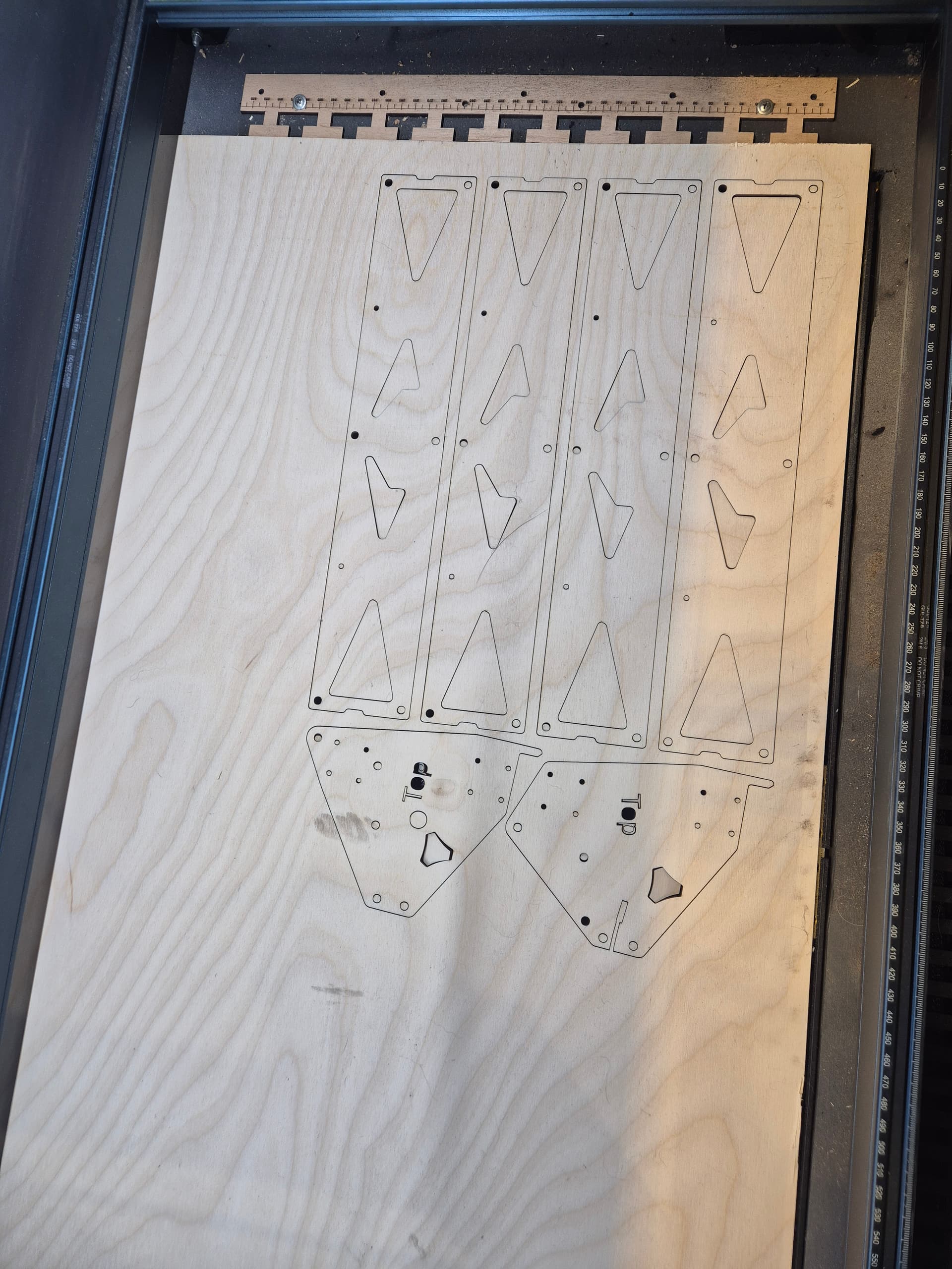 Cut temp struts from 3mm plywood on the laser, also cut the templates for aluminium processing. I will stack them to create 6mm thick boards, till I manage to cut the final ones on the machine itself.