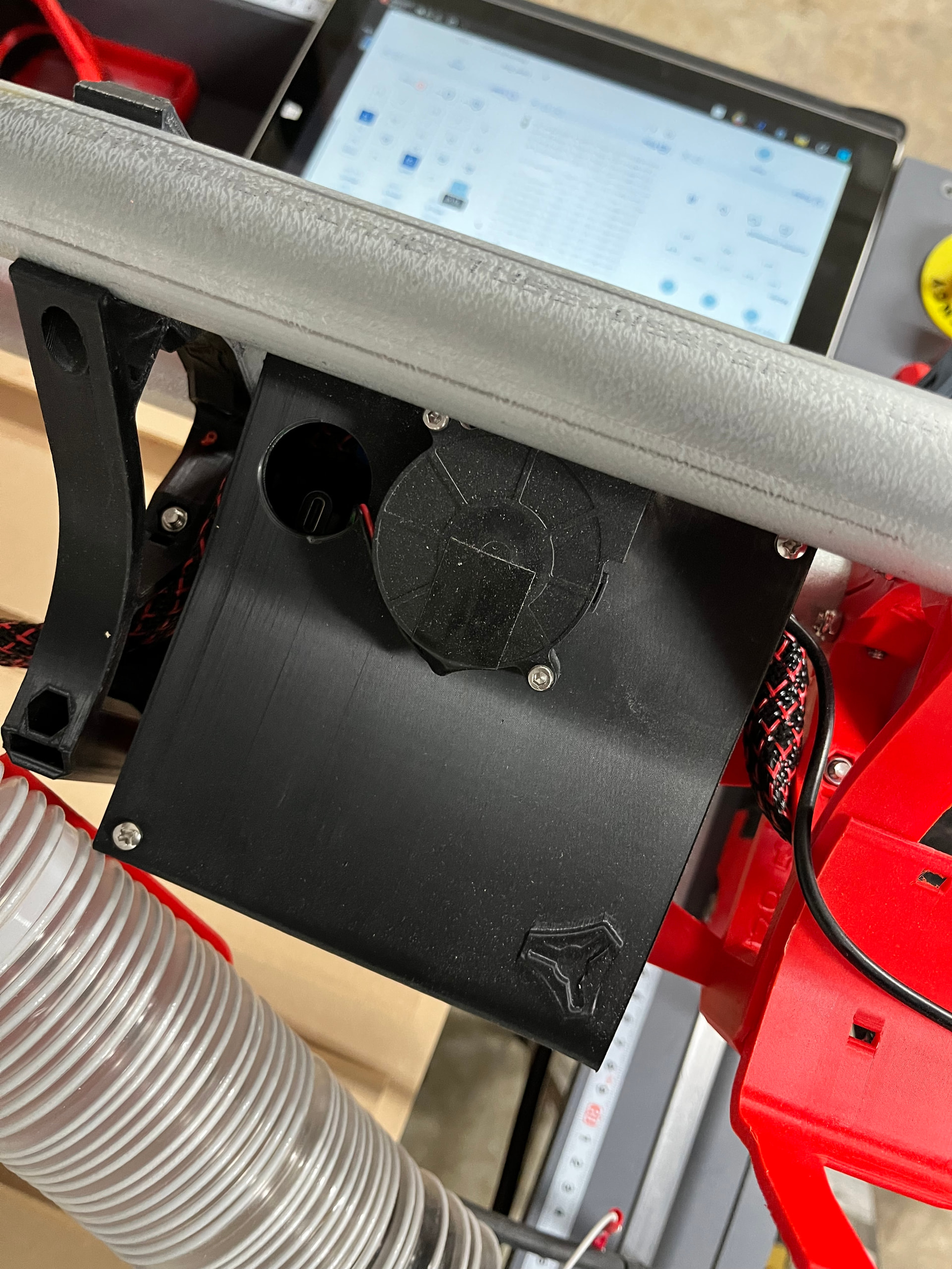 I was dissatisfied with the suggested wiring solution and ended up using 2 stranded Cat5 cables, soldered to the Y-Max end. At one point I corrupted the configuration and had to remove the controller from it’s housing to reflash. I installed a 90 usb C adapter and a 2” hole in the controller for easy access. I also decided to keep the 24V supply off the gantry as the low voltage lead was plenty long