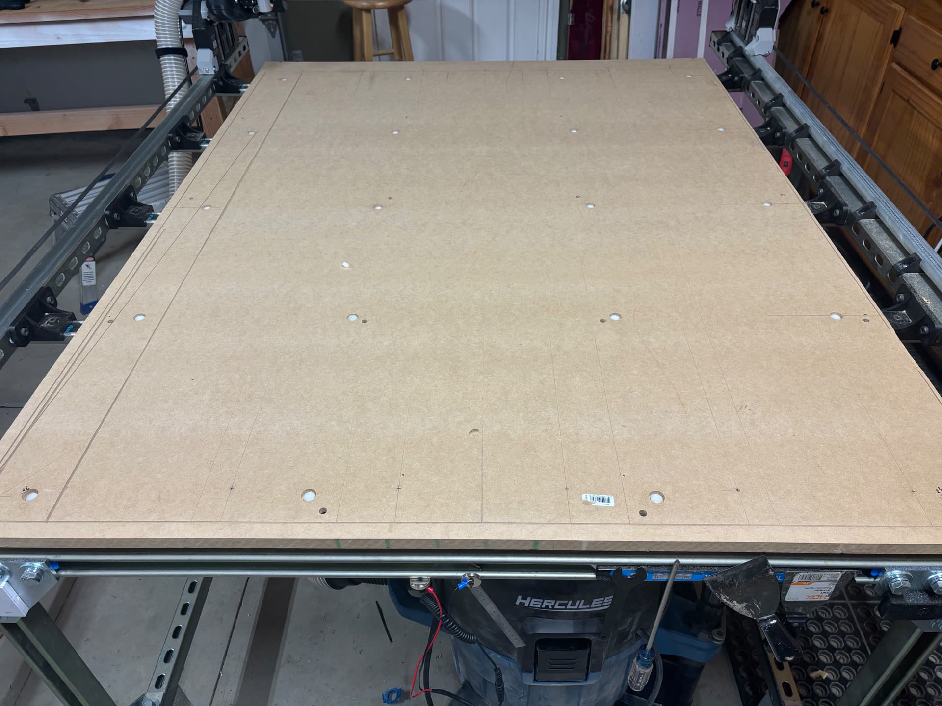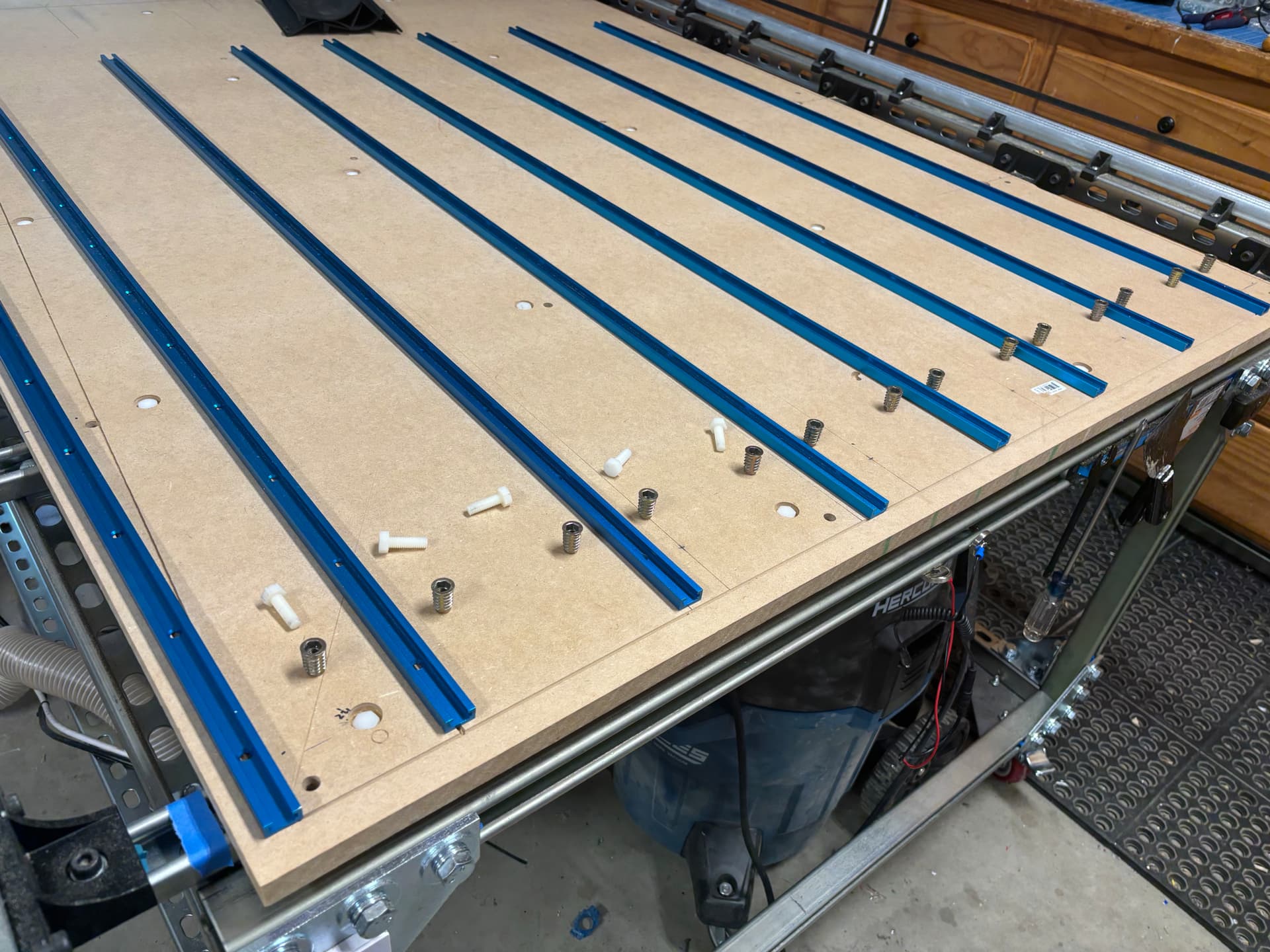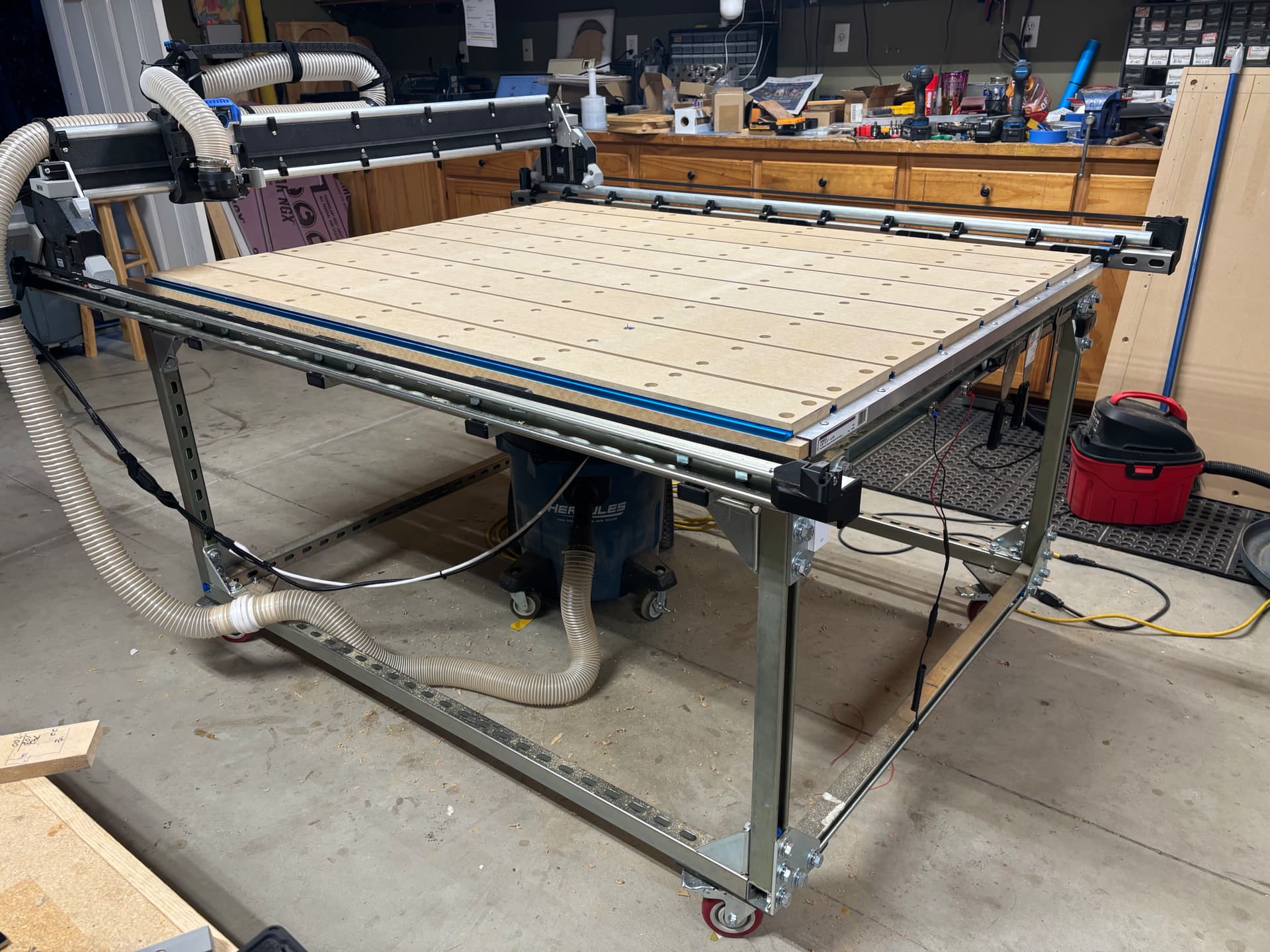 98% up and running…. Now to complete the spoil board setup… got more 3/4 MDF and will cut 60” strips with 3/16 miter on edge to overlap the t-track helping to hold that in place from the clamp pressure when in use. The dust extractor from HF fits under the table so long as I allow it to roll around freely… which is fine. Should be 100% by tomorrow as my wife is going wedding dress shopping with the daughter.. and I have the entire day to myself. LOL