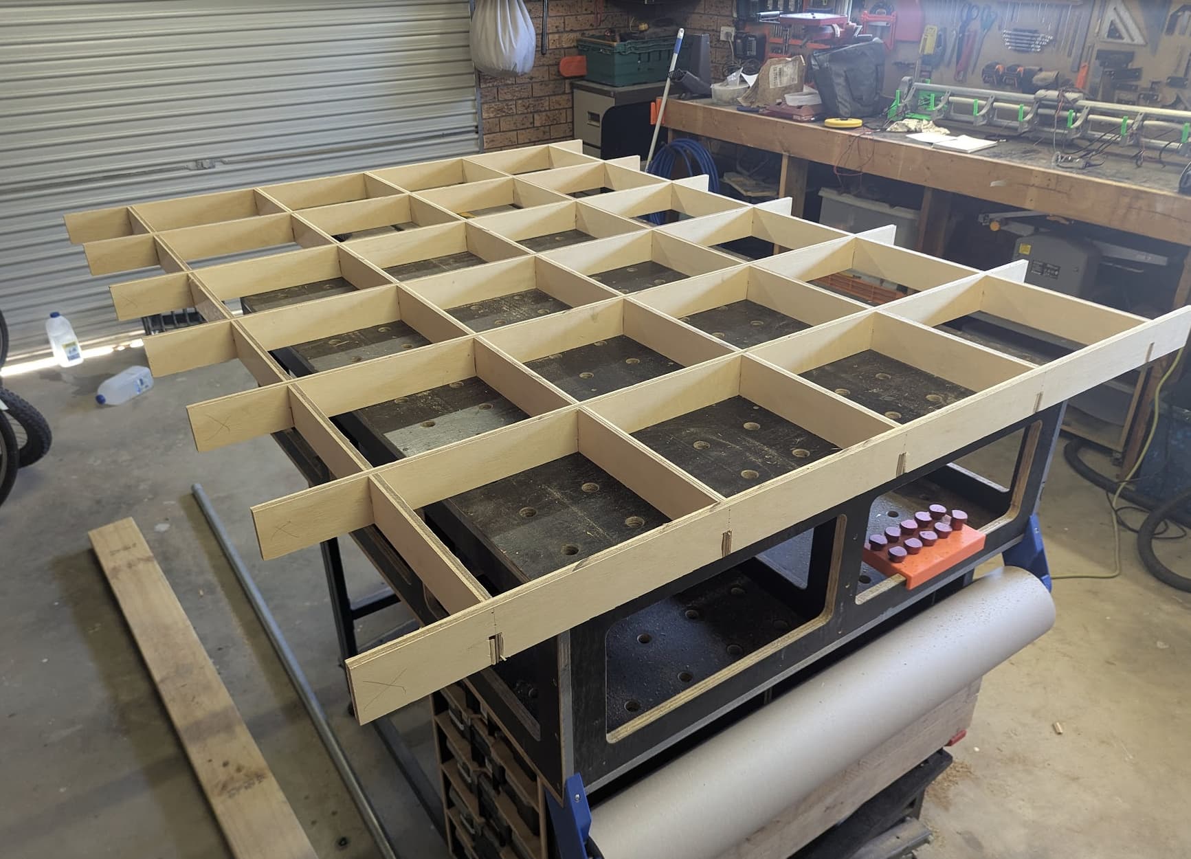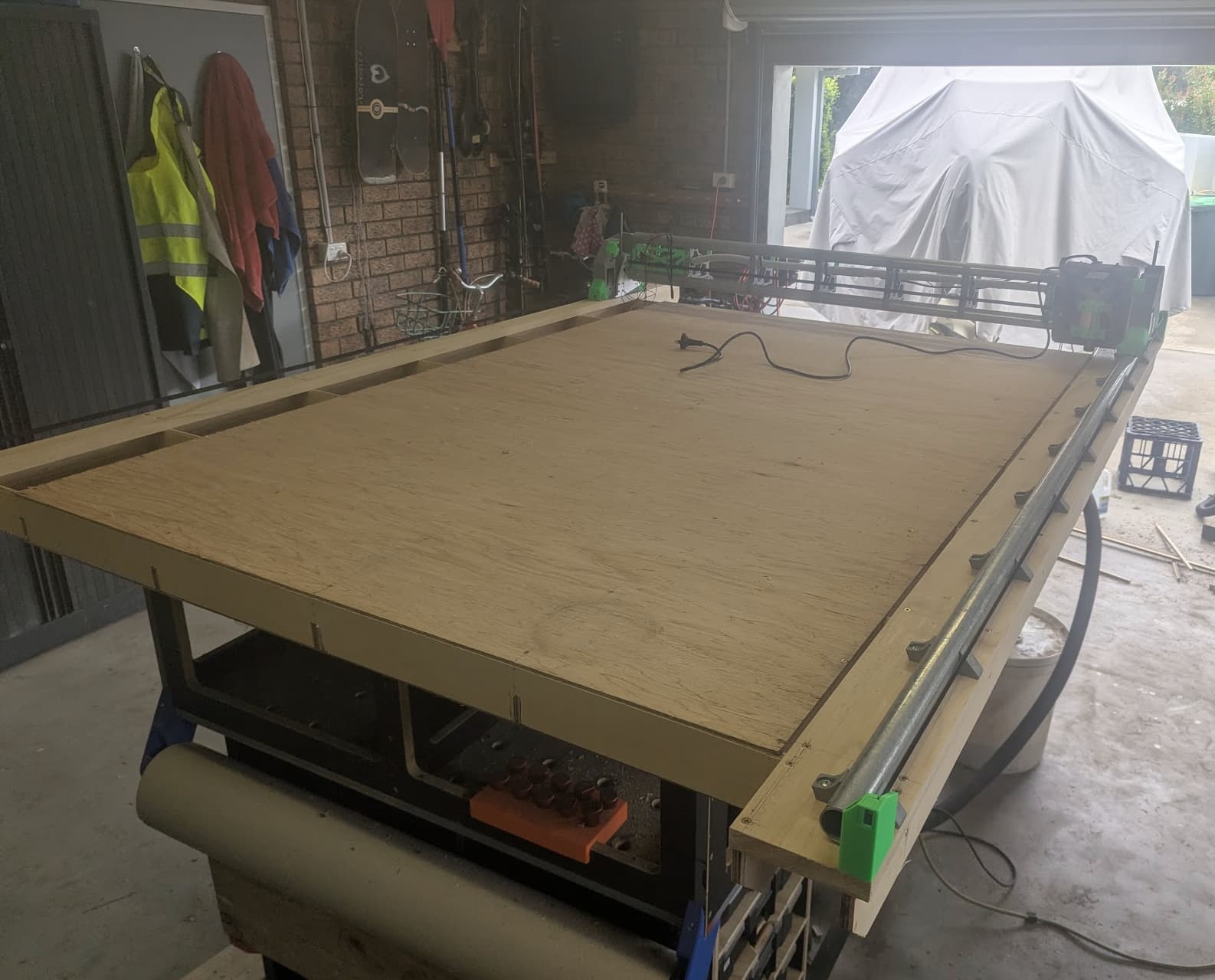 Progress has been made…. though not as quickly as I would like! Have ended up going for 1830x1220 working area on the table. Have made provisions for the folding design above, but figure the best way to do that is by using the LR4 itself! For the time being the torsion box can sit on the assembly table and light enough to move off to the side when I need to.