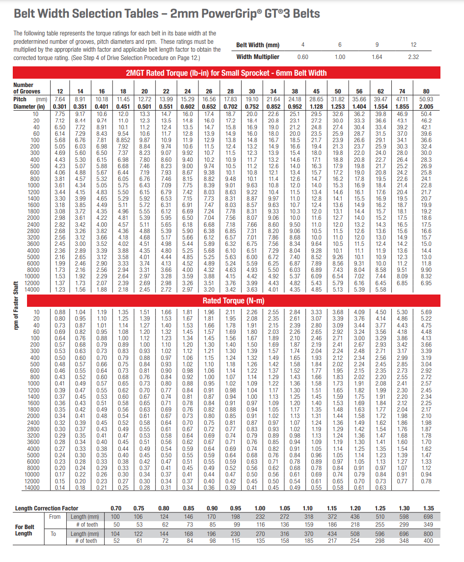 This table also explains why I am happy using 6mm belts on the reduction gear, because as you can see the larger pulley can handle the torque even at smaller belt sizes.