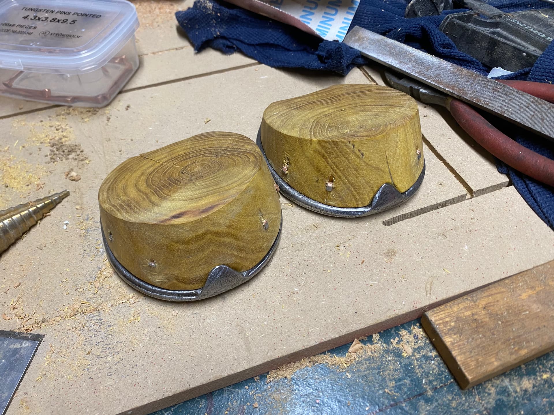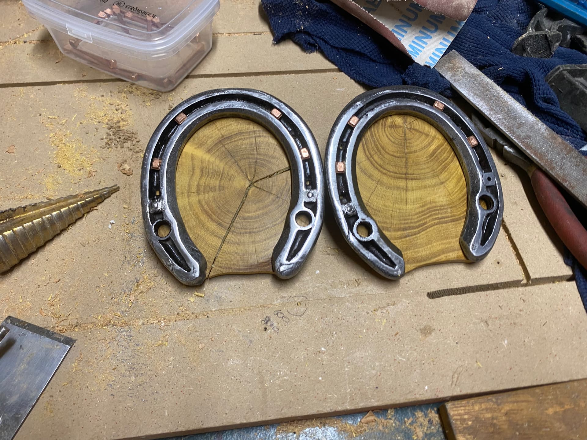 The hooves were mullberry, which after a foam insulation trial were rouged out with a 2flute 4mm upcut. I then used the belt sander again to create the actual hoof shape - much quicker than a finishing pass! Holes drilled for the copper nails, and the polished and lacquered shoes were then nailed on and trimmed up and clenches knocked in.