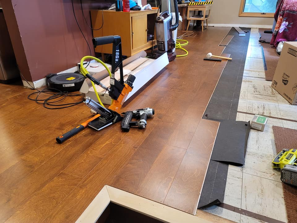 Some recent trips through an auction site have resulted in 1200 square feet of engineered hardwood flooring for less than 1.50 a square foot. So now we’re re-doing all of the floors in the house, replacing poor quality laminate and old carpet with hardwood, encapsulating good condition vinyl asbestos tiles with tar paper underlayment (spec’d by the manufacturer) and nailing the planks down, etc… Before you say anything, several flooring pros said that this qualifies as encapsulation and is just fine, because the wood becomes “structural”… The poplar on the stairs is a placeholder.