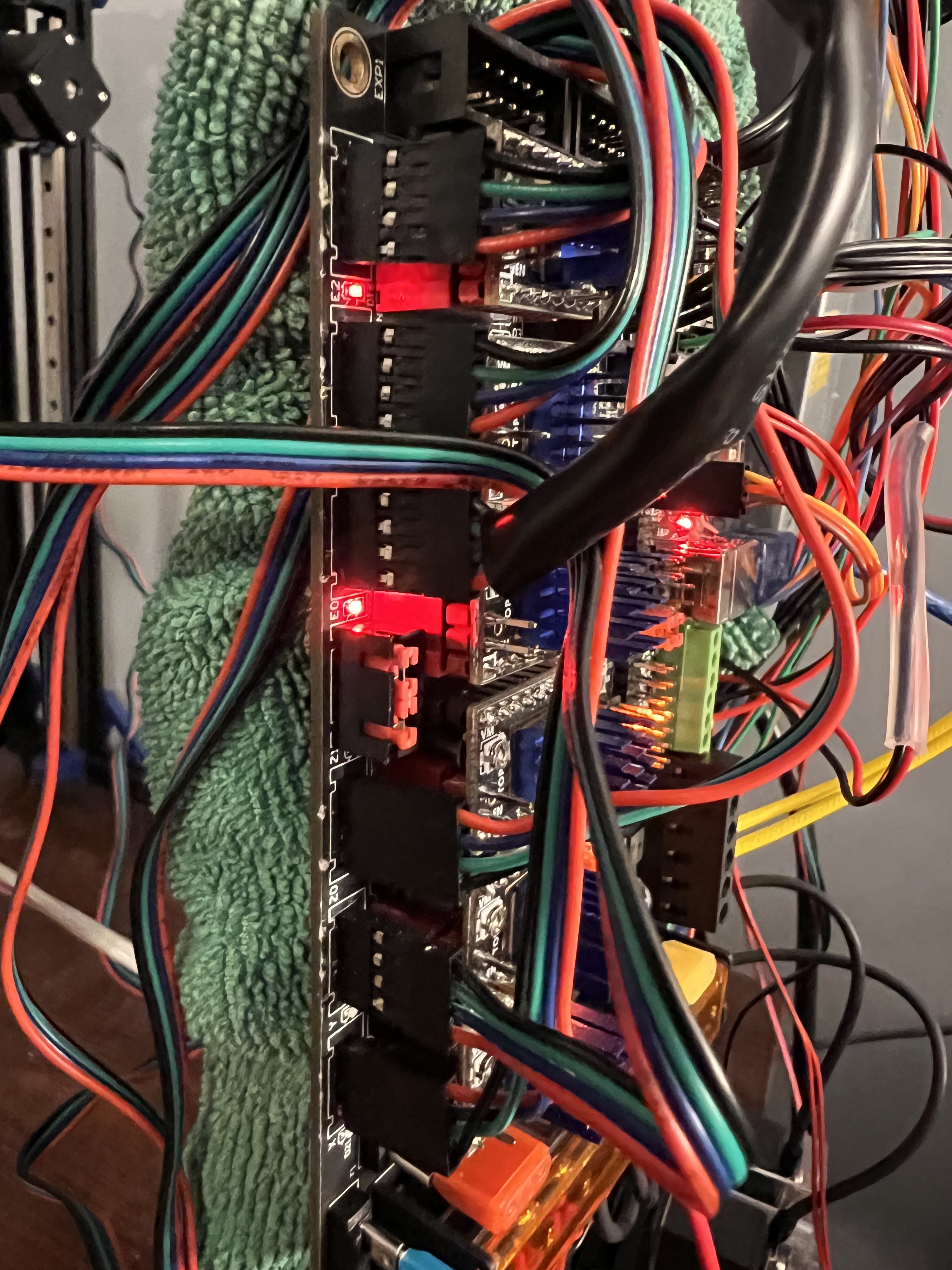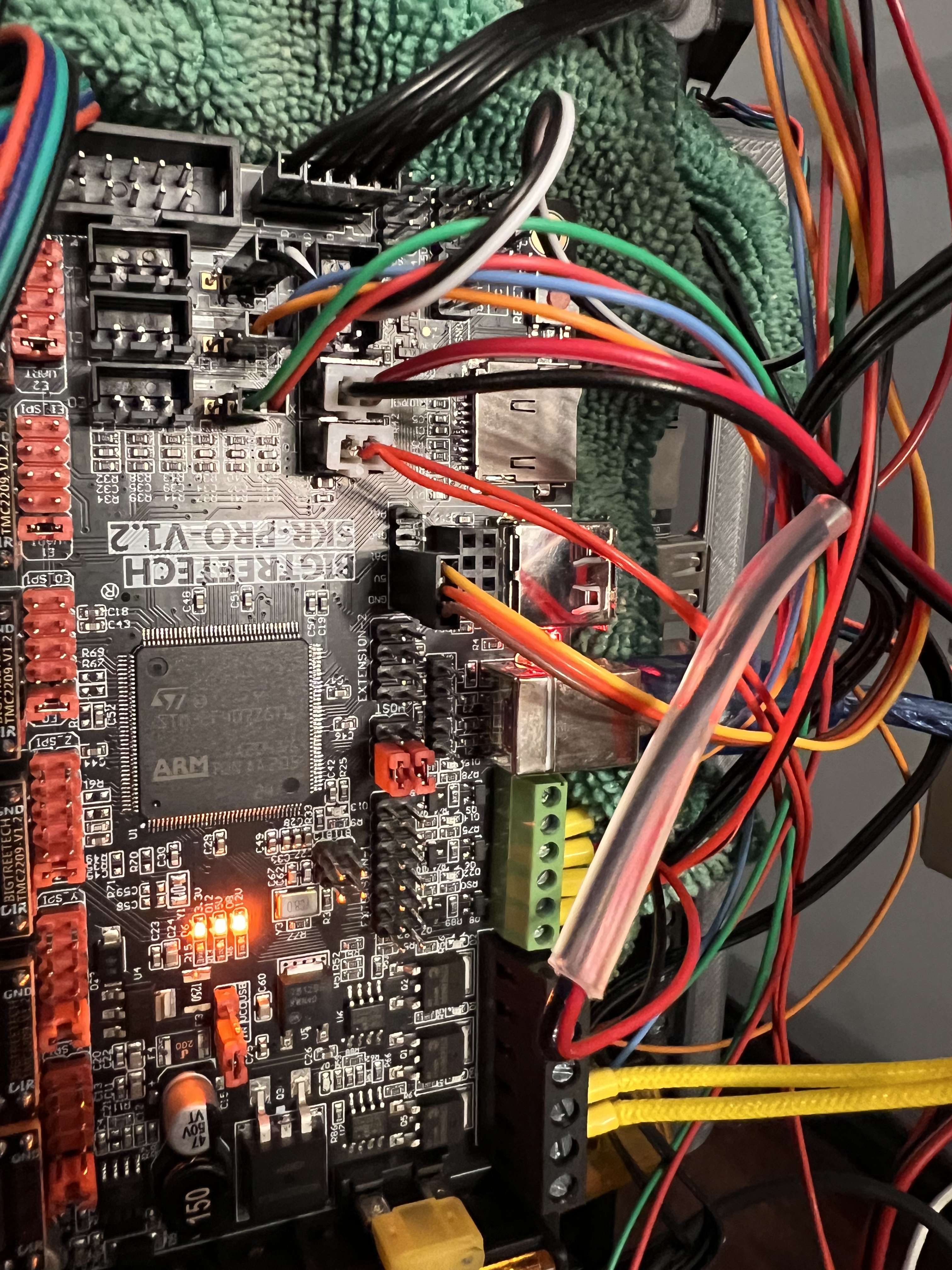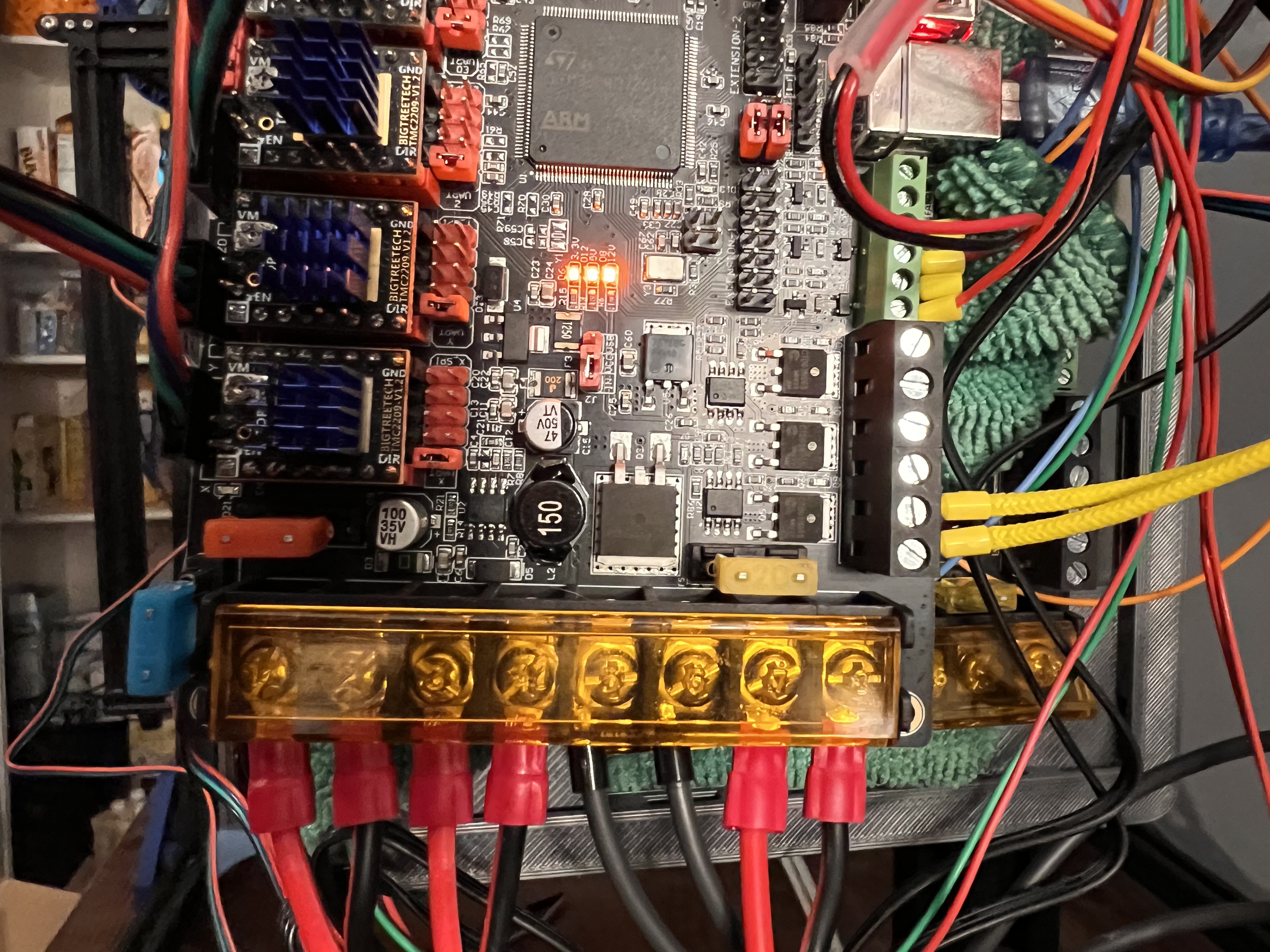 All the plastic deals were removed from the board. I know its not mounted…one of the first things i hope to print is the new case design and in my haste to see if it would work I didn’t take the time. But none of the wires are loose. Everything turns the correct direction. Only thing that could be off I suppose is a Z stepper in the wrong position but I will triple check that right now.