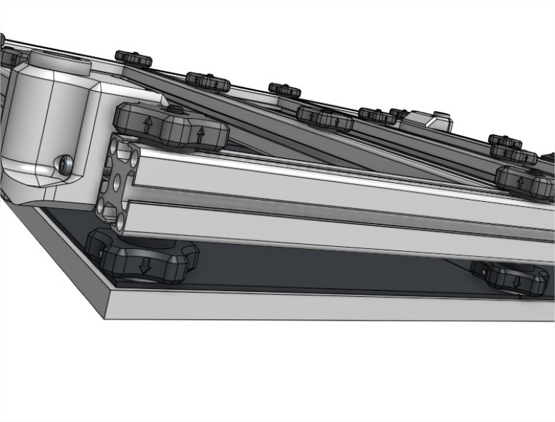 So, the plate will be secured with 16 M8 screws, spaced at regular intervals. Then there will be two adjusting knobs: one for adjusting downwards, and an other one for adjusting upwards.
