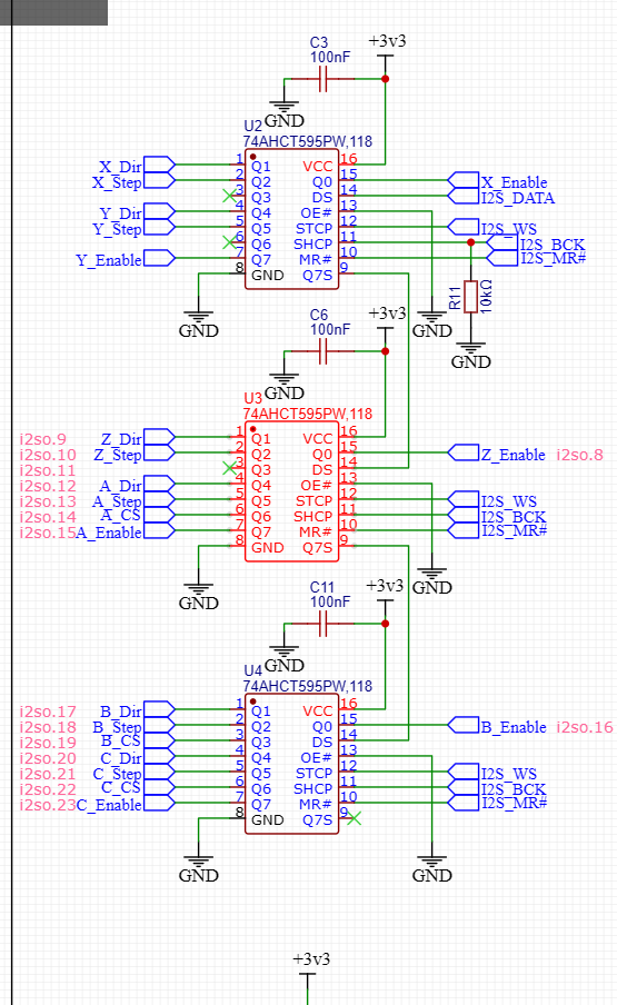 The X, Y, and A ports are only move one direction. Very odd. I checked all the pins under a microscope, the drivers and shift registers chips no signs of issue. I even hit those direction pins with solder and flux just in case. swapped the ESP, checked all the header pins on everything, no issues