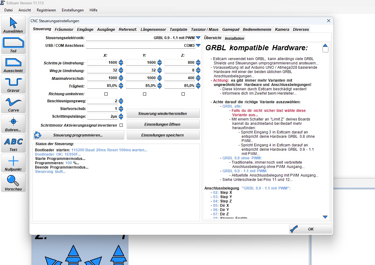 I am using my original hardware: an Arduino Uno (Elegoo Uno R3) with a CNC Shield V3, controlled via Estlcam.