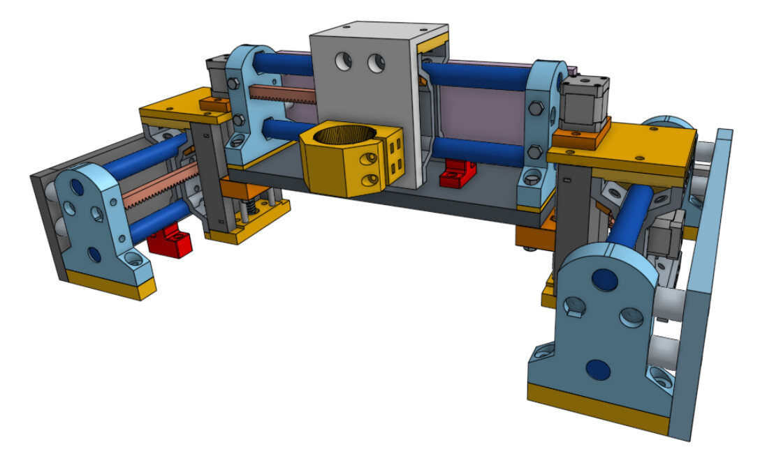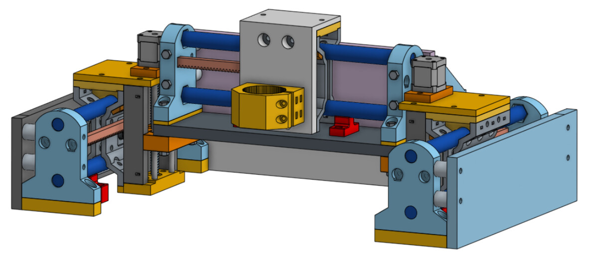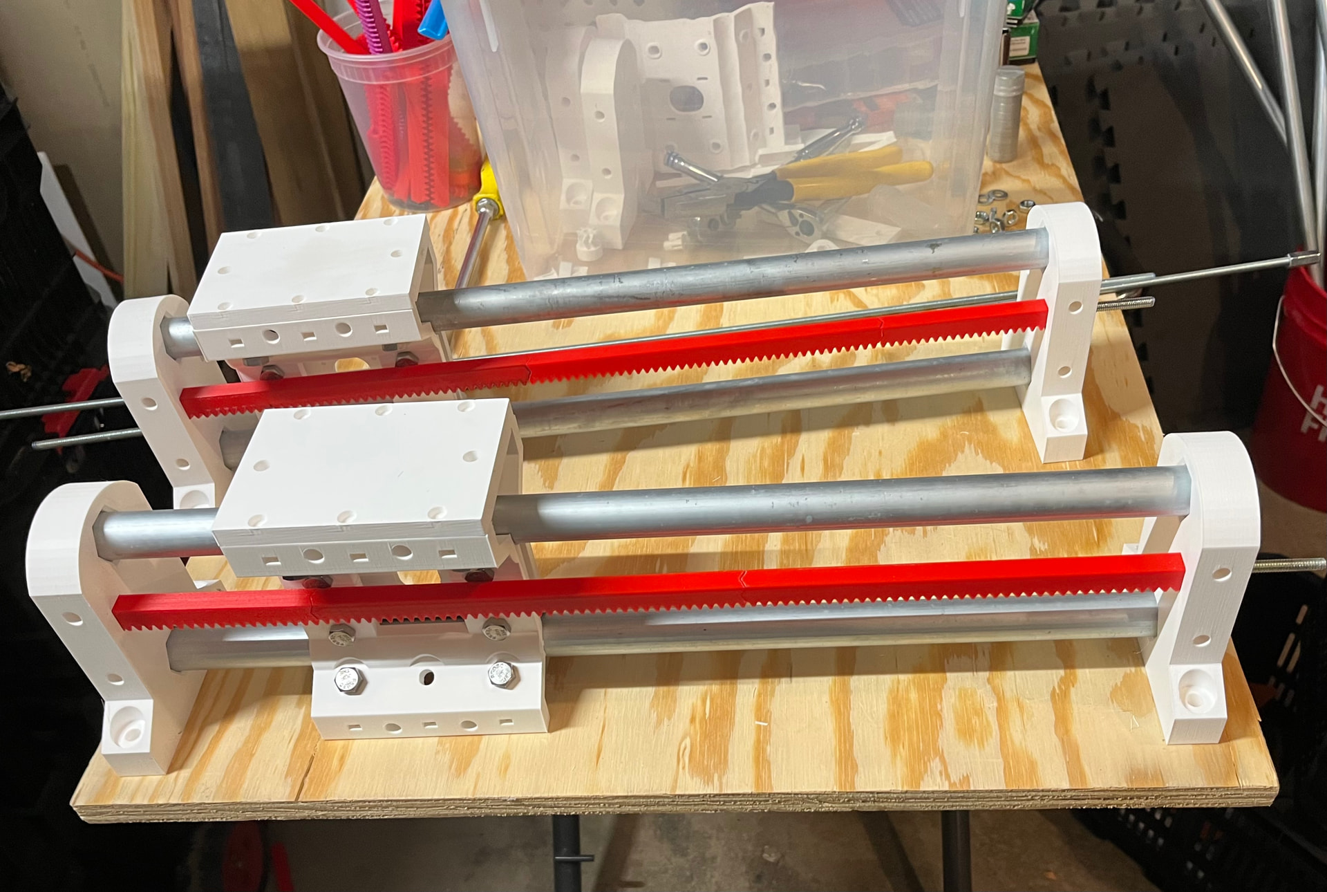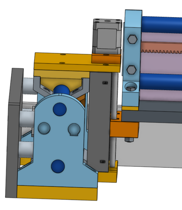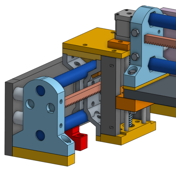 I love the red racks. It seems fitting that the R&P in MPR&P should be emphasized and shown in stark contrast. I also donāt know whether you have bearing in place yet in your mockup⦠but the angled bearing bolts should ideally be 1" bolts (except the 1-1/4" ones that also go though the pressure bearing mount)⦠but if not, at least reverse the lower ones to put the heads next to the bearing for clearance of any rail supports, should they be installed on a longish linear stage. These rail supports are shown in red in this screenshotā¦
