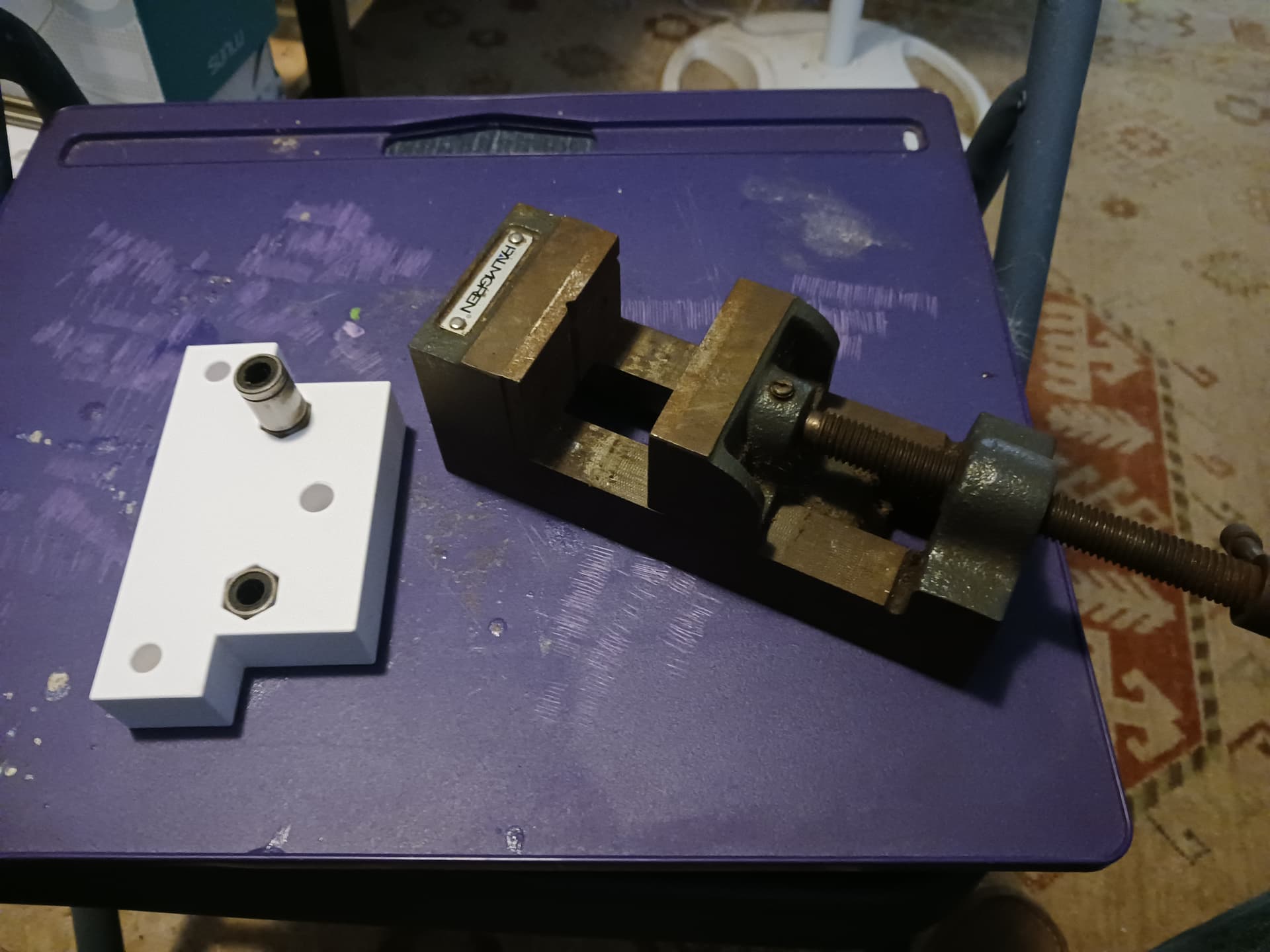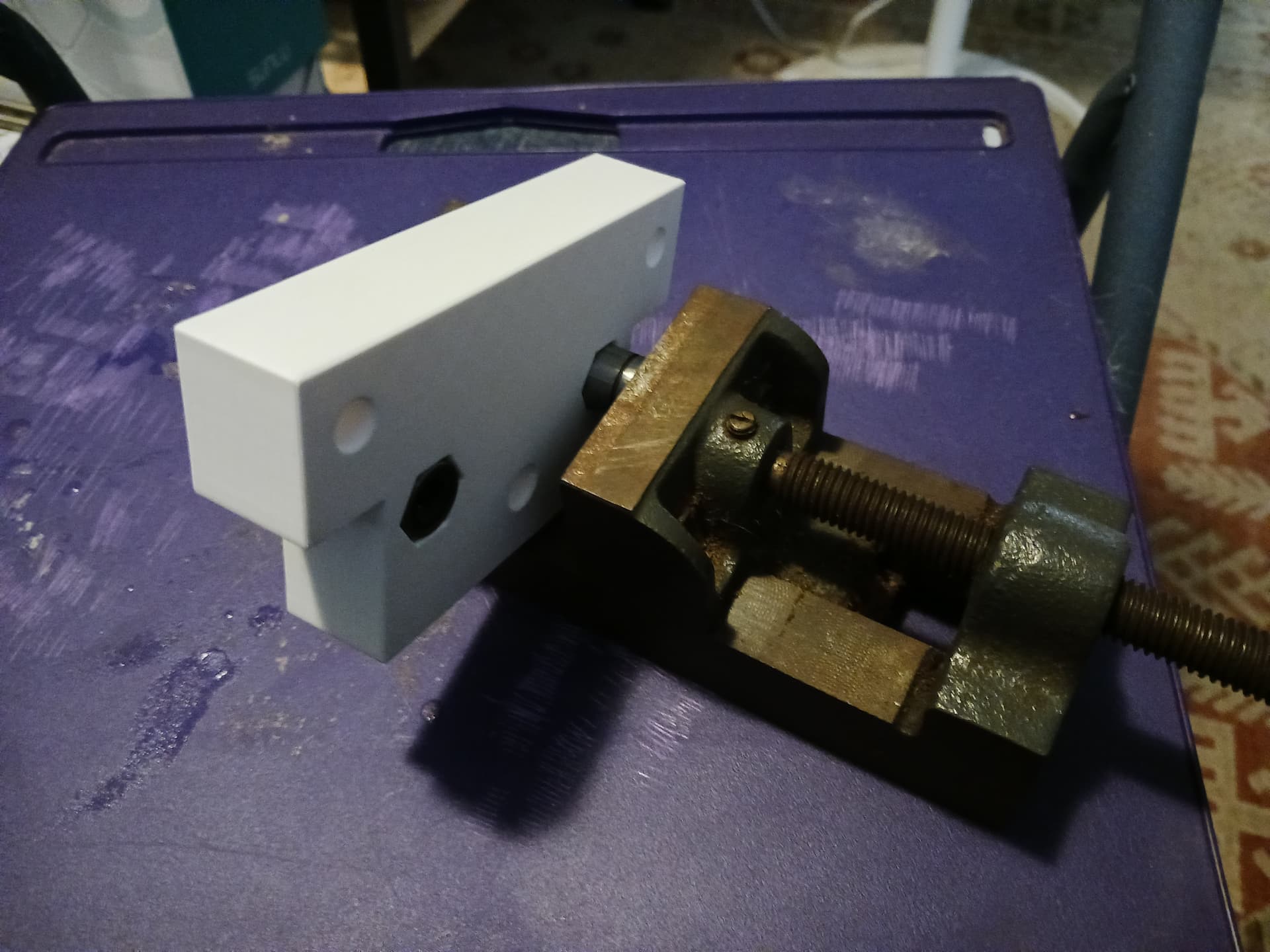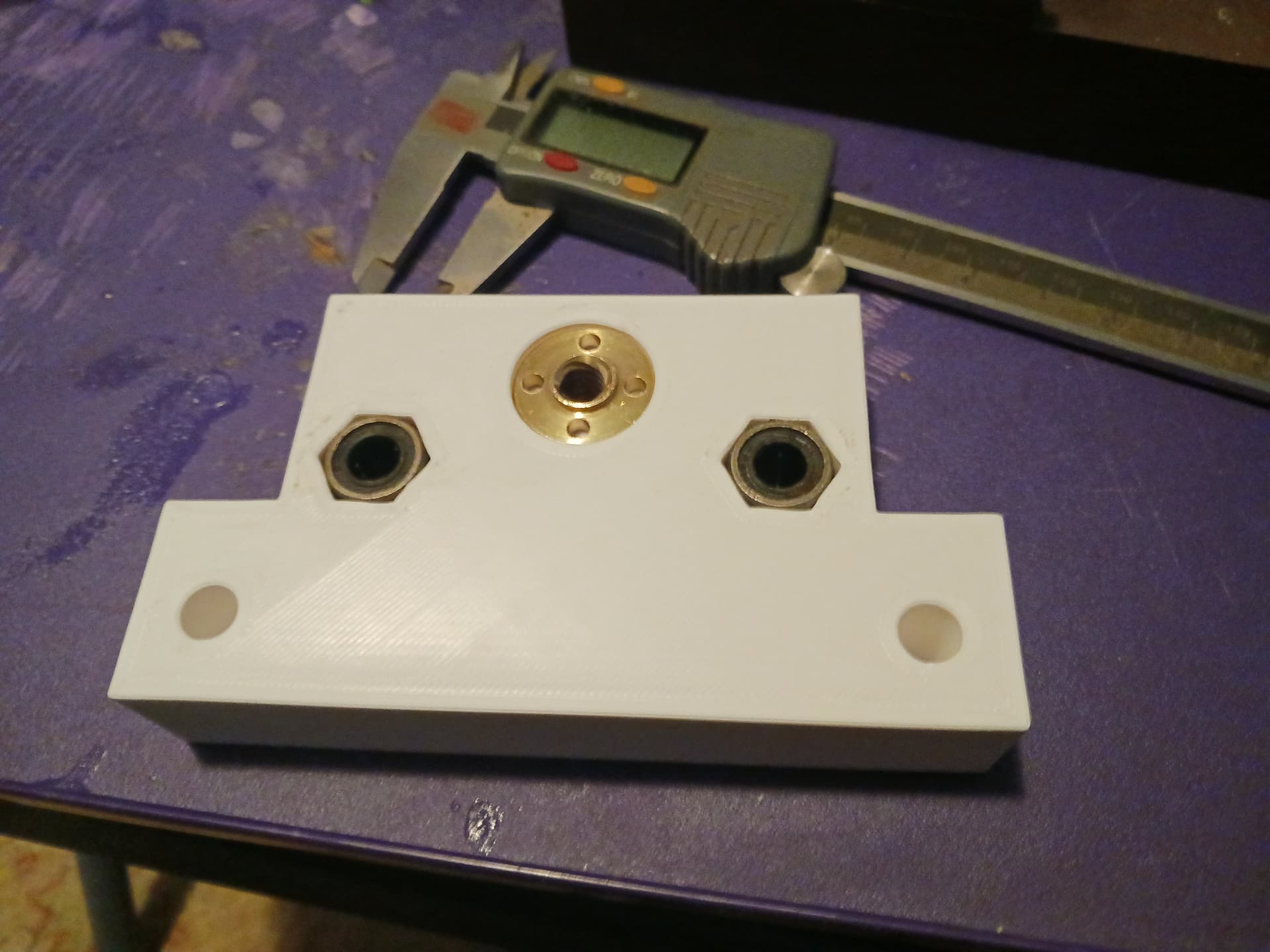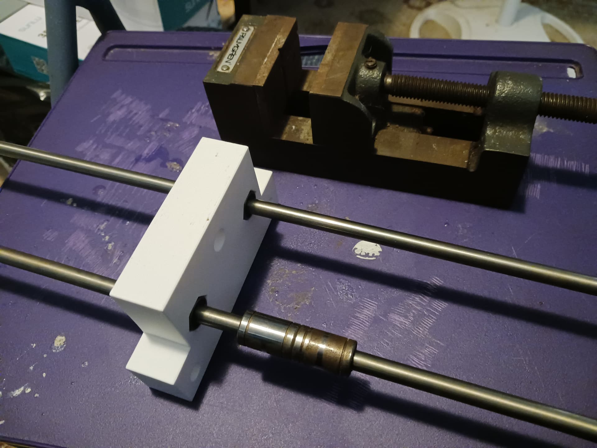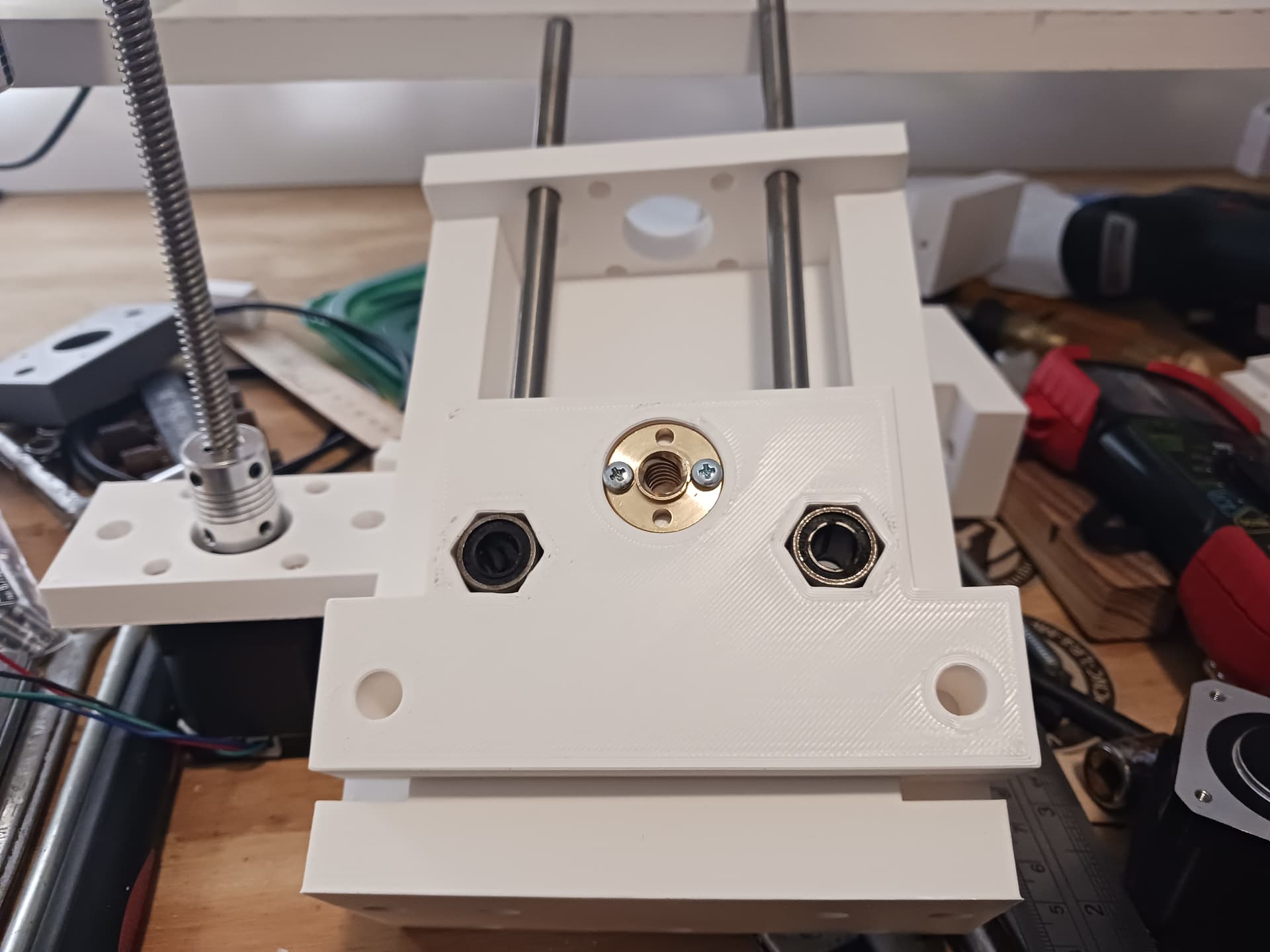 I was able to inset the T8 leadscrew nut and press-fit the LM8UU linear bearings into a new lift block with my bench vise.