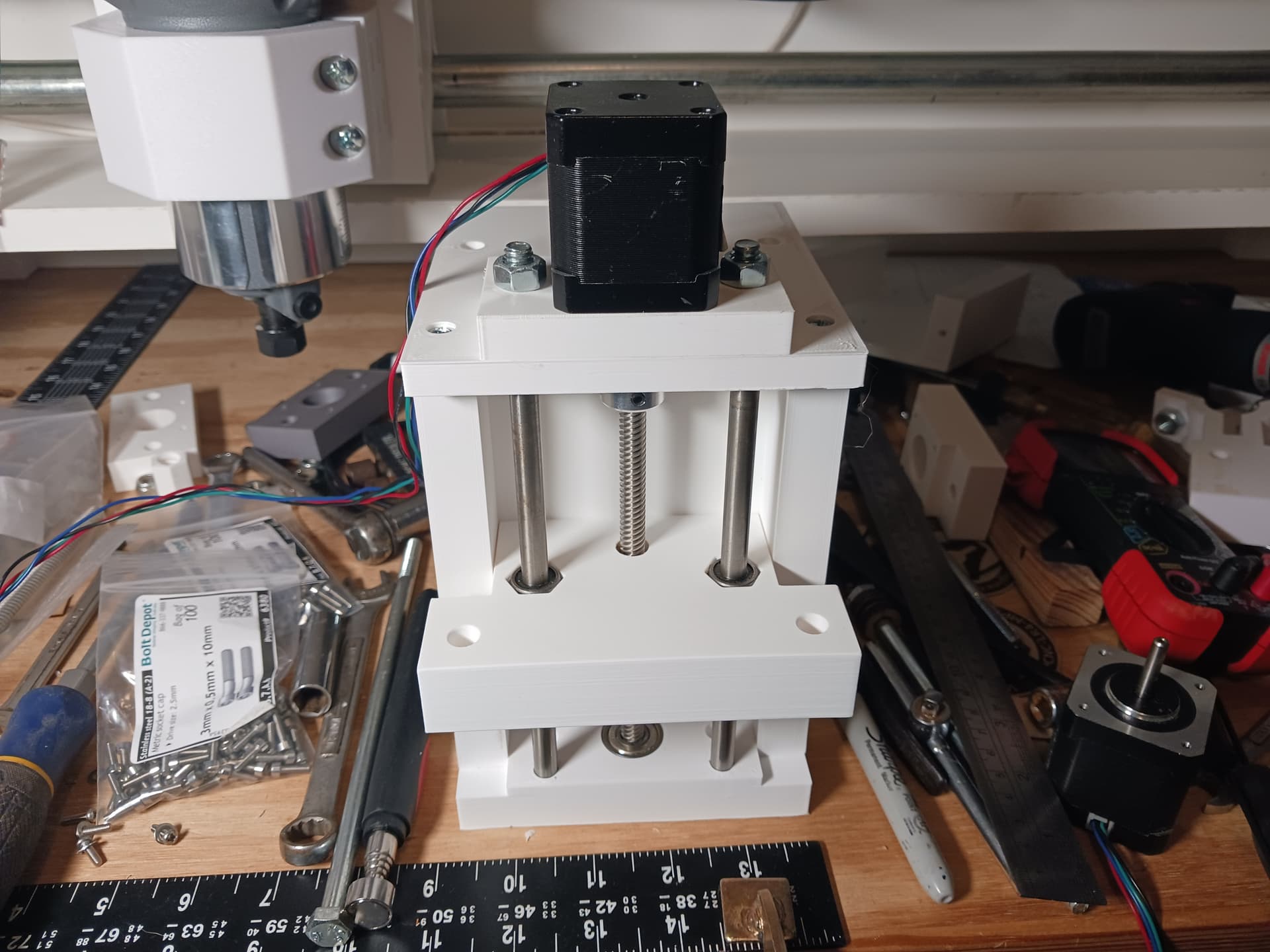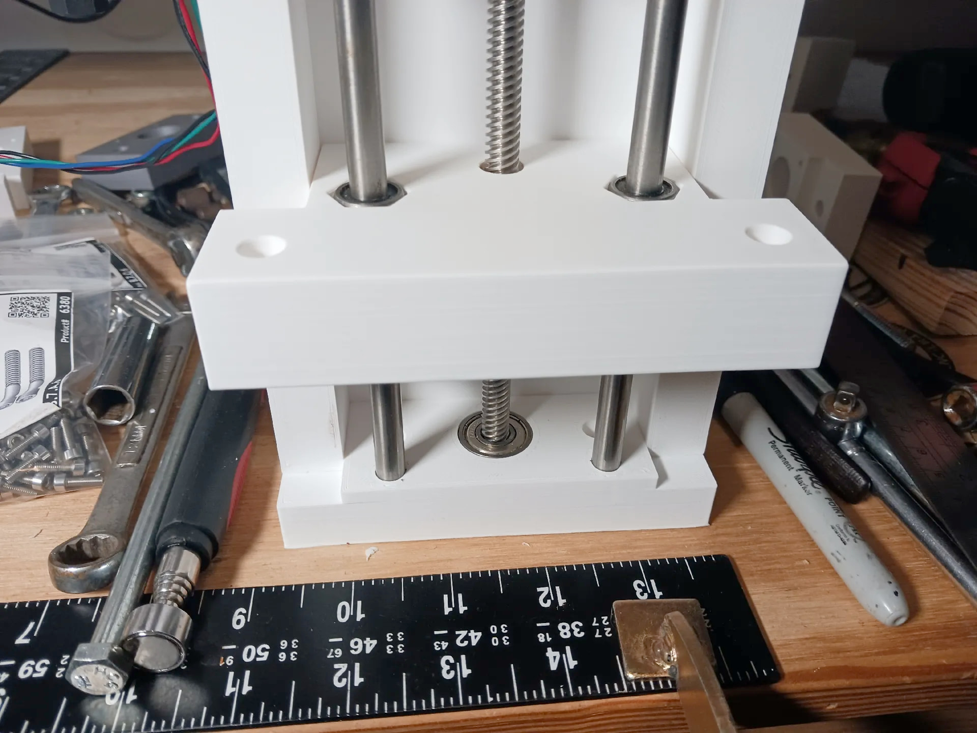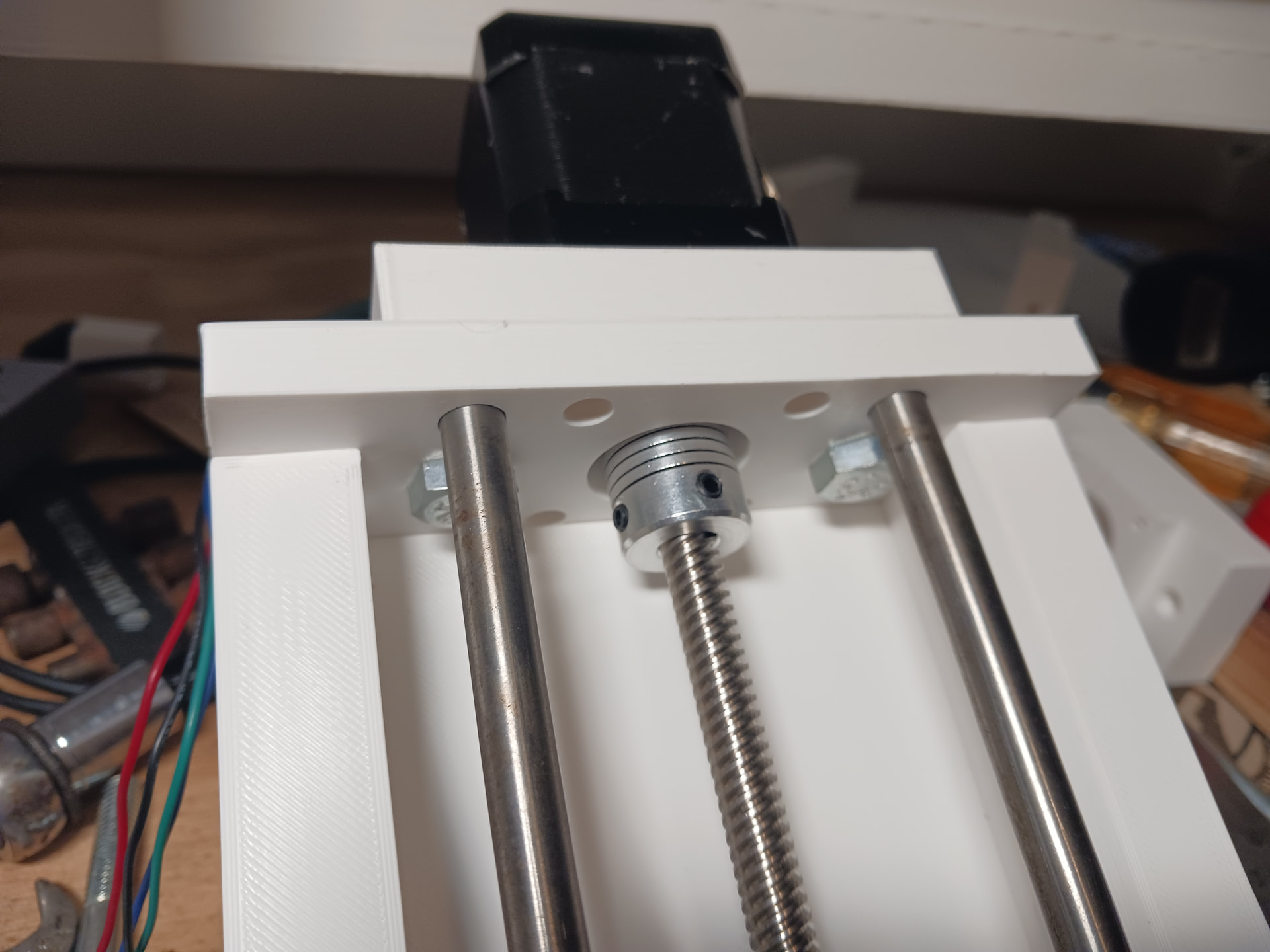 Actually, when using the smooth rods and linear bearings scrounged from an old 3d printer, it practically āforcedā the design into a more stable ā3-point stanceā⦠with the leadscrew and guide rods now offset from one another (thereās probably a reason linemen in American football get into a 3-point stance⦠reckon?).