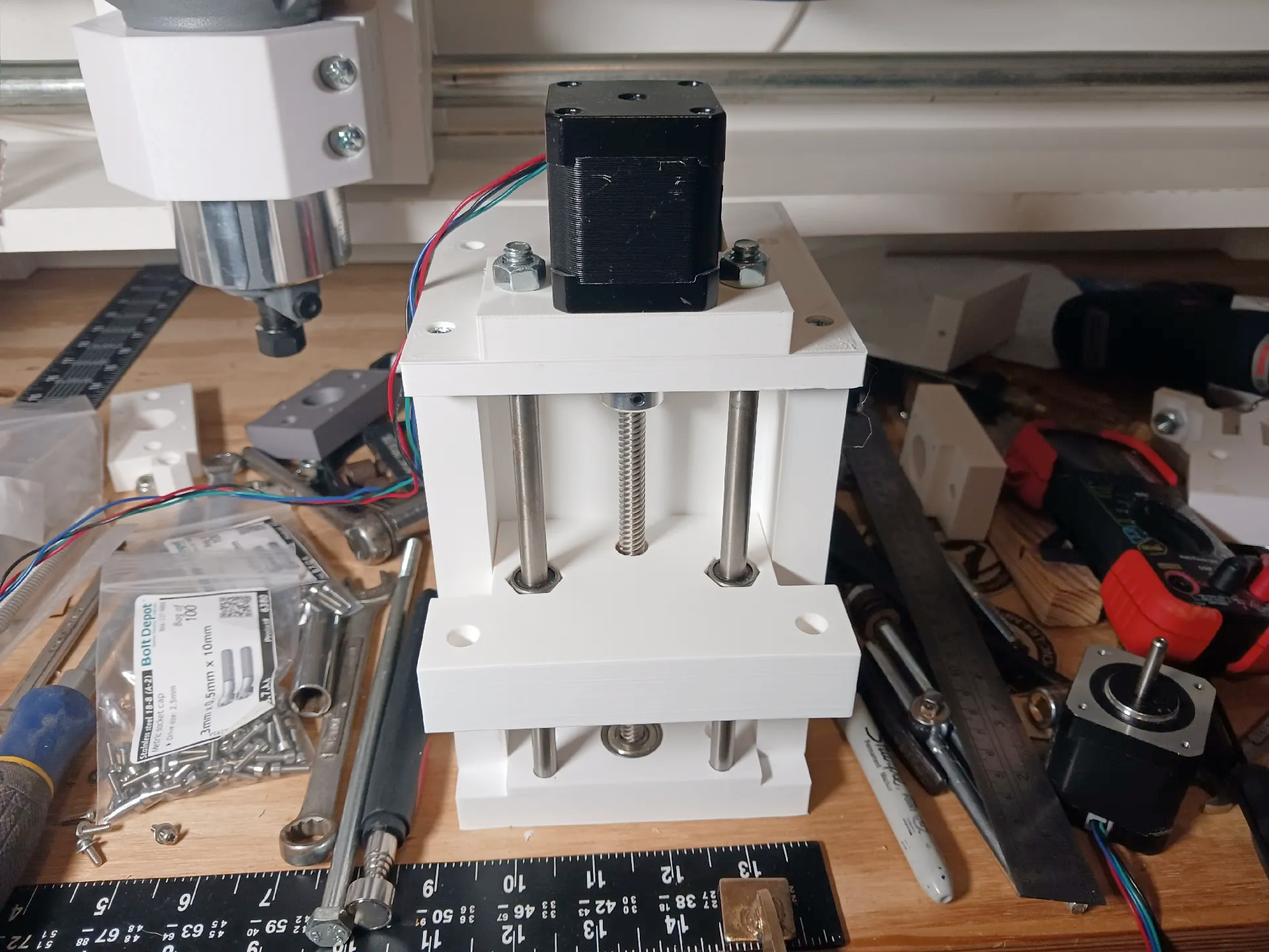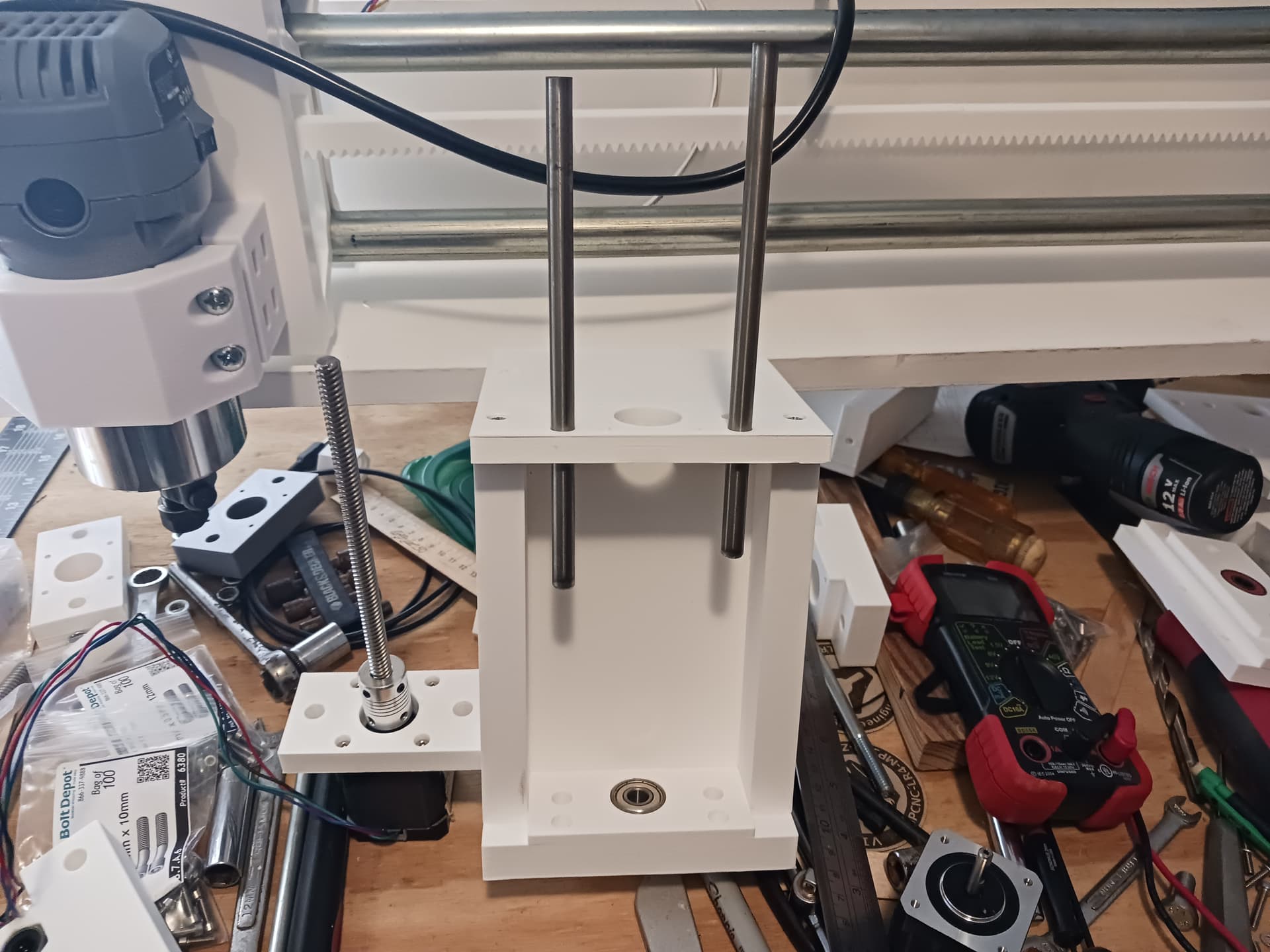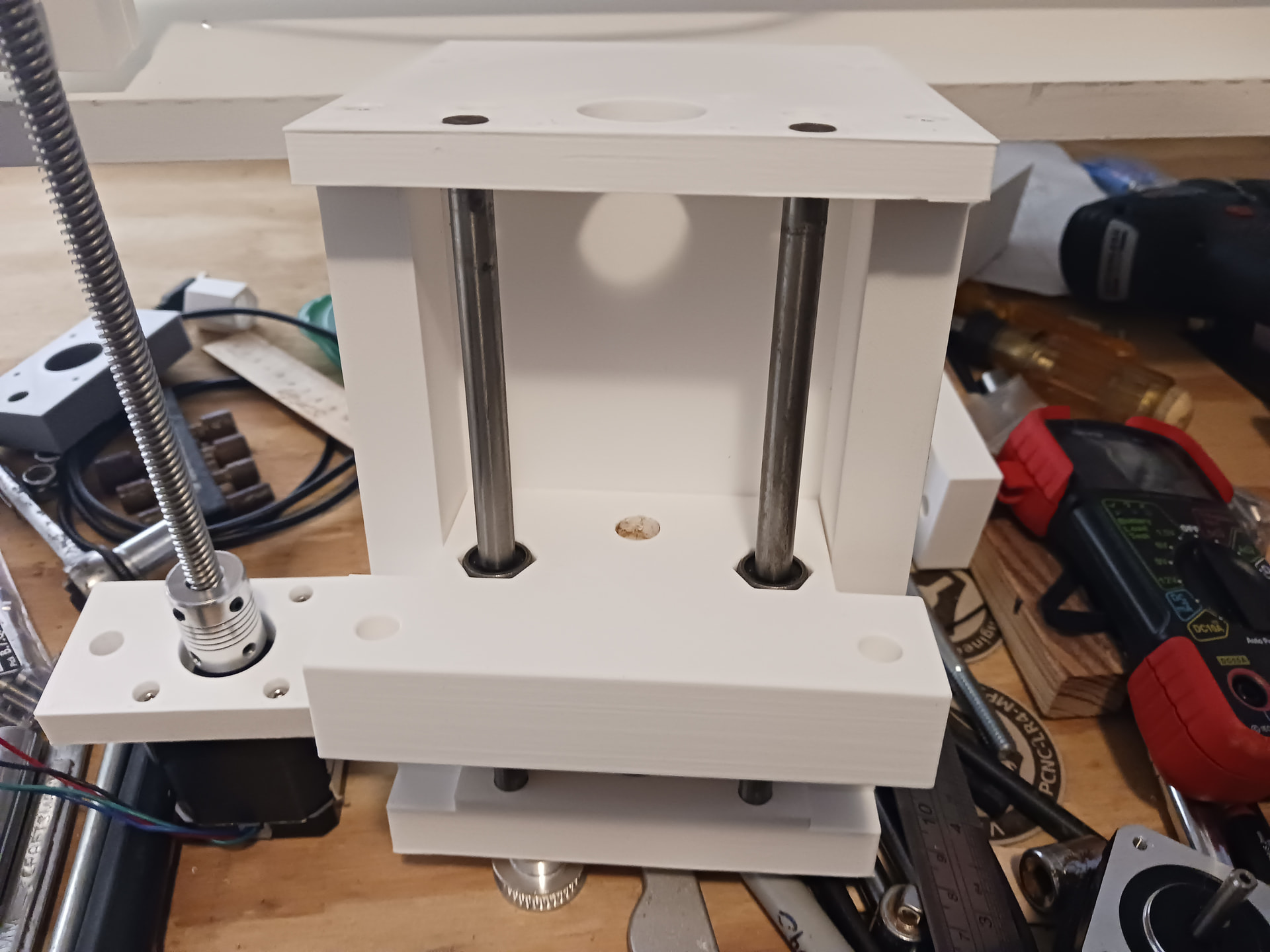 Actually, when using the smooth rods and linear bearings scrounged from an old 3d printer, it practically āforcedā the design into a more stable ā3-point stanceā⦠with the leadscrew and guide rods now offset from one another (thereās probably a reason linemen in American football get into a 3-point stance⦠reckon?).