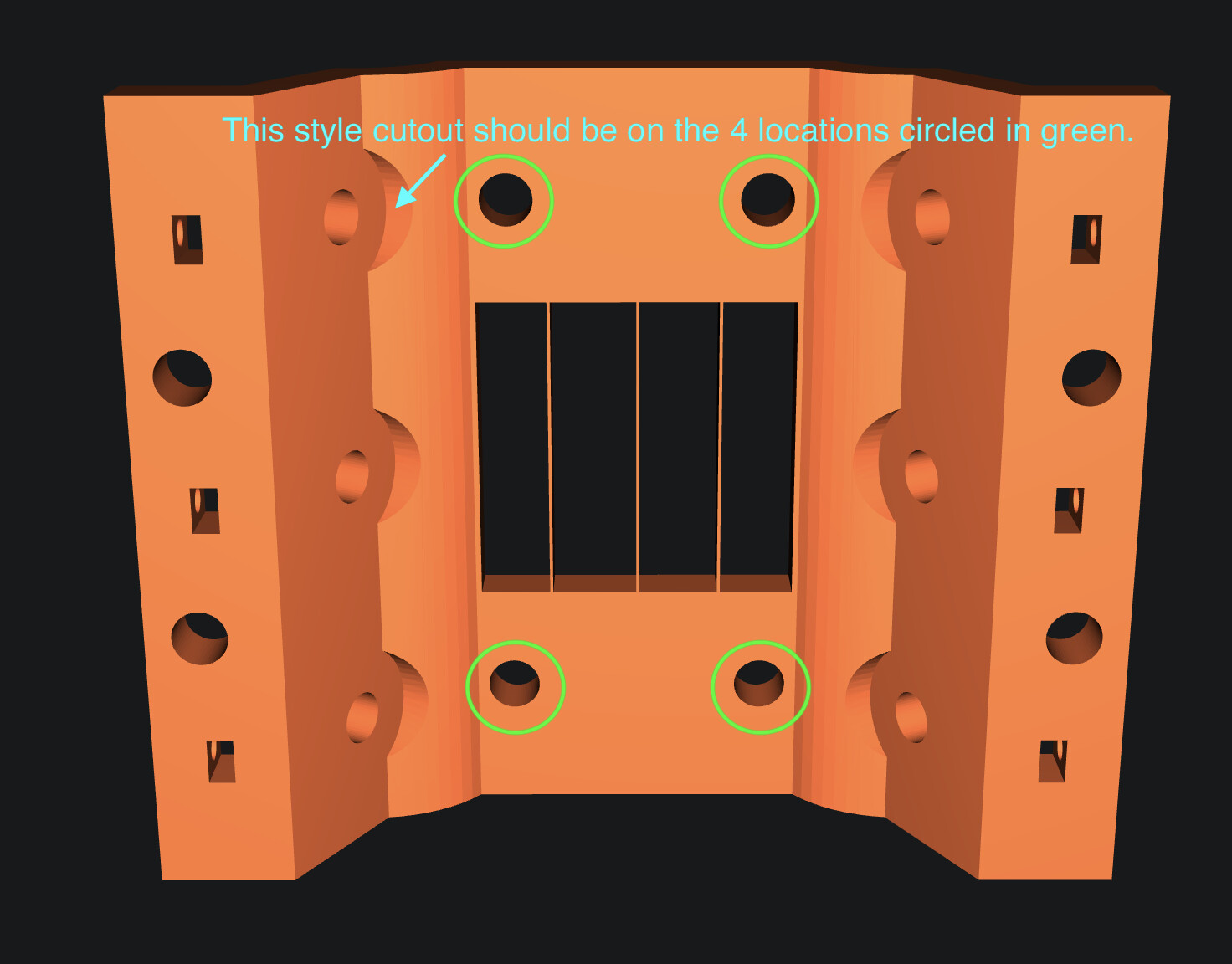 Hereās what I meant about the location for a bolt head clearance cutout. If I remix it Iām going to recess the green areas about 1mm into the part