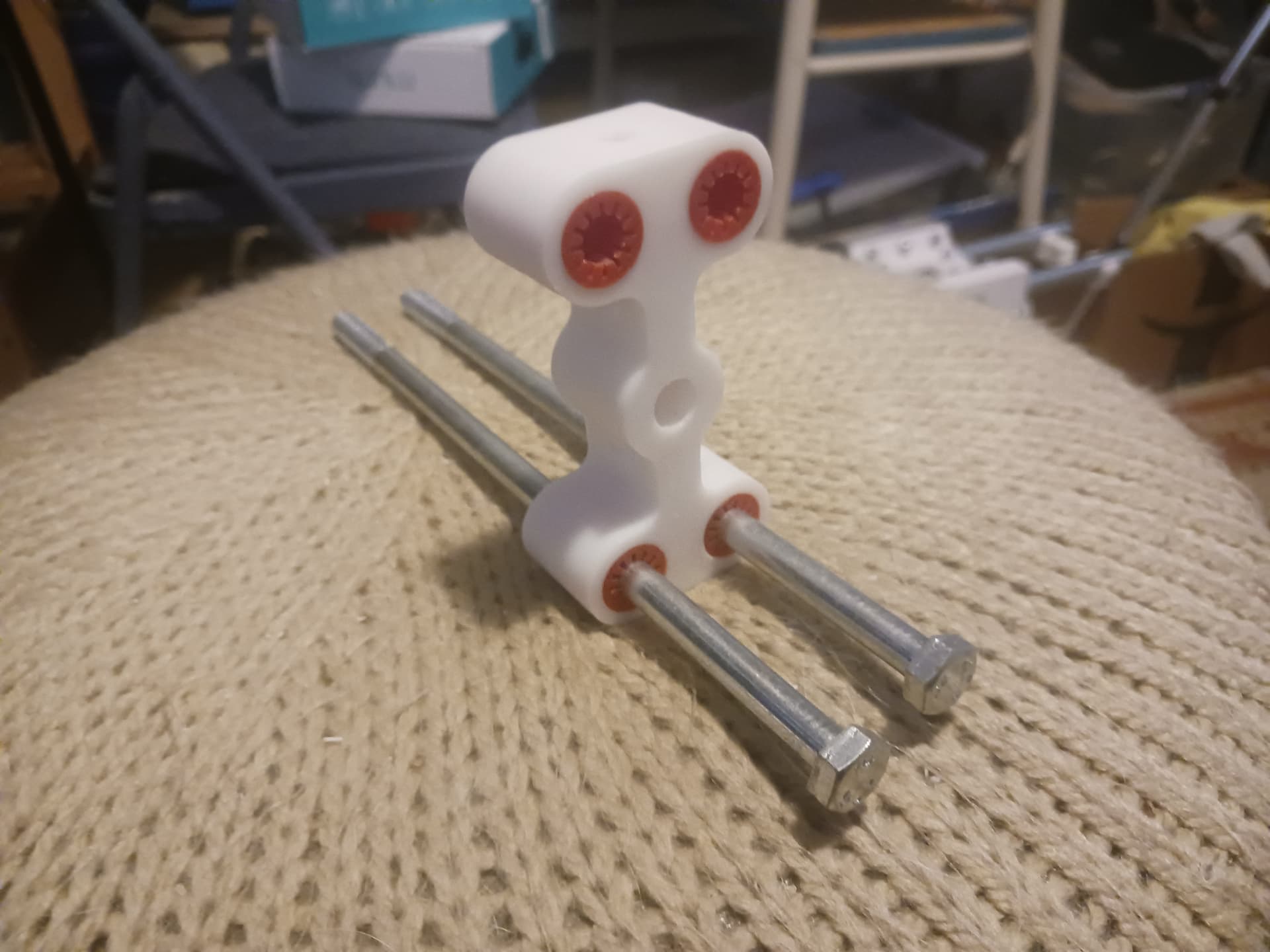 Test of guide-rod MPR&P Z-lift system, lifting 2 new 1kg rolls of filament and a granite slab ā about 16 lbs total ā over 125mm range at 1500 mm/min. Printed PLA+ leadscrew/ānutā and linear ābearingsā running on common big box store 5/16" x 8" smooth-shank hex bolts used as guide rods.