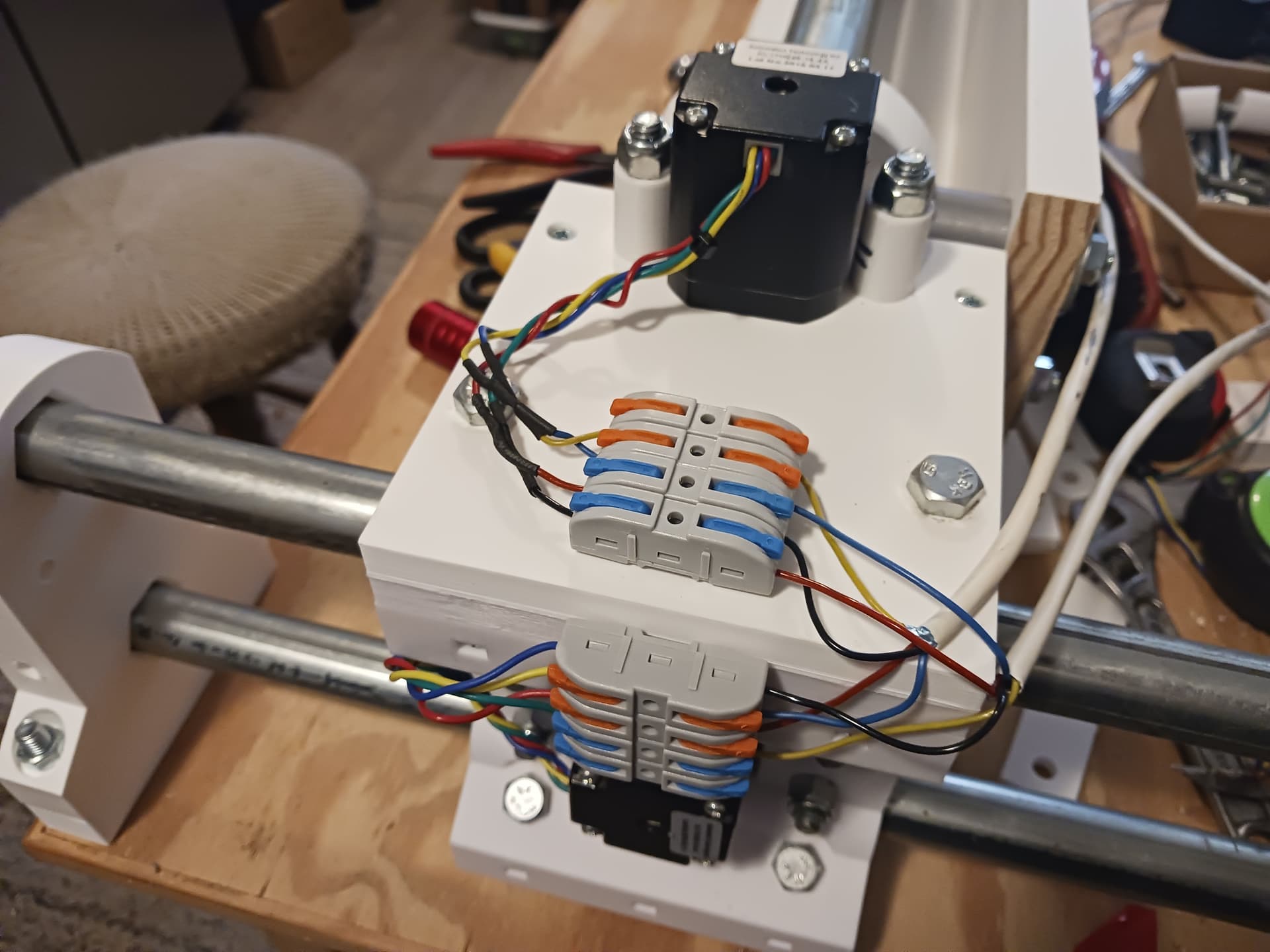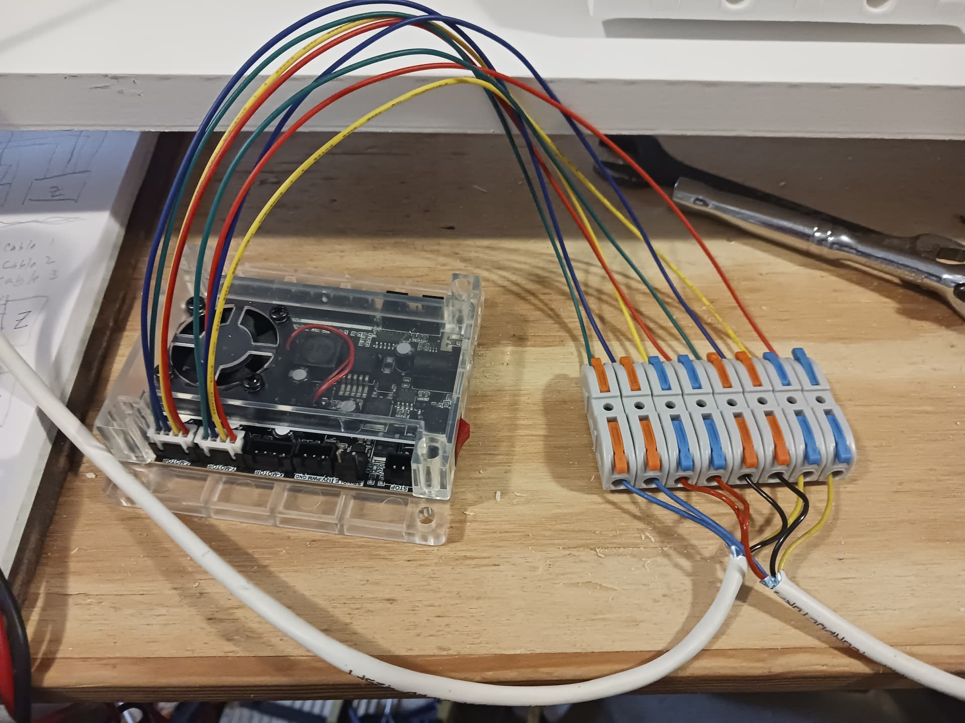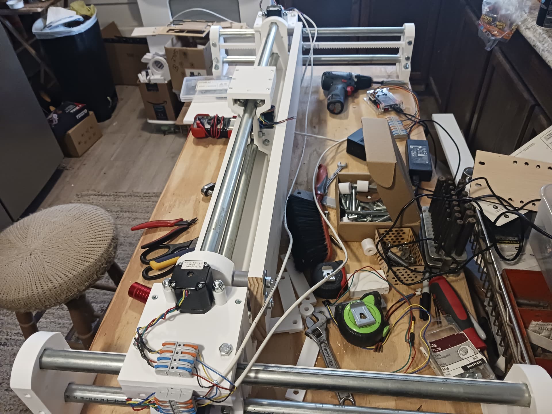 I’ll start wiring in the morning. The controller I’m gonna use is an inexpensive GRBL controller (most often found on 3018 desktop CNC machines) with three integrated A4988/DRV8825(?) drivers that I’ve used on several projects before. I did have to up the reference voltage to just over 0.7 volts and the steppers were connected in series… and that’s was enough to do the 16 lb lifting exercise in my last video.