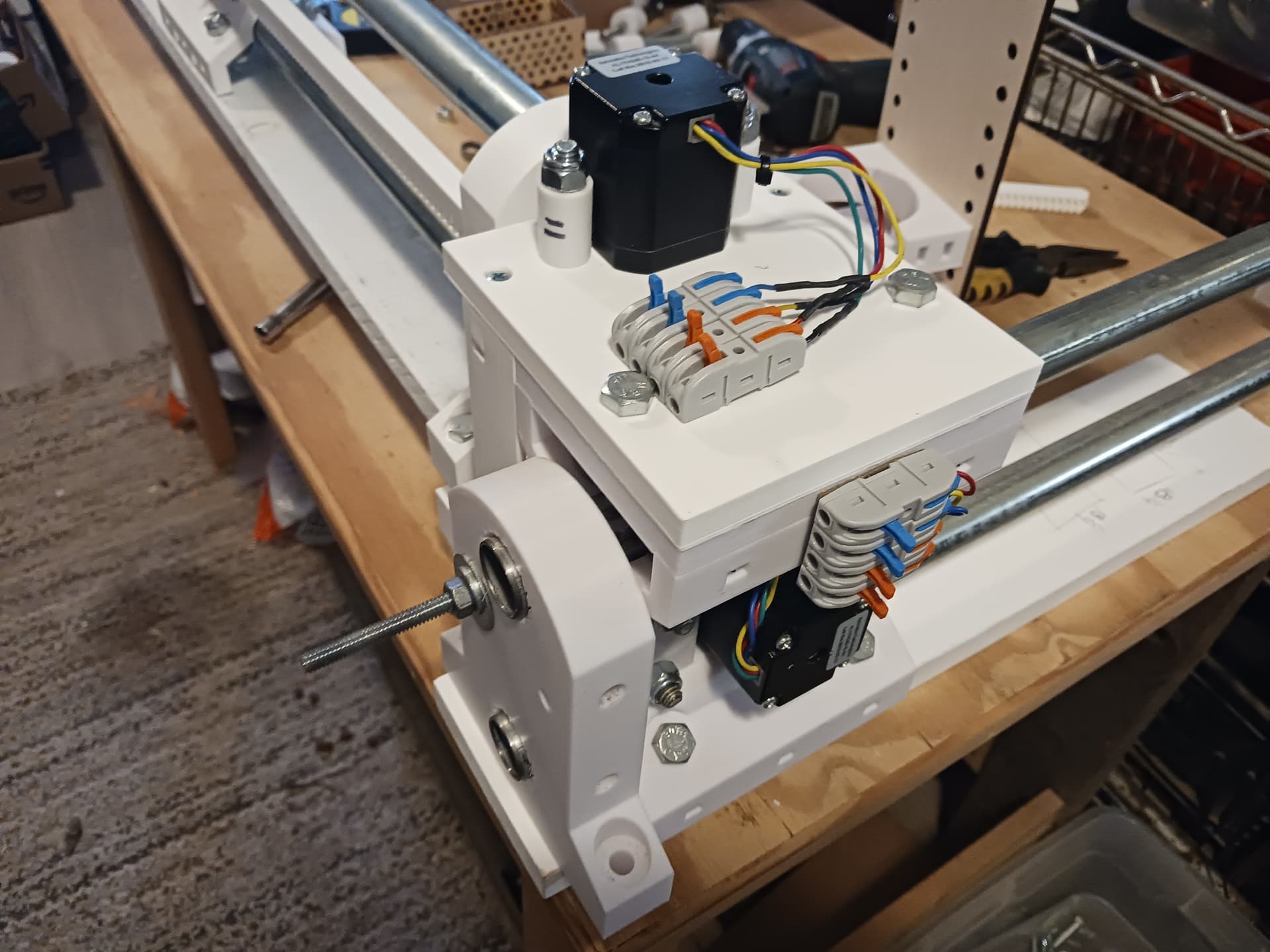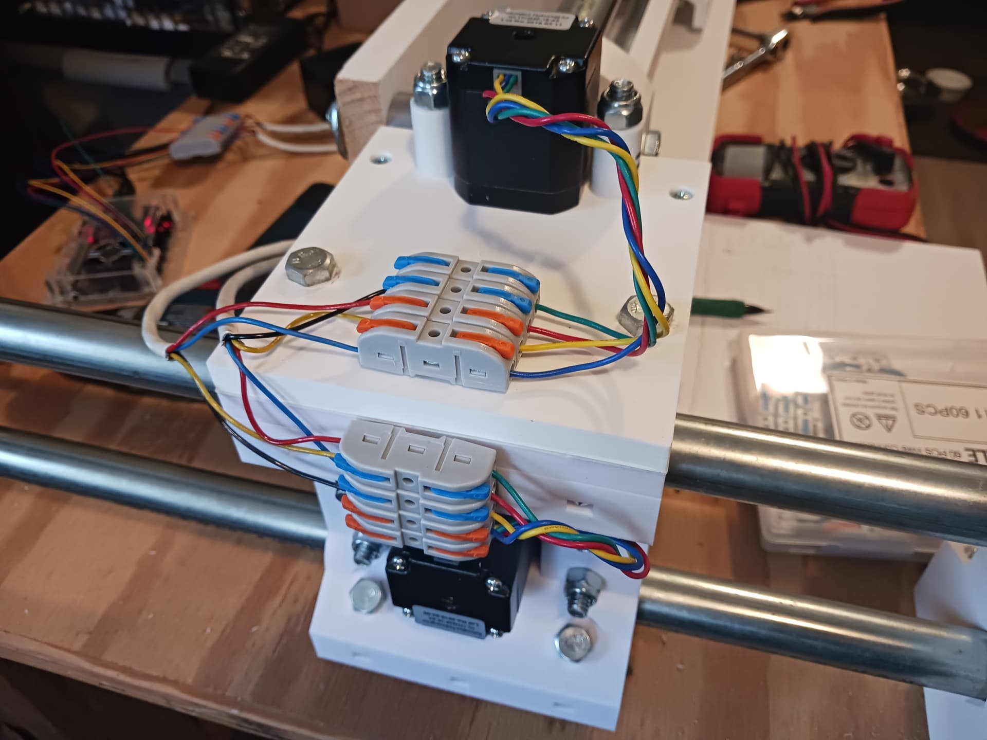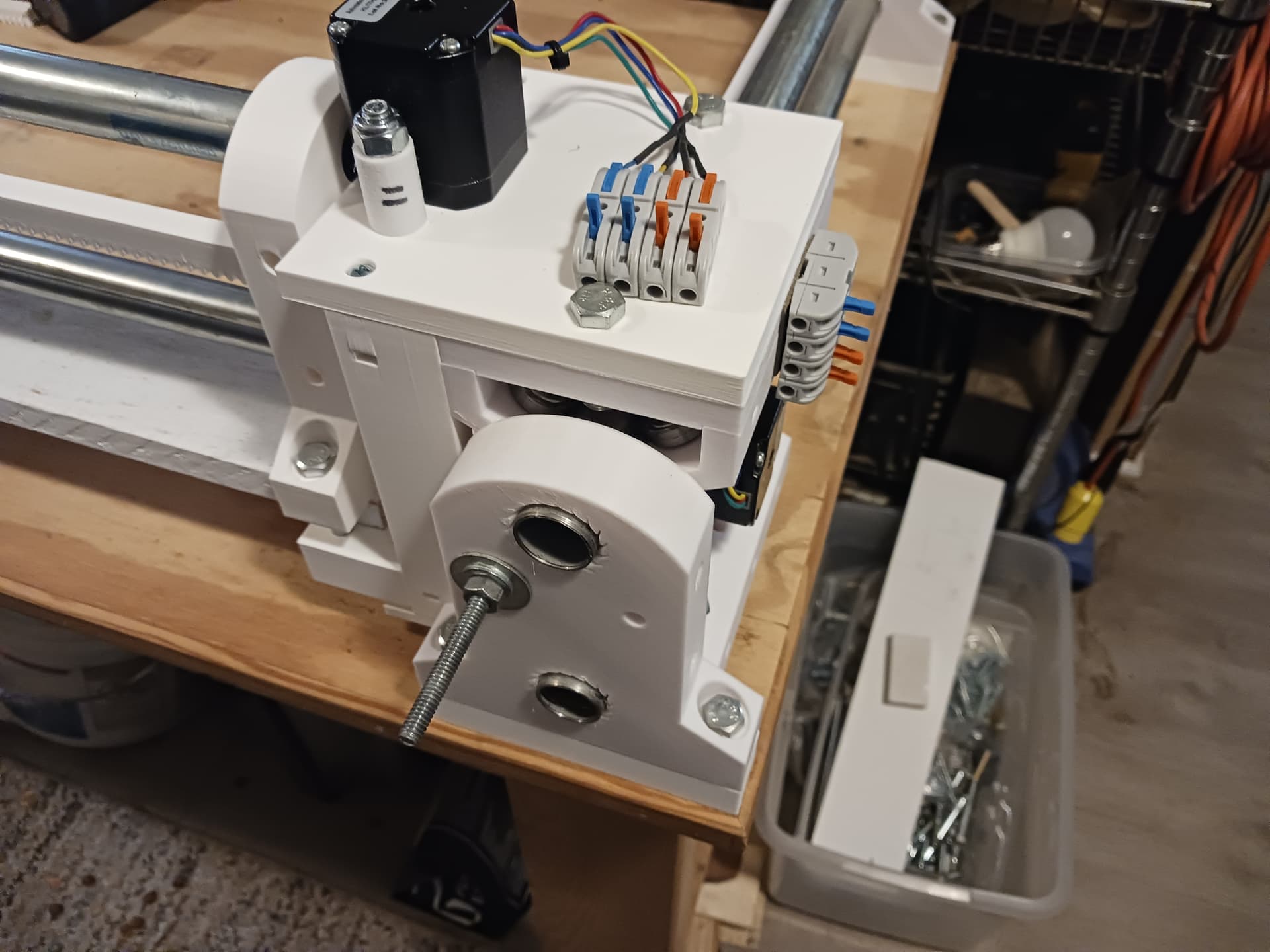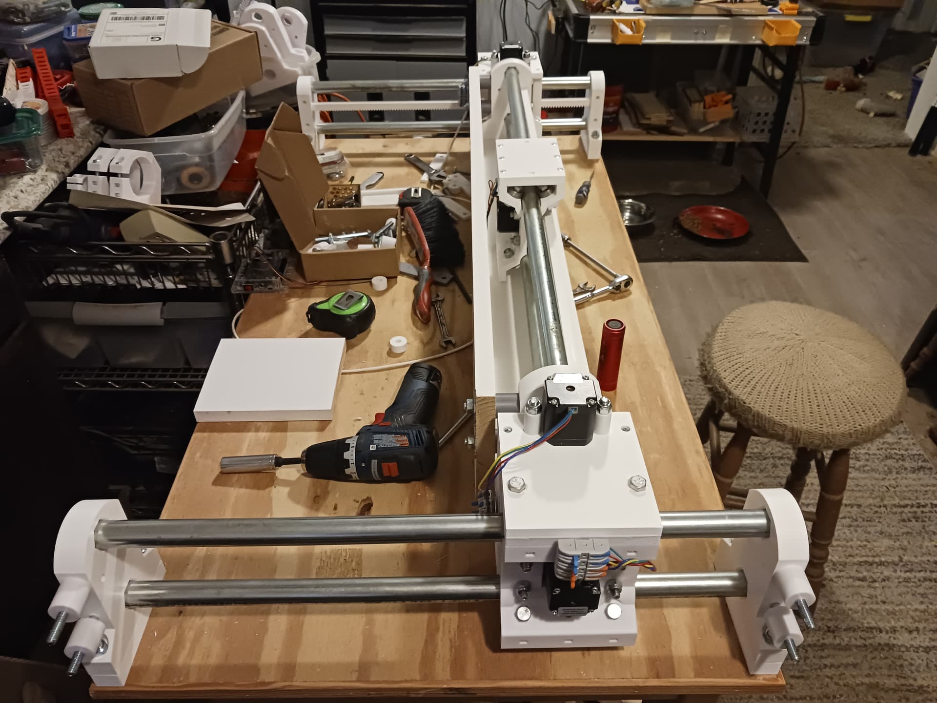I’ll start wiring in the morning. The controller I’m gonna use is an inexpensive GRBL controller (most often found on 3018 desktop CNC machines) with three integrated A4988/DRV8825(?) drivers that I’ve used on several projects before. I did have to up the reference voltage to just over 0.7 volts and the steppers were connected in series… and that’s was enough to do the 16 lb lifting exercise in my last video.