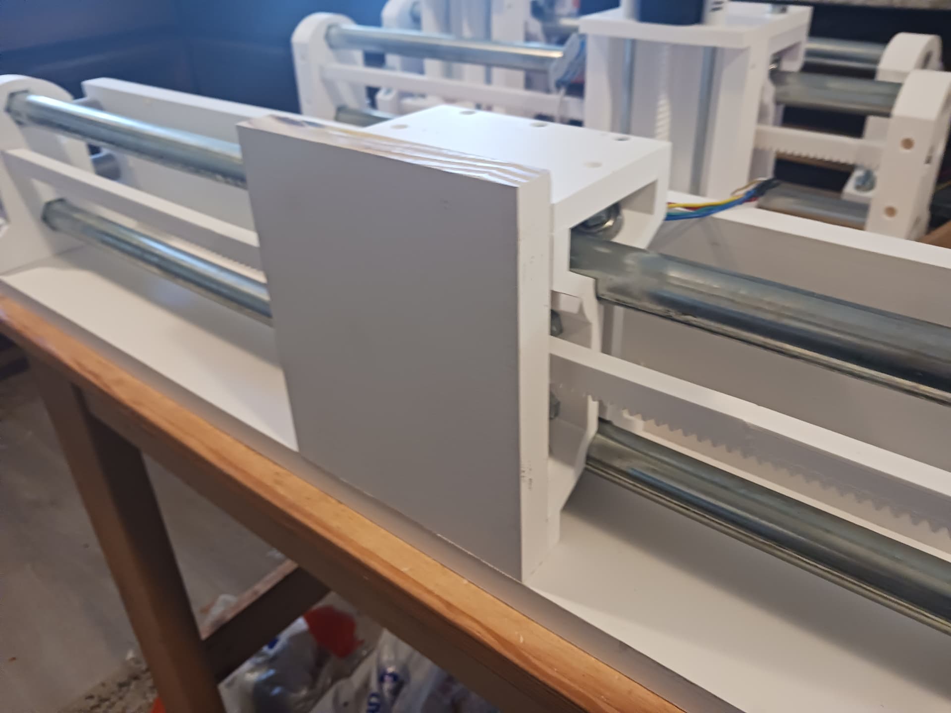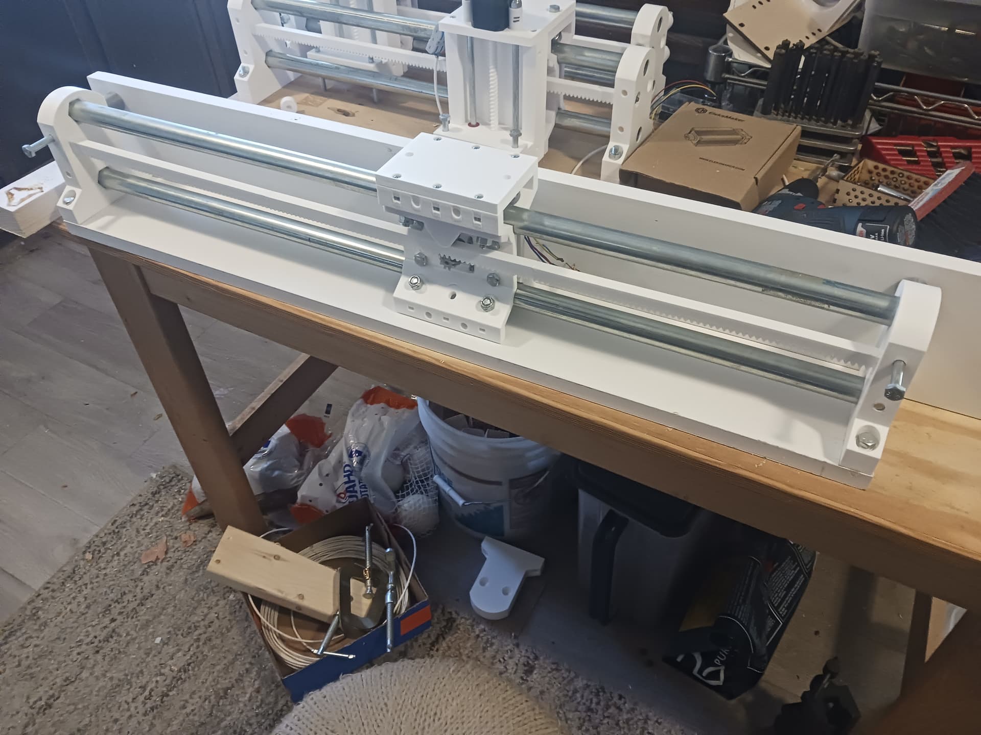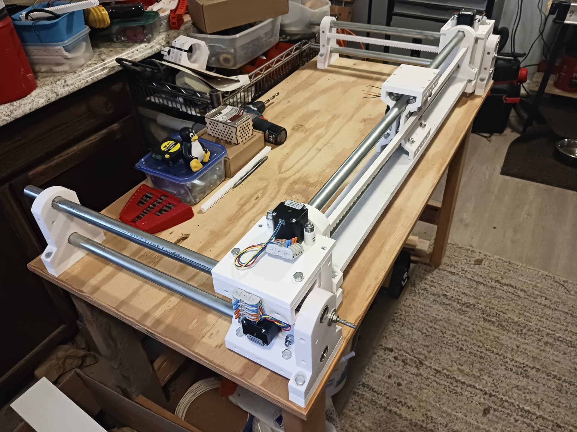 I think that with stiffener panels/boards (that’s a standard 1" x 4" board under the gantry beam… another could go across the back at 90 degrees to the lower one) in place it would be feasible to just buy 5’ joints of conduit and 6’ lengths of 1/4" threaded rod (always used in tension) from the big-box store (I know Lowes carries those…) and print enough rack sections to use the conduit as is, with no cutting… and wind up with close to a 4’ x 4’ cut area.