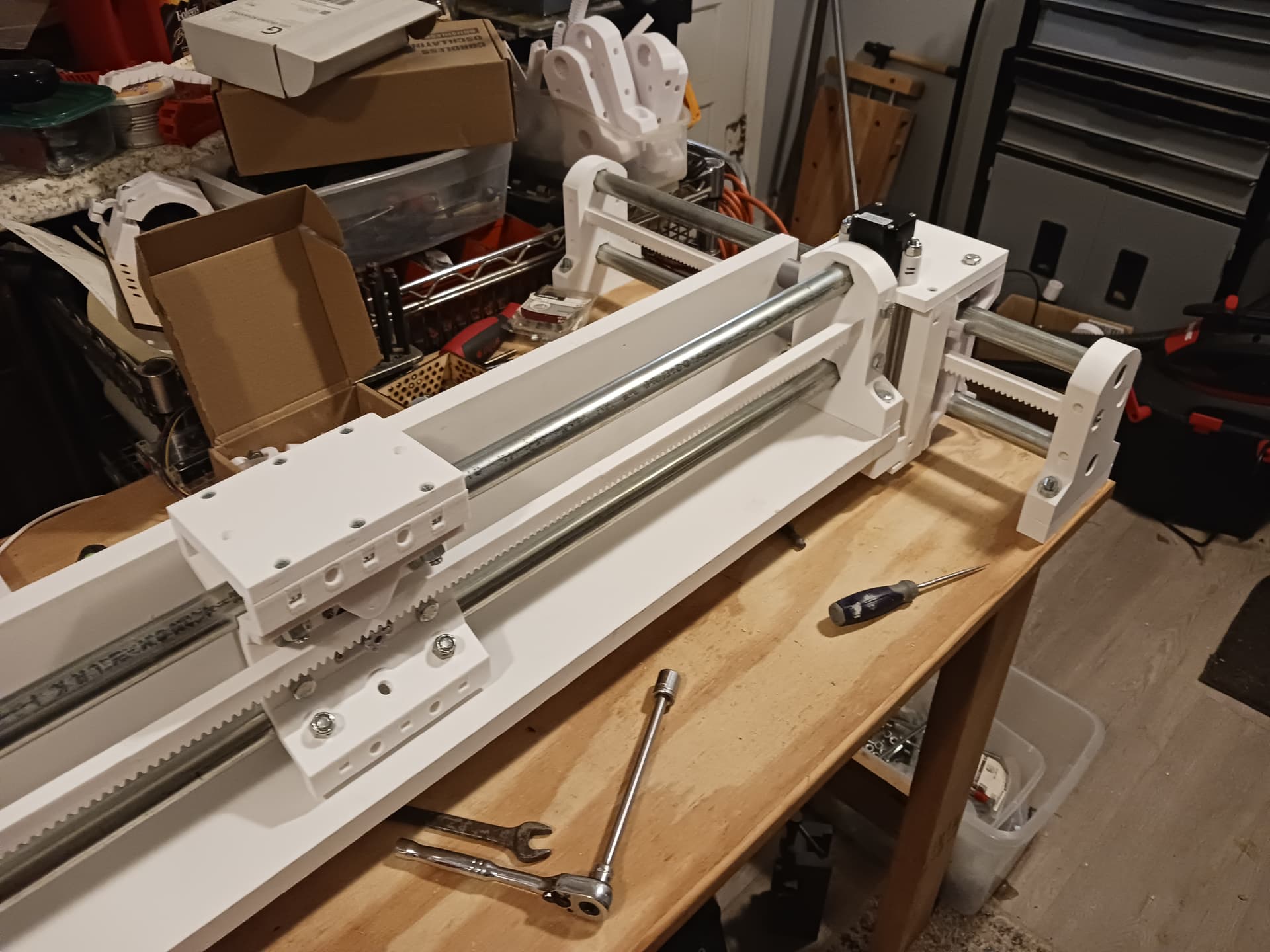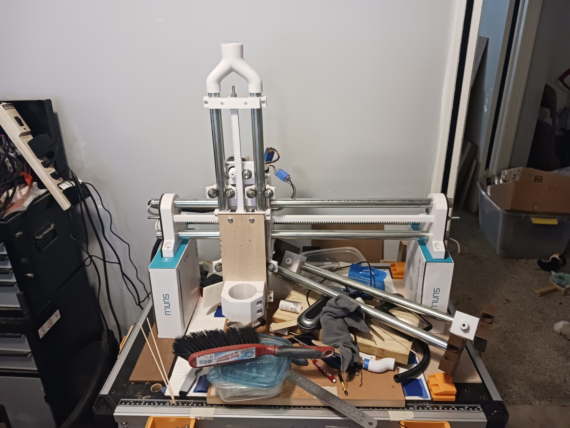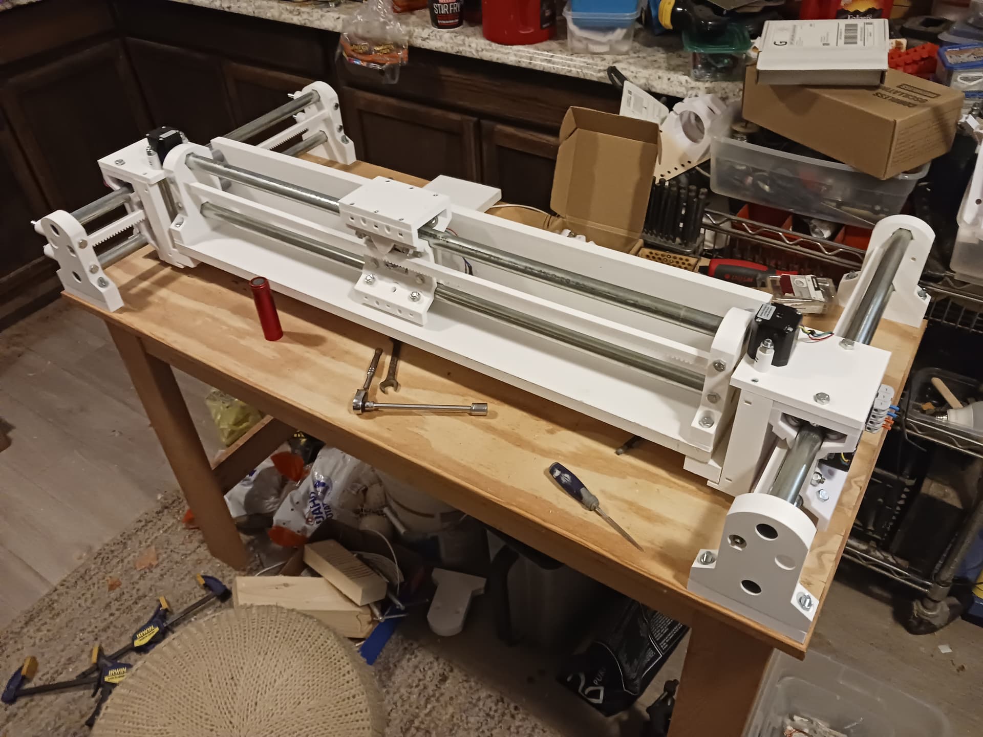 I think that with stiffener panels/boards (that’s a standard 1" x 4" board under the gantry beam… another could go across the back at 90 degrees to the lower one) in place it would be feasible to just buy 5’ joints of conduit and 6’ lengths of 1/4" threaded rod (always used in tension) from the big-box store (I know Lowes carries those…) and print enough rack sections to use the conduit as is, with no cutting… and wind up with close to a 4’ x 4’ cut area.