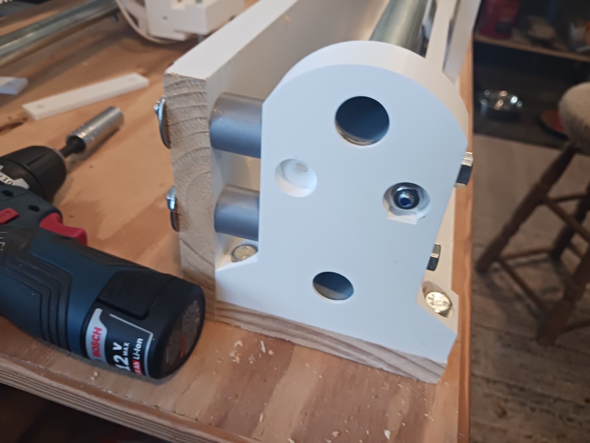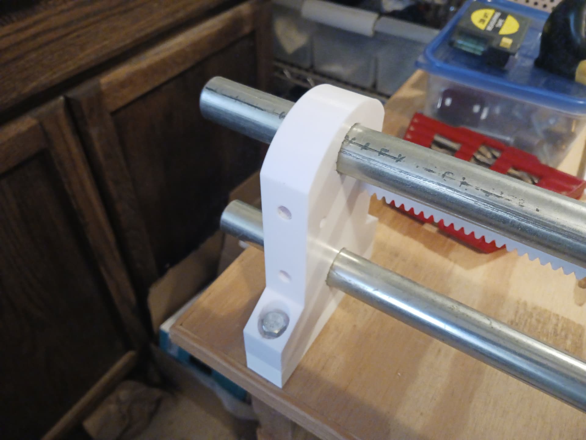As far as supporting these smaller 3/4" EMT rails… attach the bottom and back board stiffeners to form an “angle beam” and put training wheels (bearings) on each corner of the lower “ears” of the carriage that track on the bottom board?