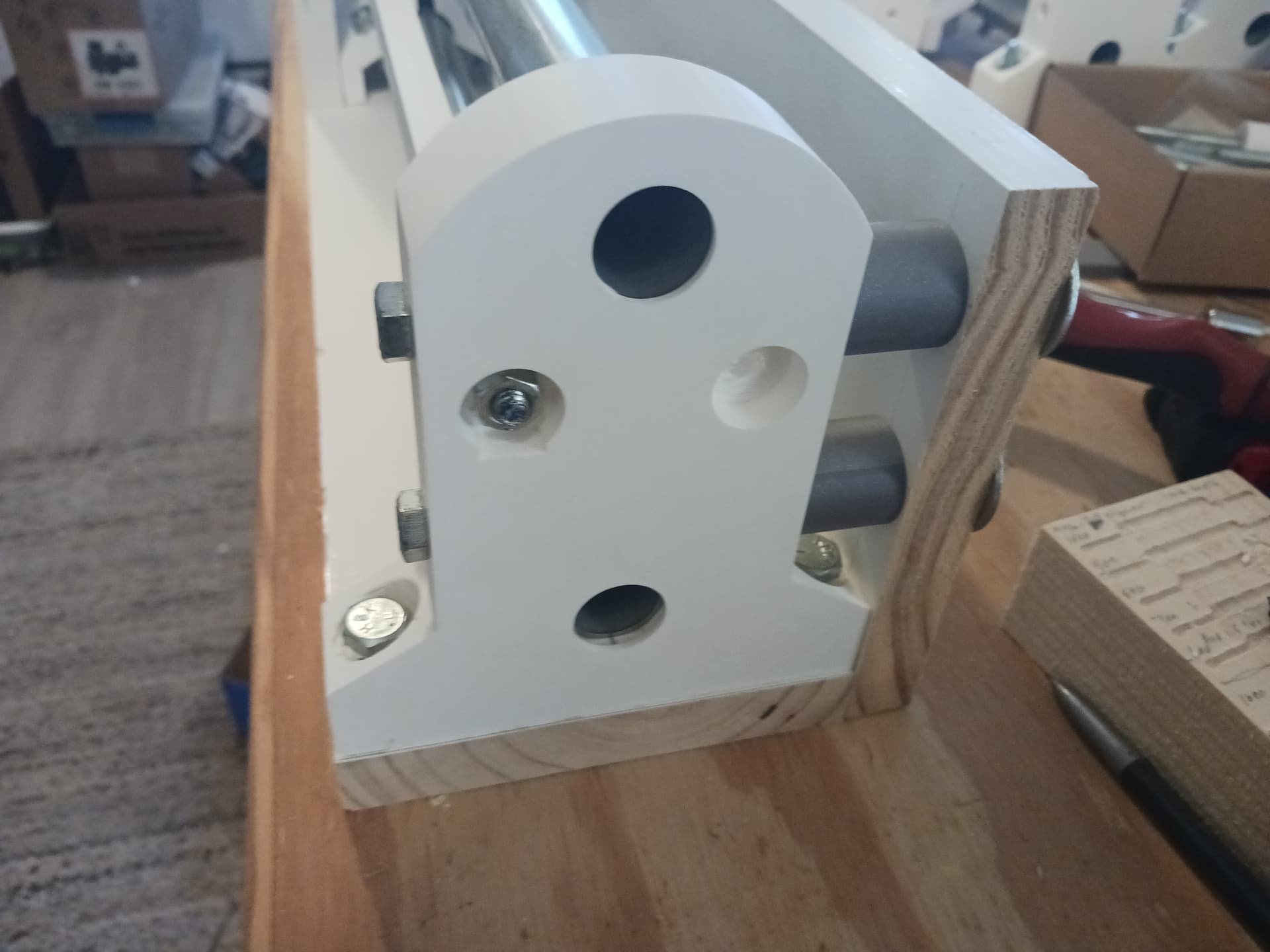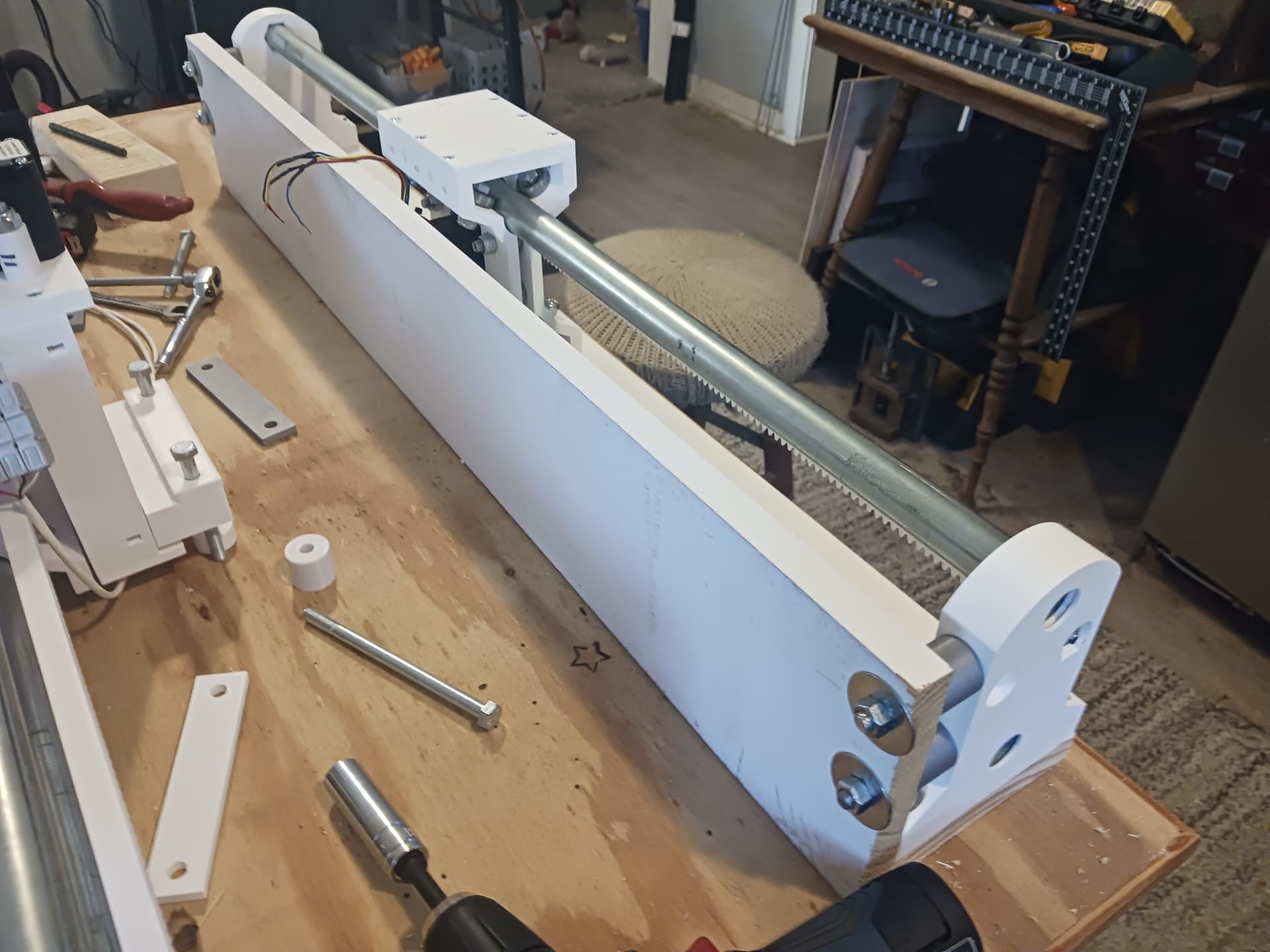 SIL used some very nice pre-finished/primed finger-jointed planks from Lowes during my grand-daughter’s apartment remodel project… and I found a 8-foot 1"x 6" in my scrap pile. Though I had intended to use 5mm ply panels to stiffen the linear stages, I started looking if I might use the “1-by” pre-finished lumber instead… it’s very flat and straight… and it’s already white! It’s already growing on me…