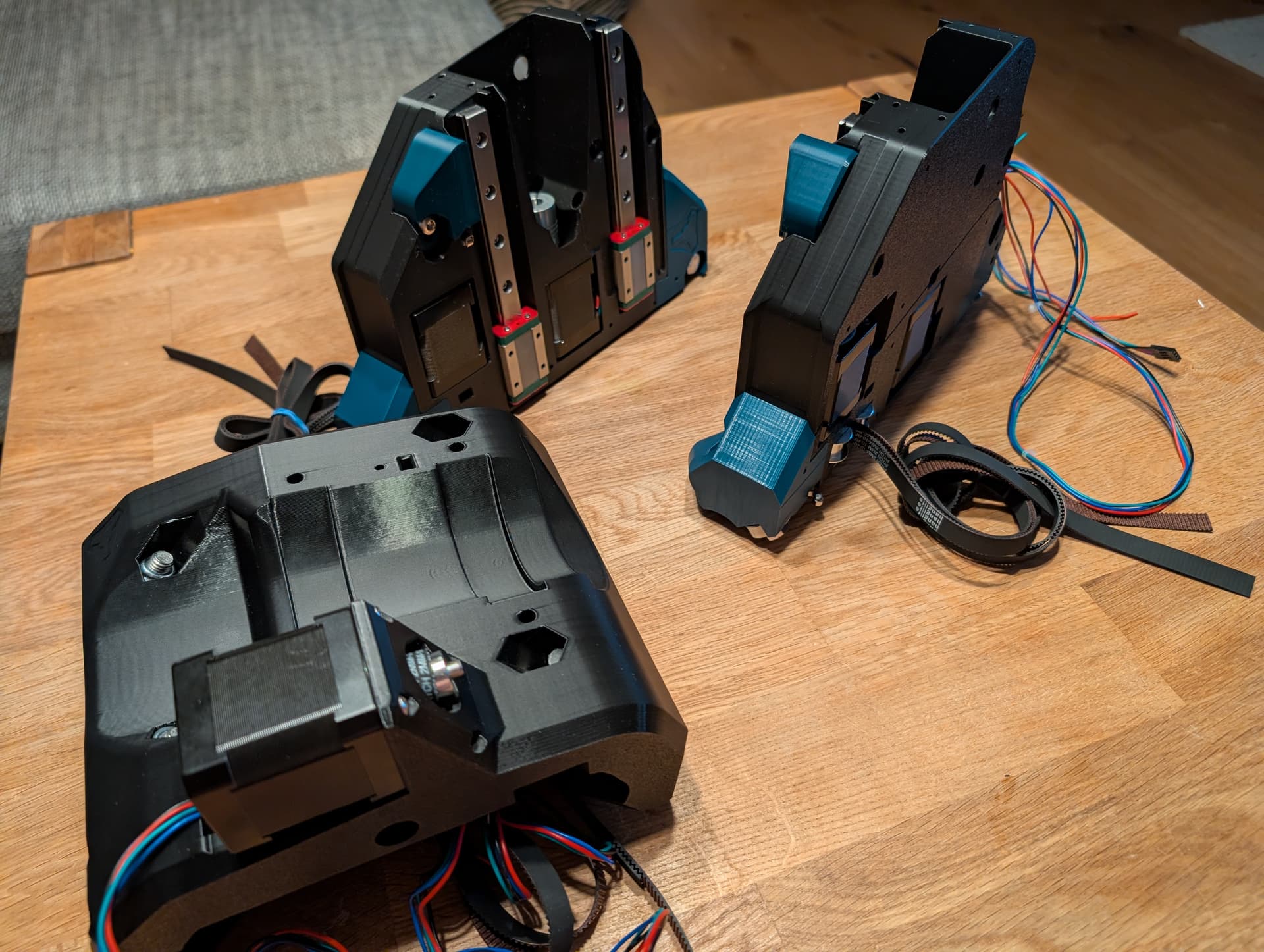 My first attempt to start with CNC is now the Lowrider 4 for a cutting dimension of 650*1250mm to be able to cut half sheets from local stores. I first bought a used mpcnc burly but wanted to build the bigger one after few thoughts. The parts were first printed on my old Artillery Genius but got a Bambu Lab before printing the big parts. I chose black/dark green as I had these filaments already and like the combination. On the pictures it more looks like blue I guess.