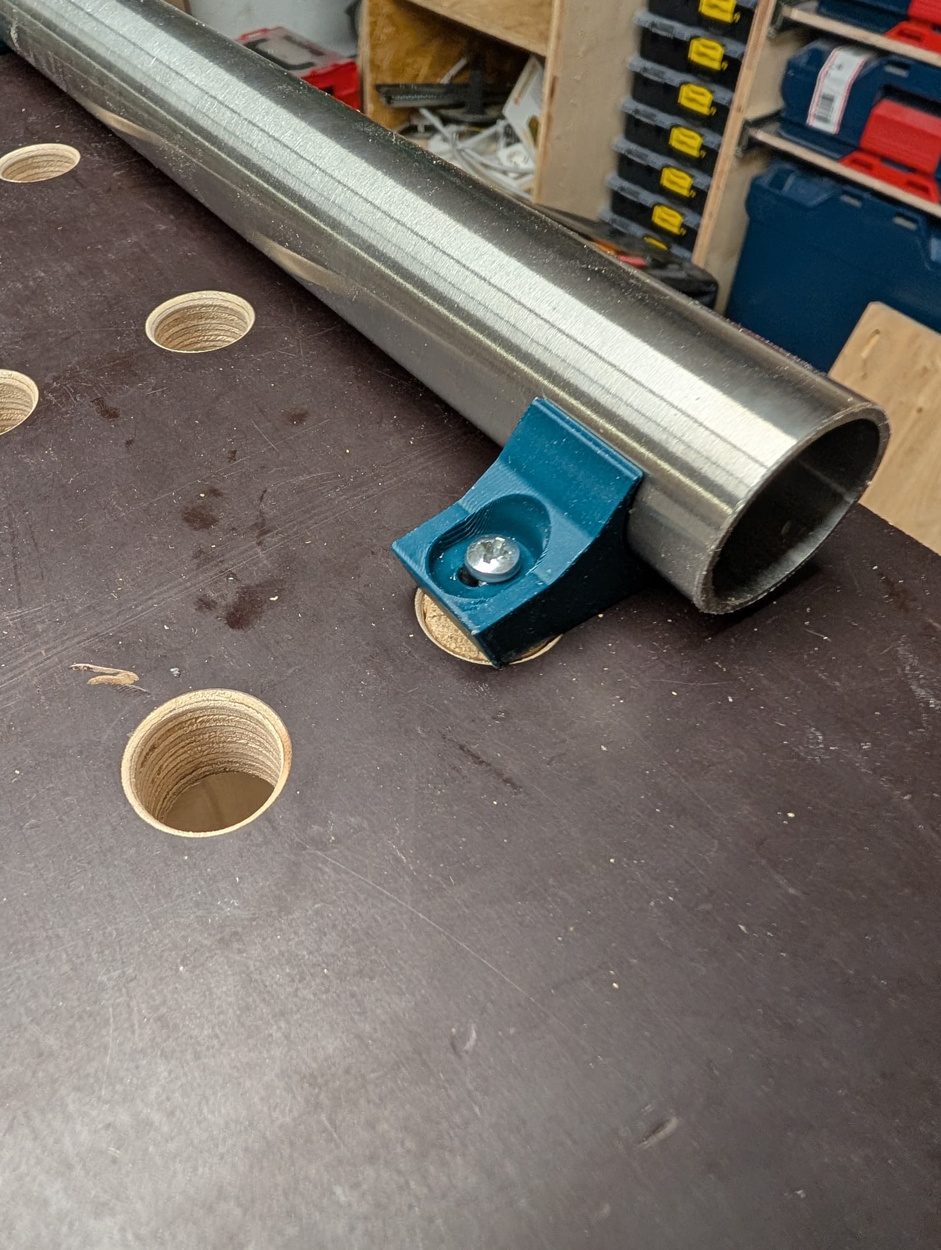 Yes current idea is to use one of my existing tables with the benchdog holes. This is some Kind of prototype and I would construct and print plastic parts that are safed from below the table