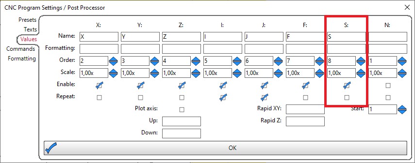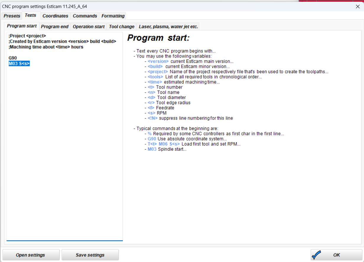 The problem I need to solve is my machine runs on a modified version of marlin. The 1st issue I’m seeing the the way the M3 code is defined in the firmware. In Marlin you turn on spindle with the M03 & M04. The code looks like this M03 S24000; setting to max speed. In the modified version it is turned on M03 P100; 100% of Power. I’ve noticed estlcam set the speed I’m guessing by RPM and I need it to come out from a scale of 1 - 100.