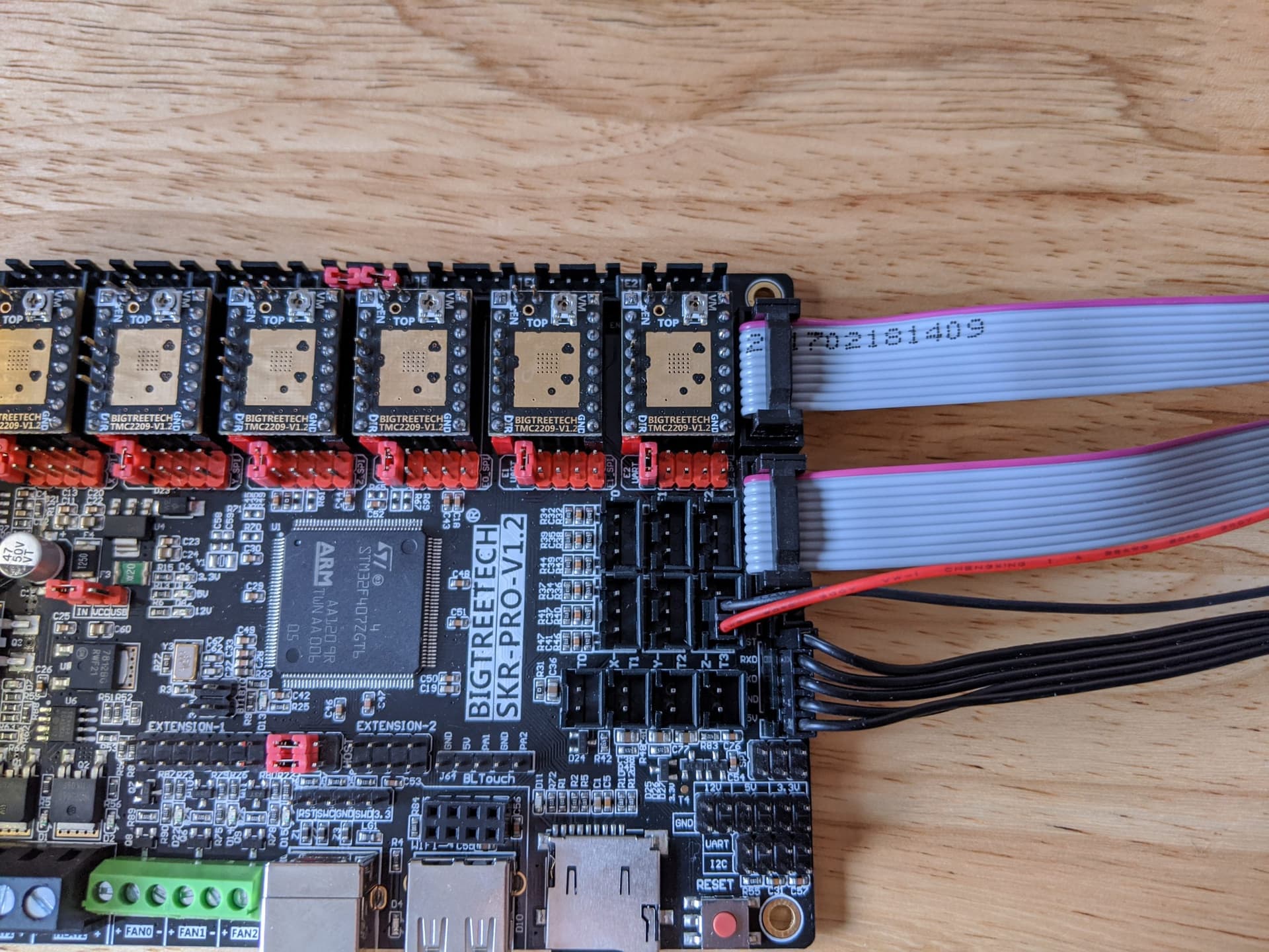 X1 (only X) goes to X (bottom left of picture), Z2 goes to E0 (top left), Y1 goes to Y (bottom middle), Y2 goes to E1 (top middle), Touch Plate goes to Z (bottom right), Z1 goes to E2 (top right). The lights for the end stops donât exactly match the drivers used for that axis. Not intuitive, for sure!