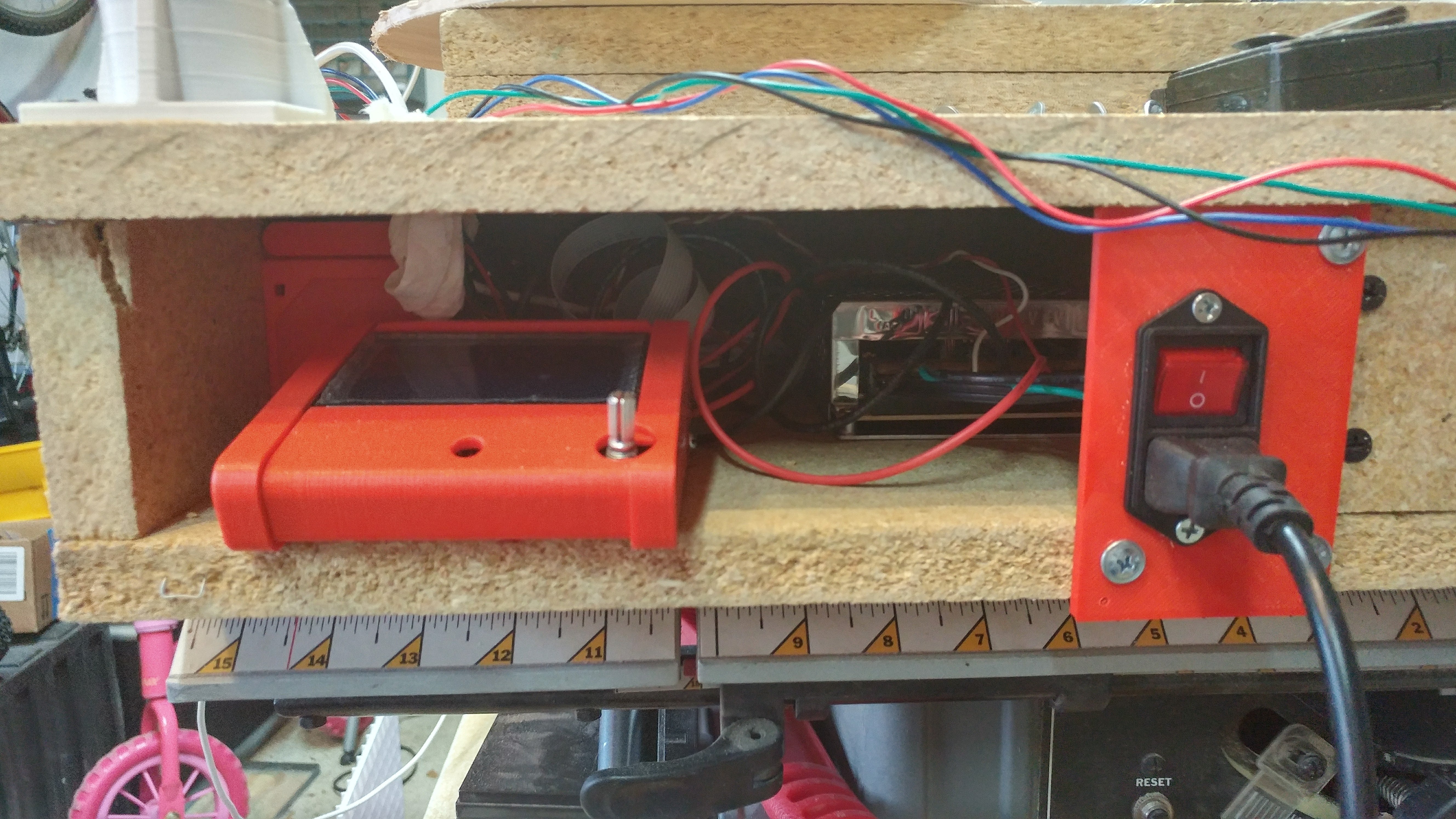 Pictures. When I made the torsion box, I left a panel off. There’s just enough room inside for the Ramps 1.4, power supply, and LCD. I’ll mount a power switch on it when it comes in. I also plan on putting a spoiler board on it (that’s why there’s so much height)