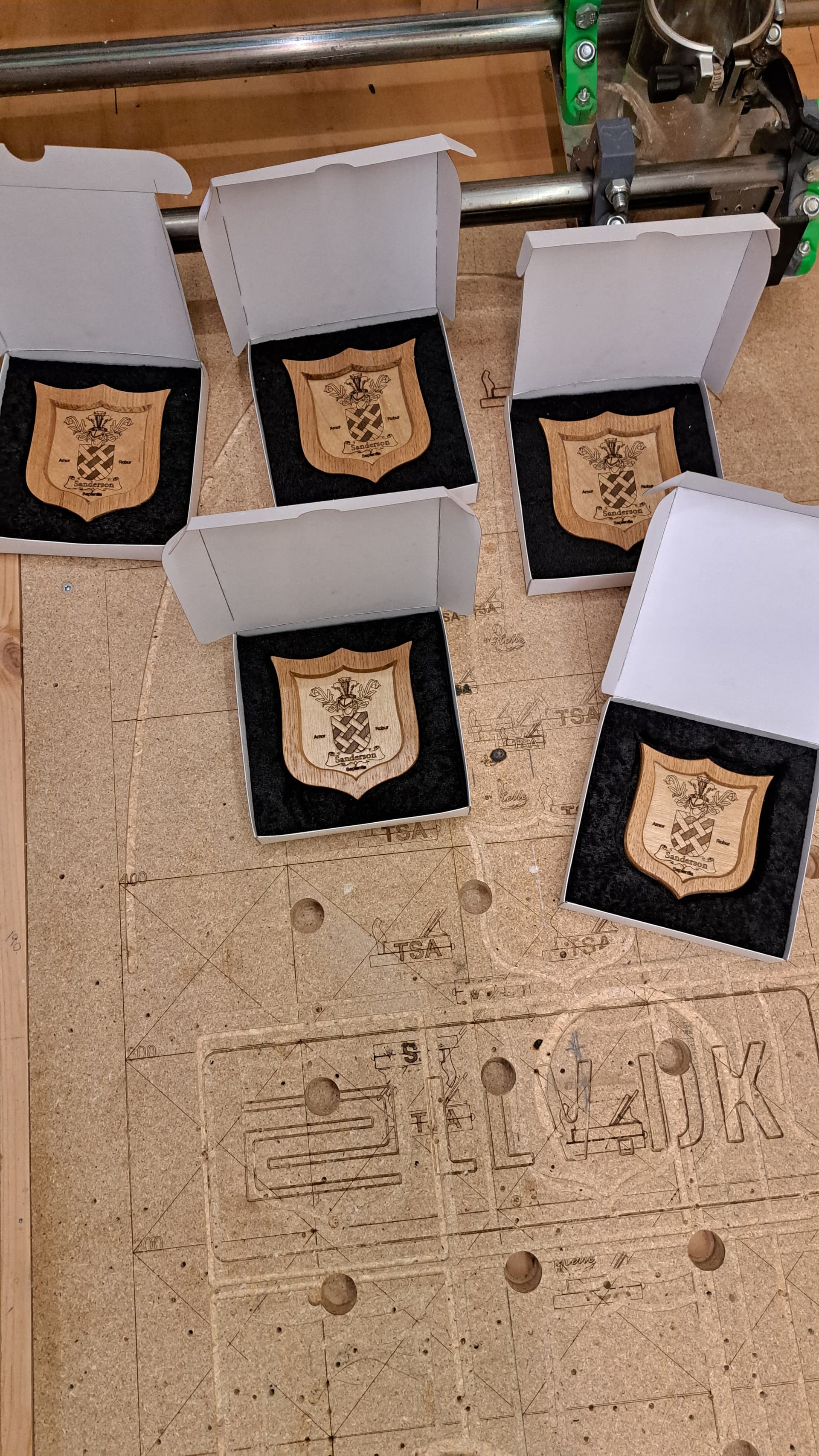 Boxes with black velvet. Emblem made from oak and plywood.