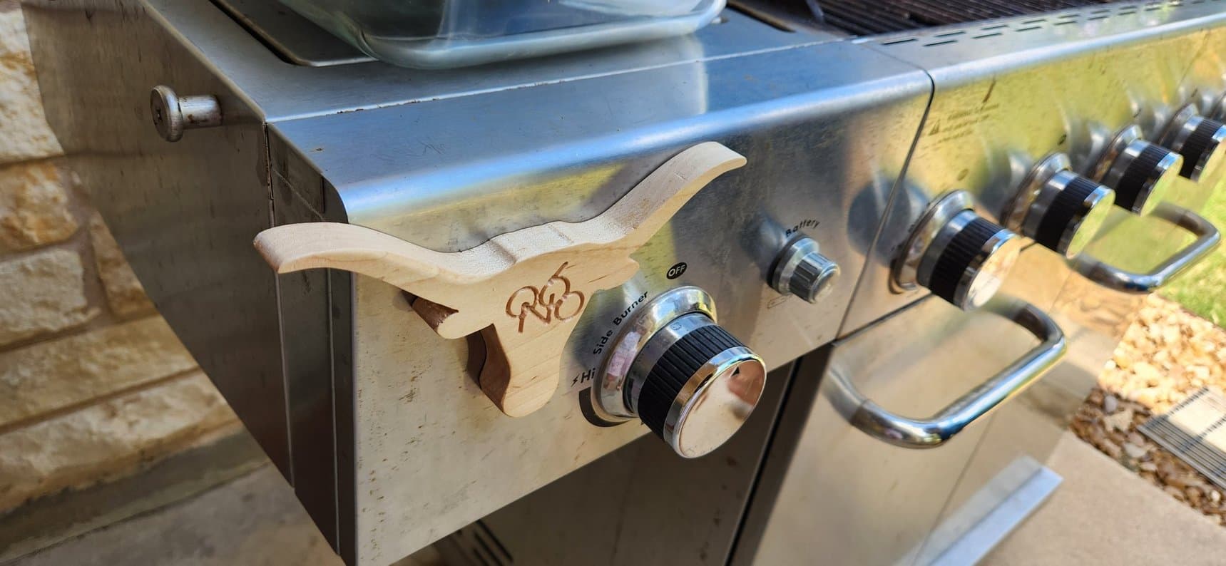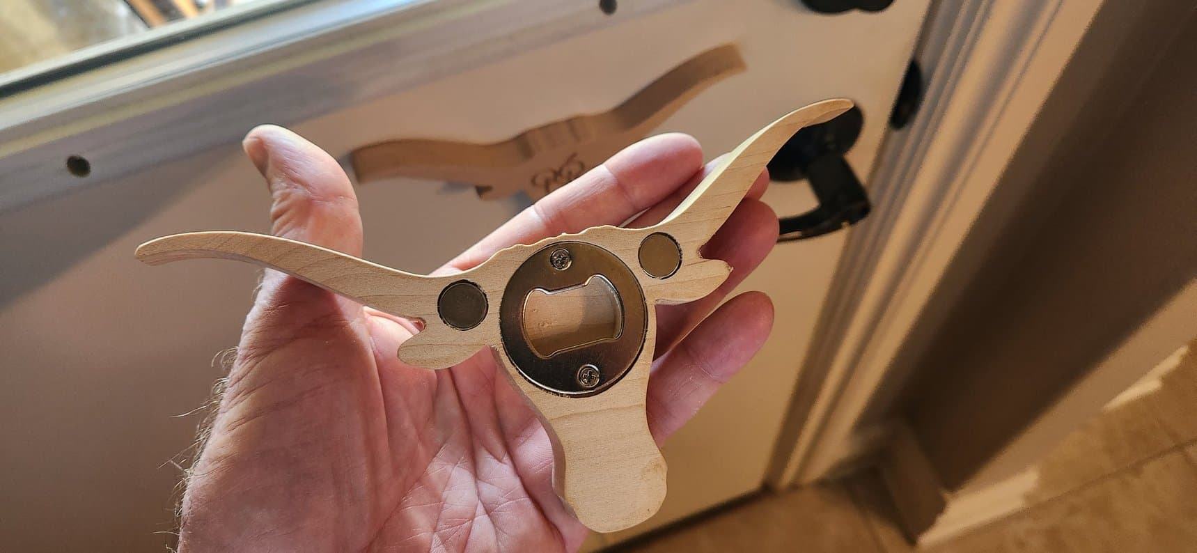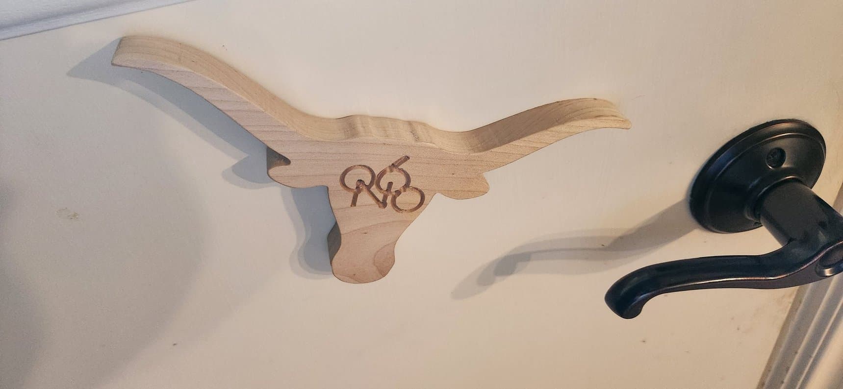 Well, the birthday weekend in Austin, TX was a success. I was up until about 2am Weds night making my last cuts, but here’s the final product. My buddy was turning 60 and he’s a University of Texas grad (“longhorns”). I had drawn up the “QN 60” emblem (his initials & age) in Fusion360, hoping I could get the laser working that I had just bought from @Neilp, but if you’ve read the above, I had enough else to deal with. Then for the longest time I couldn’t any suitable CAM to generate in Fusion – those lines are 2mm wide; I was essentially trying to generate a v-carve for a 30 degree V bit. In the end, this is the best I could do with the time I had. My goal of bringing enough to have “party favors” for all was cut back a bit; I think I ended up with 5 or 6.