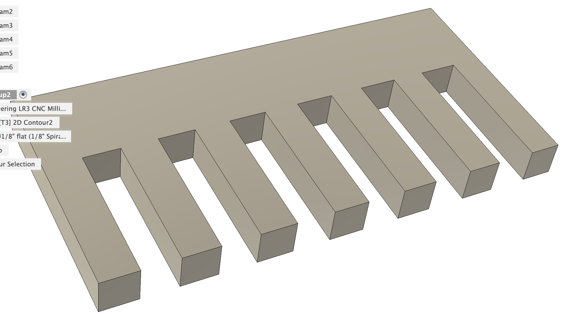 I started playing with box designs from makercase.com, and the first design I started on was a symmetrical 4-chamber, open-top box. Knowing that getting my clearances right was crucial, I started by only cutting the two divider pieces with mating half-slots. Way too tight. Using Fusion’s CAM, I set my “radial material to leave” to a negative value and kept incrementing it until I got two parts that could slide together. (Alternatively, I could go back to makercase and increase the material thickness.)