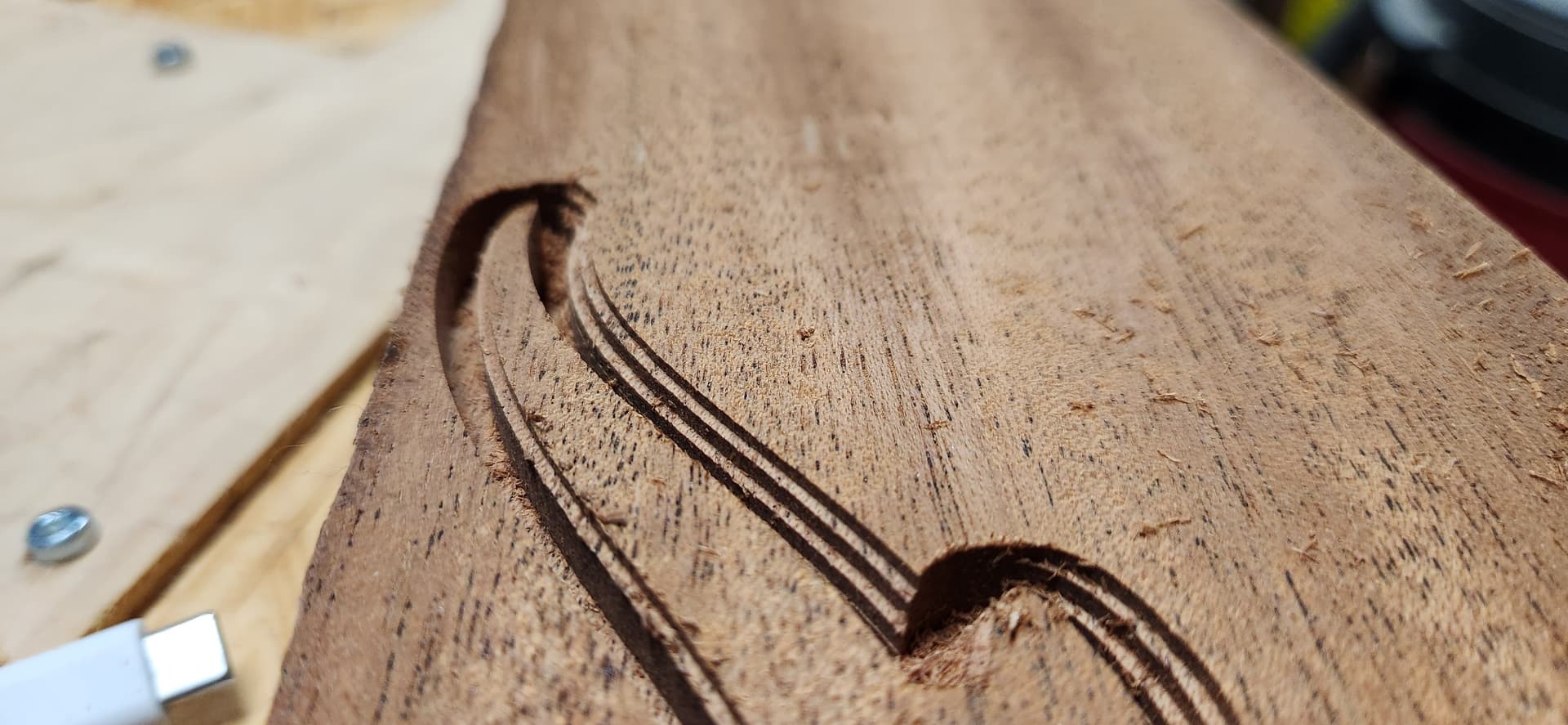 I’m pocketing, drilling, then cutting the outline of my design. Using 1/8” upcut spiral, 2mm stepdown with a final finishing pass, 3/4” solid wood material. First in my soft maple, and now again in a test piece of mahogany, it seems that every successively deeper pass gets shifted toward X=0 a little bit.