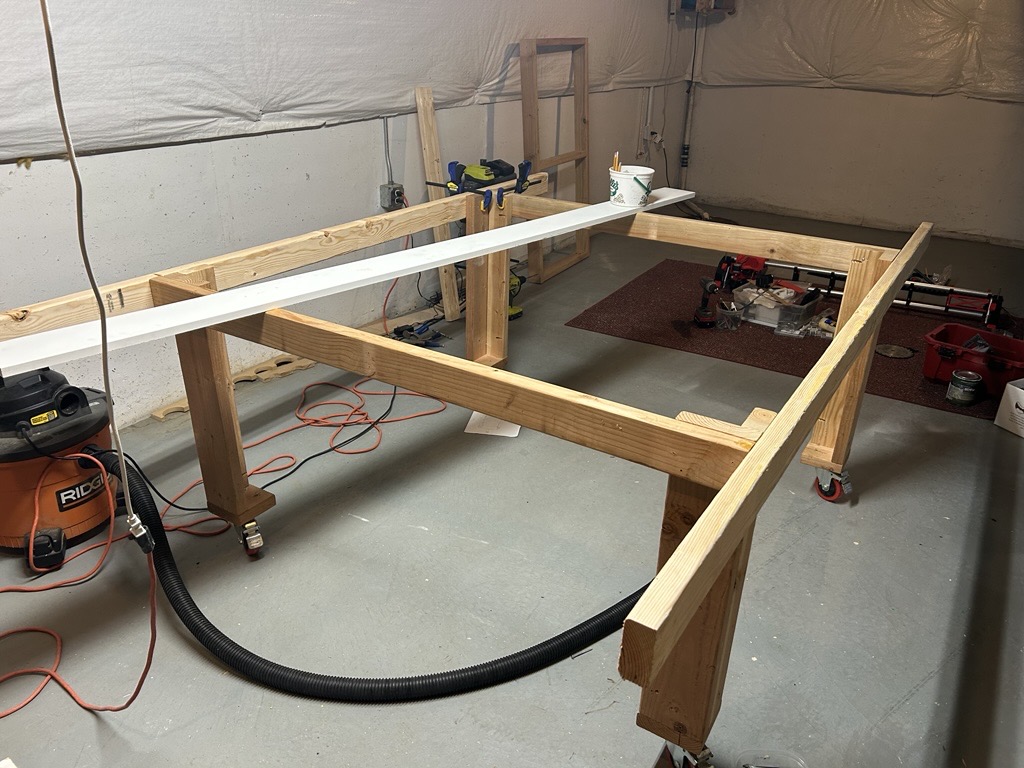 After a little hiatus filled with family vacations, home repairs, and kids events, I got back to work on my LR 4. I deconstructed (you can see pieces of it in the background) my old work table and turned it into a CNC table. This is my progress so far. It is made of premium douglas fur as it was fairly straight and in expensive (comparative speaking). I’m going to use a piece of 1x PCV board I had left over for the XY min side as I think it will provide better wear than MDF….If you have used PCV board and got different results, please let me know.