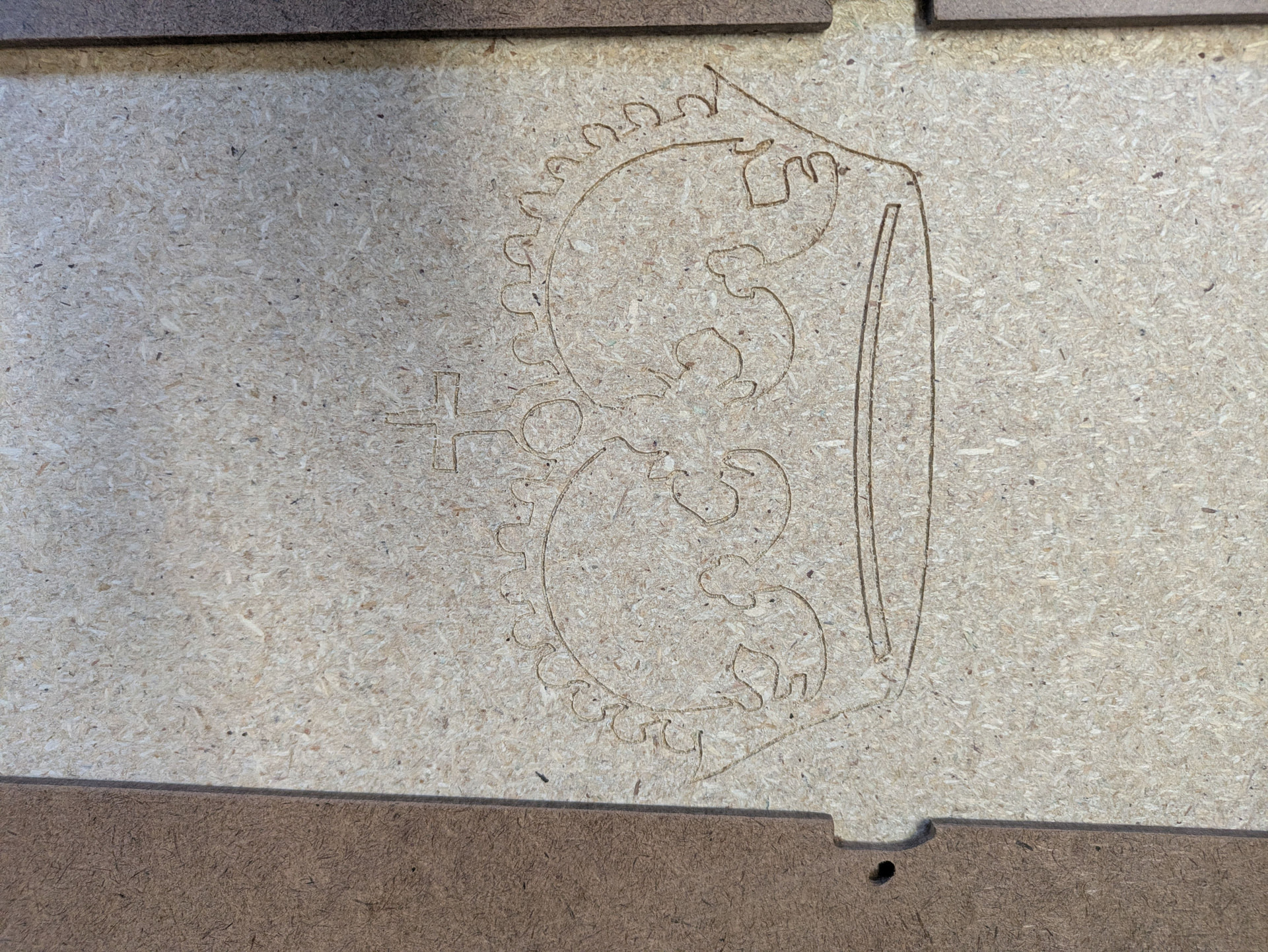 I’ve calibrated the belts, squared, and levelled it, and have just tried engraving a test image (crown.dxf) and then cutting my strut plates.