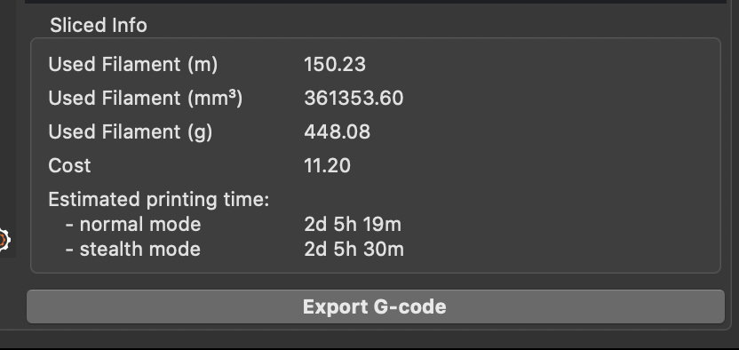This is with 4 perimeters, 70% infill (as recommended for this part), 0.2 layer height and Gyriod infill. Swapping out for rectilinear infill drops the time to 1d 10h!