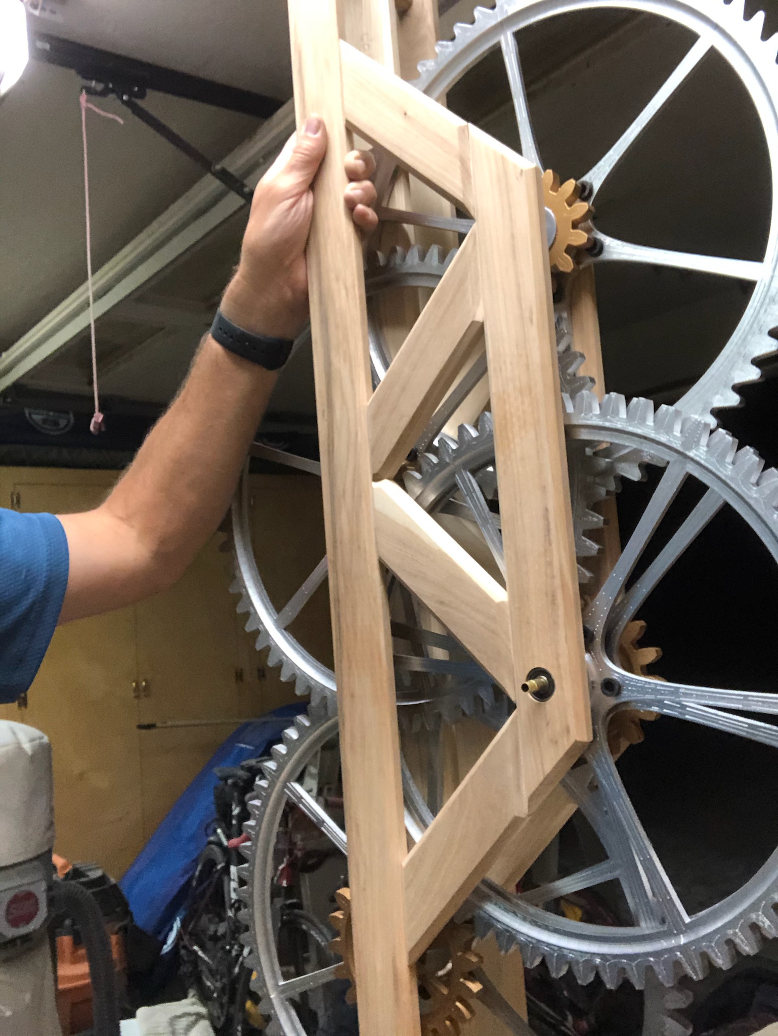 I’m in San Jose, so you’ll have a local guy flushing out MPCNC 2020 as soon as I can download and print it. I have the perfect project that needs a little more stiffness. In the previous picture you can see a fireplace. I designed a clock/kinetic sculpture that hangs on the wall. The 3D printed gears are too light and hard to keep planar, so I’m going to use the MPCNC to cut new gears. See photo of the 3D printed prototype.
