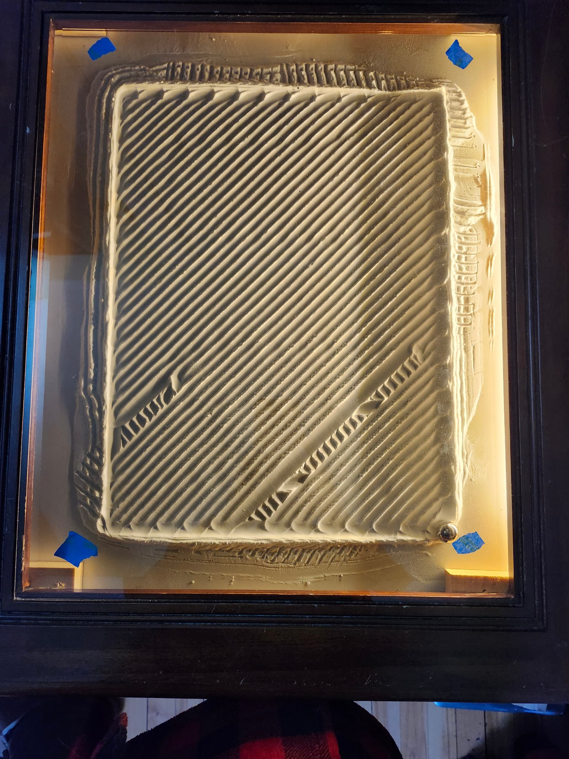 I’ll see also if thinning out the soda more across the board helps with the jitter. I’m thinking about going with a smaller ball to get more detail on the relatively small table as patterns with text are not great so far, so I assume smaller ball means I’ll need shallower sand.