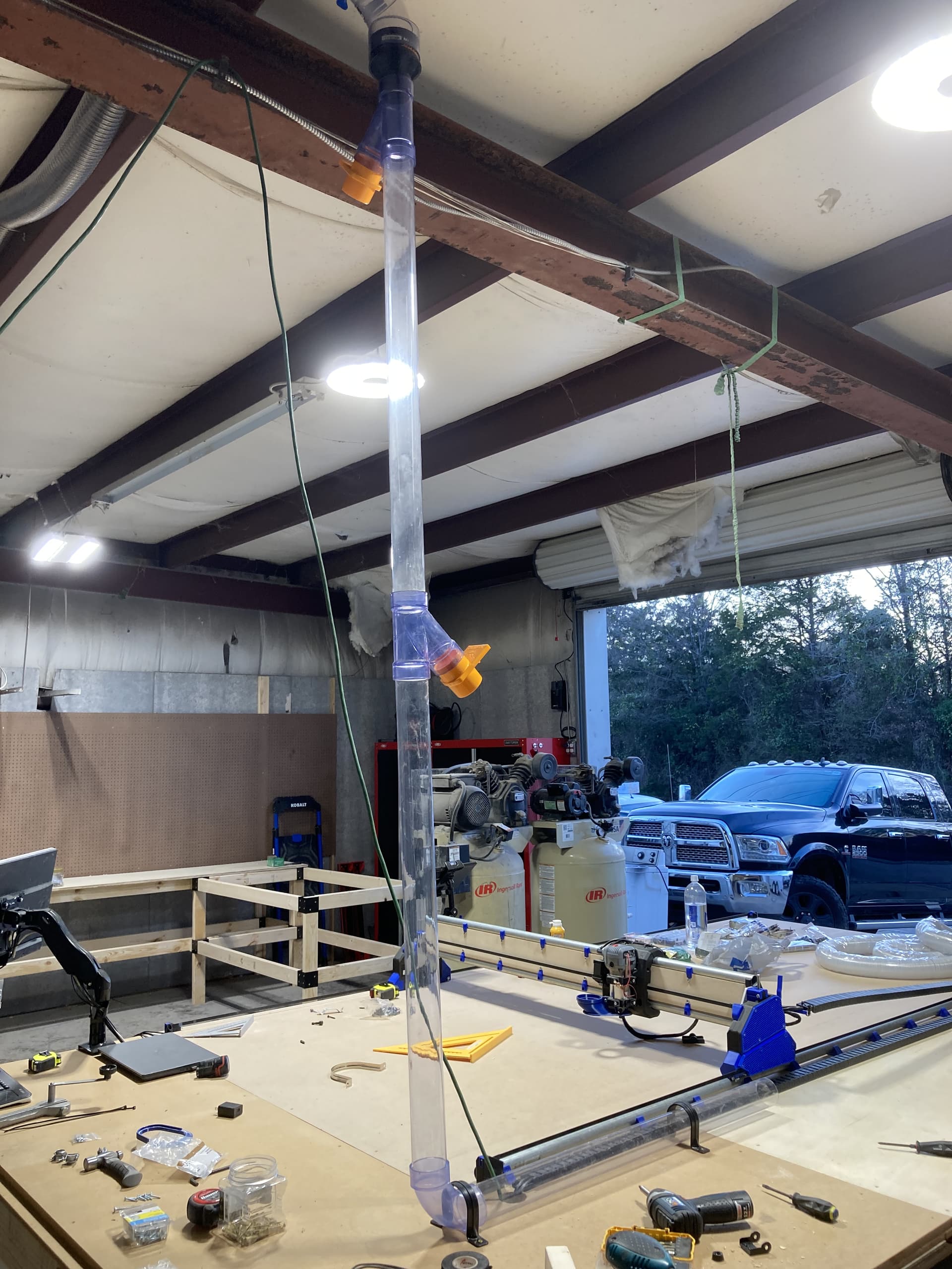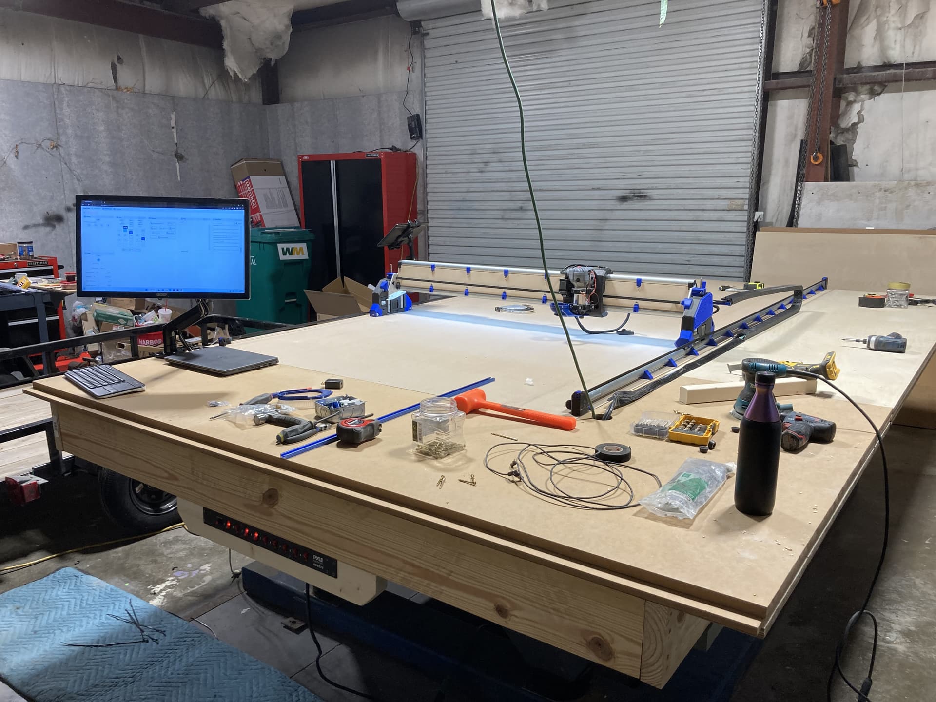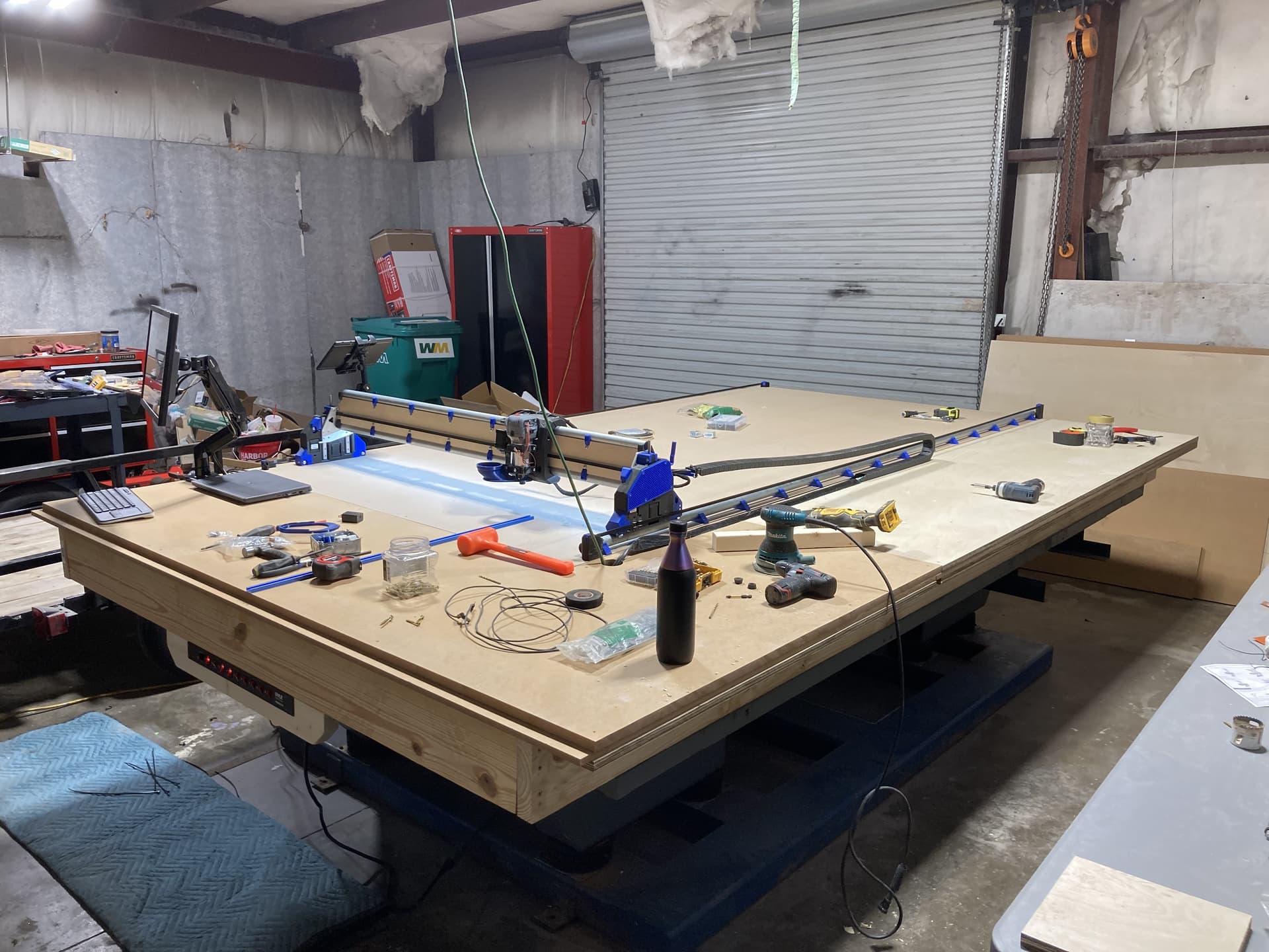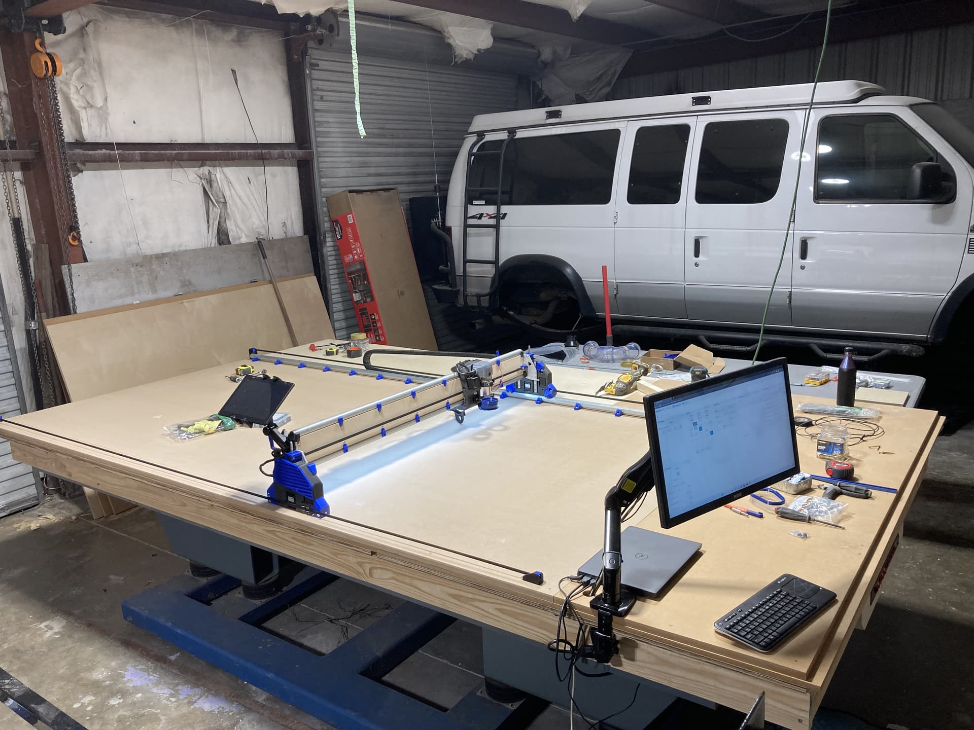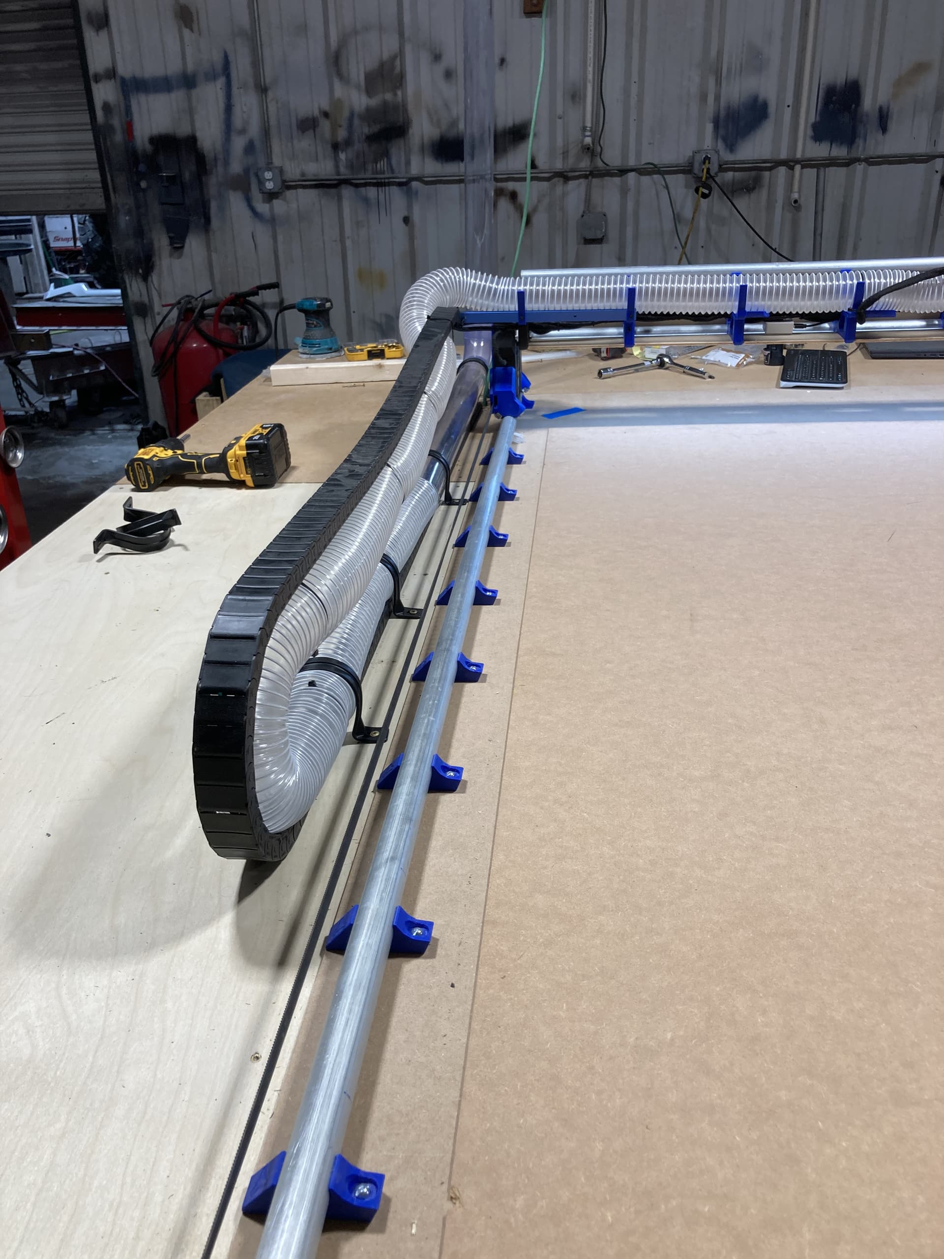 You can see I already have my drag chain mounted and fully functional for power to the gantry, LR4 and spindle. That part already works very well. I bought the 10 gauge wiring and conduit to get power to the table vs the current extension cord. On a side note, has anyone priced copper wiring recently?!!? OMG! Anyway…should have more significant updates later today as I spent much of yesterday building out work benches and routing 4” dust collection trunks around the shop. Next I have to get the air compressor installed and plumbed as I also picked up the wiring and disconnect for it.