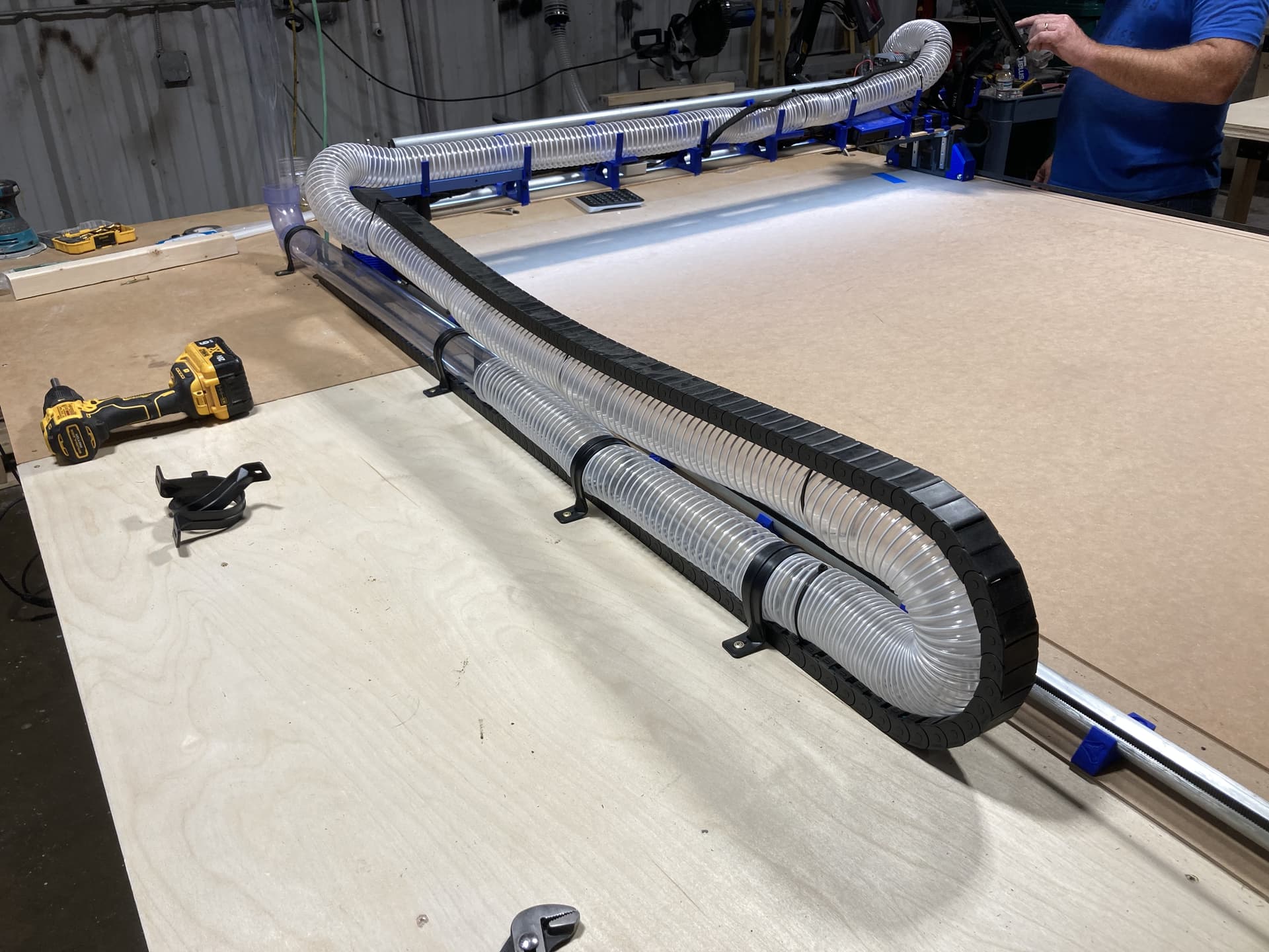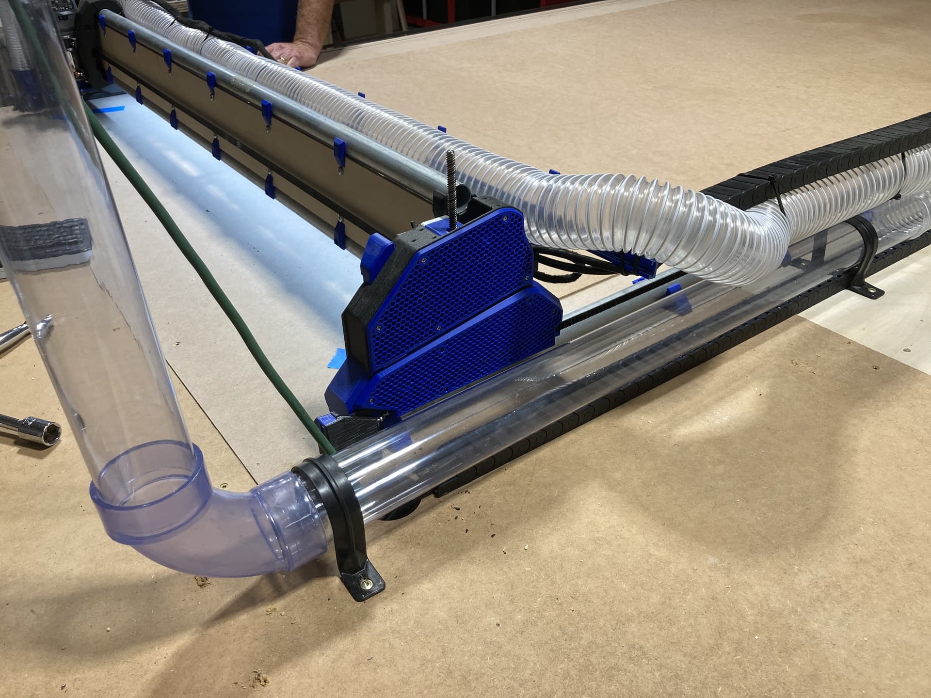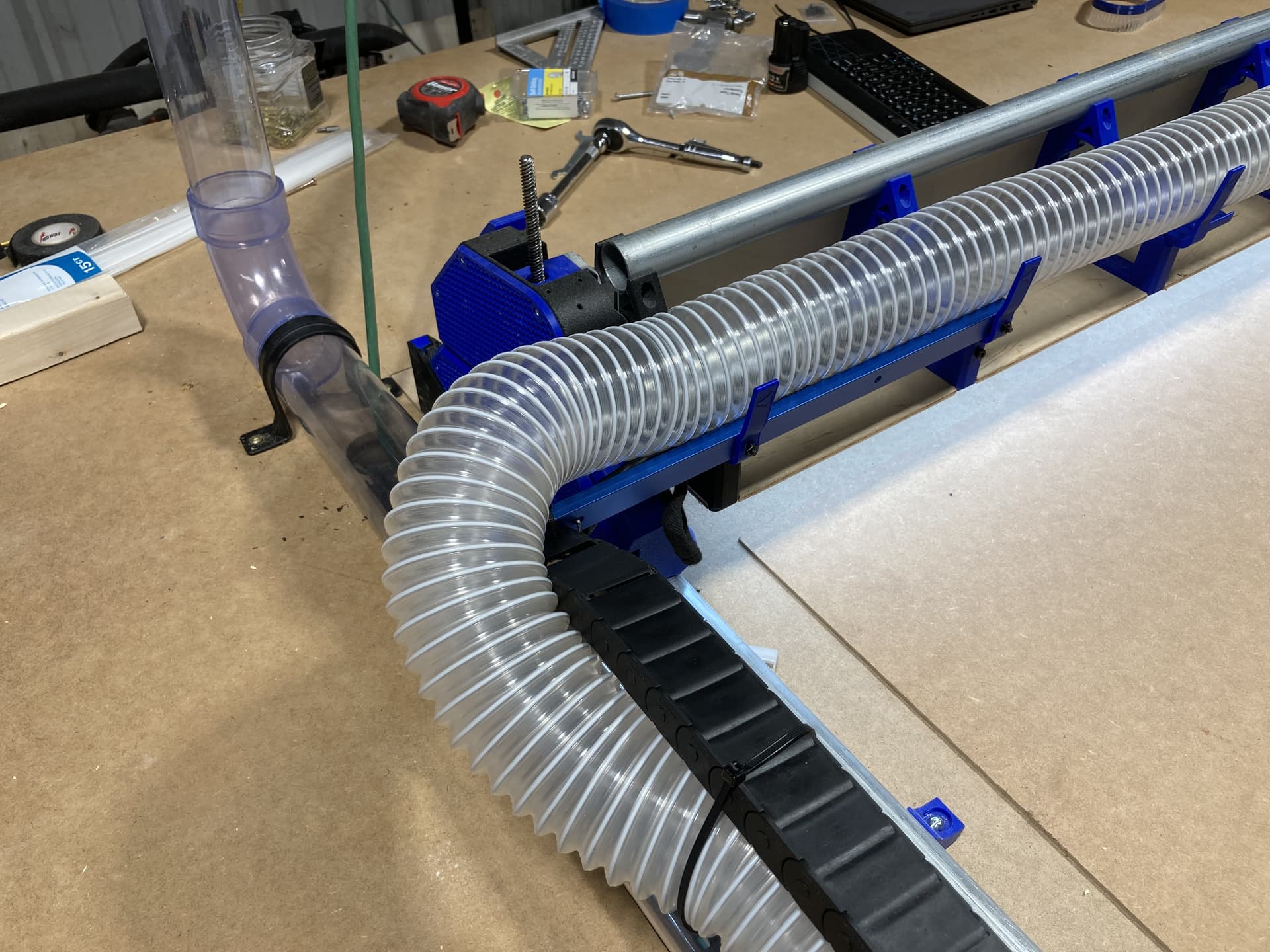 I fabricated an extension arm from light weight T track (also blue) and bolted it to the X Axis hose supports so it extends beyond the guide rail. This enables the power to be internal to the chain and the dust collection hose strapped to the drag chain without interfering with the Z-axis movement.