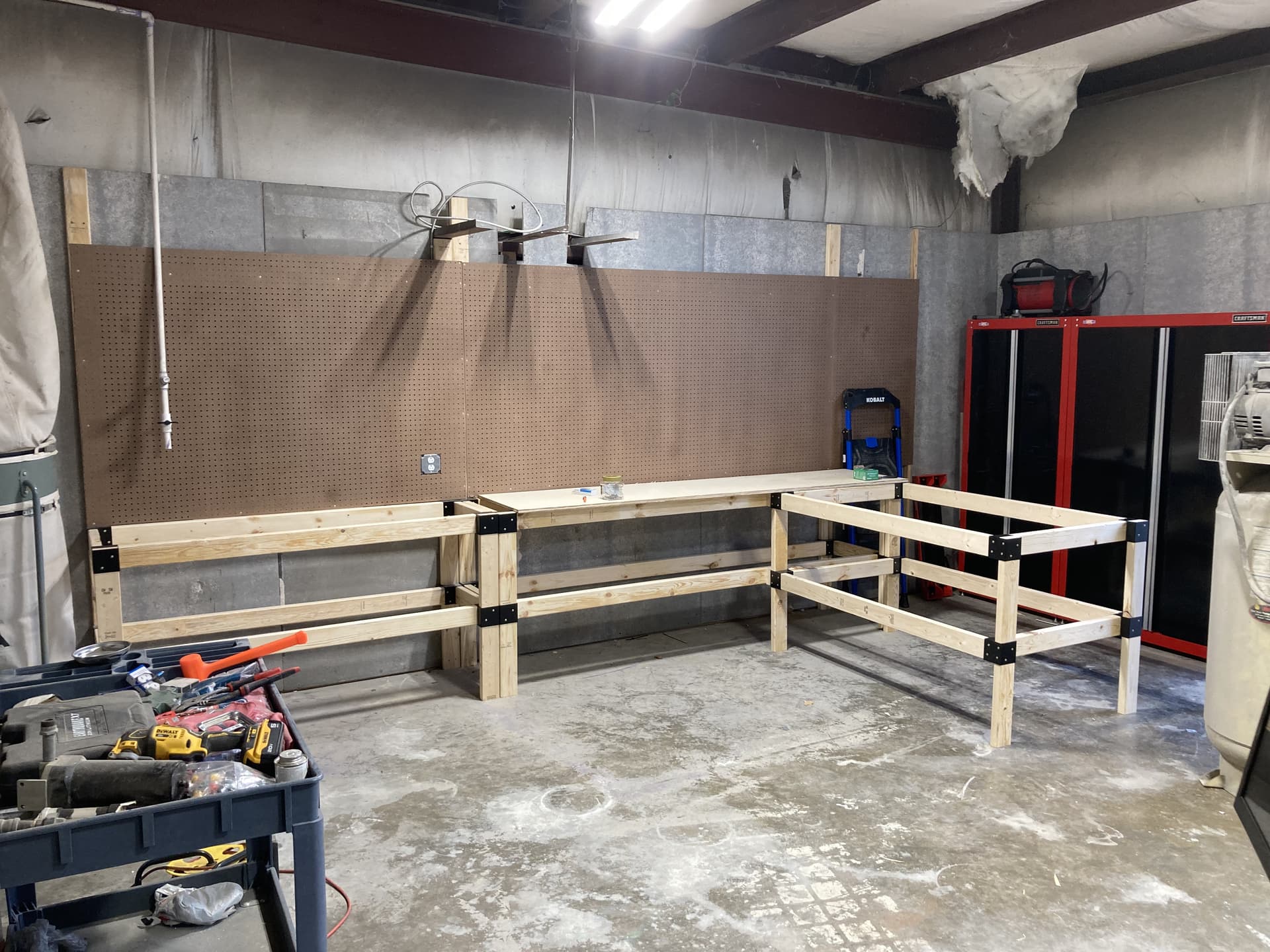 The 30” wide extended workbench will have retractable castors that can be lowered and the workbench disconnected from the main bench and rolled around the shop as a work/build table that attaches to the main workbenches when not needing to be mobile. That way I can have an island work table that is not taking up valuable shop floor space when not in use.