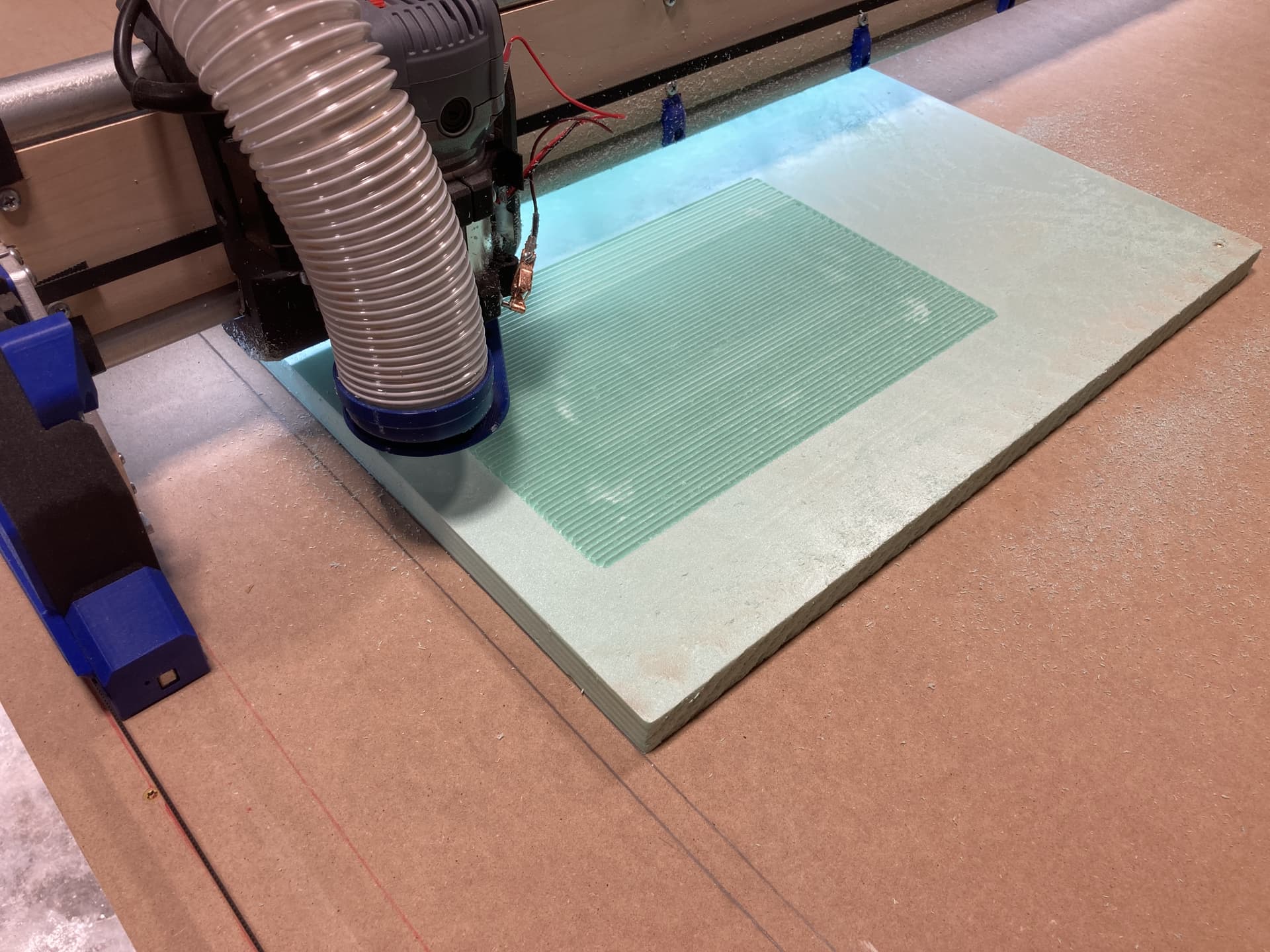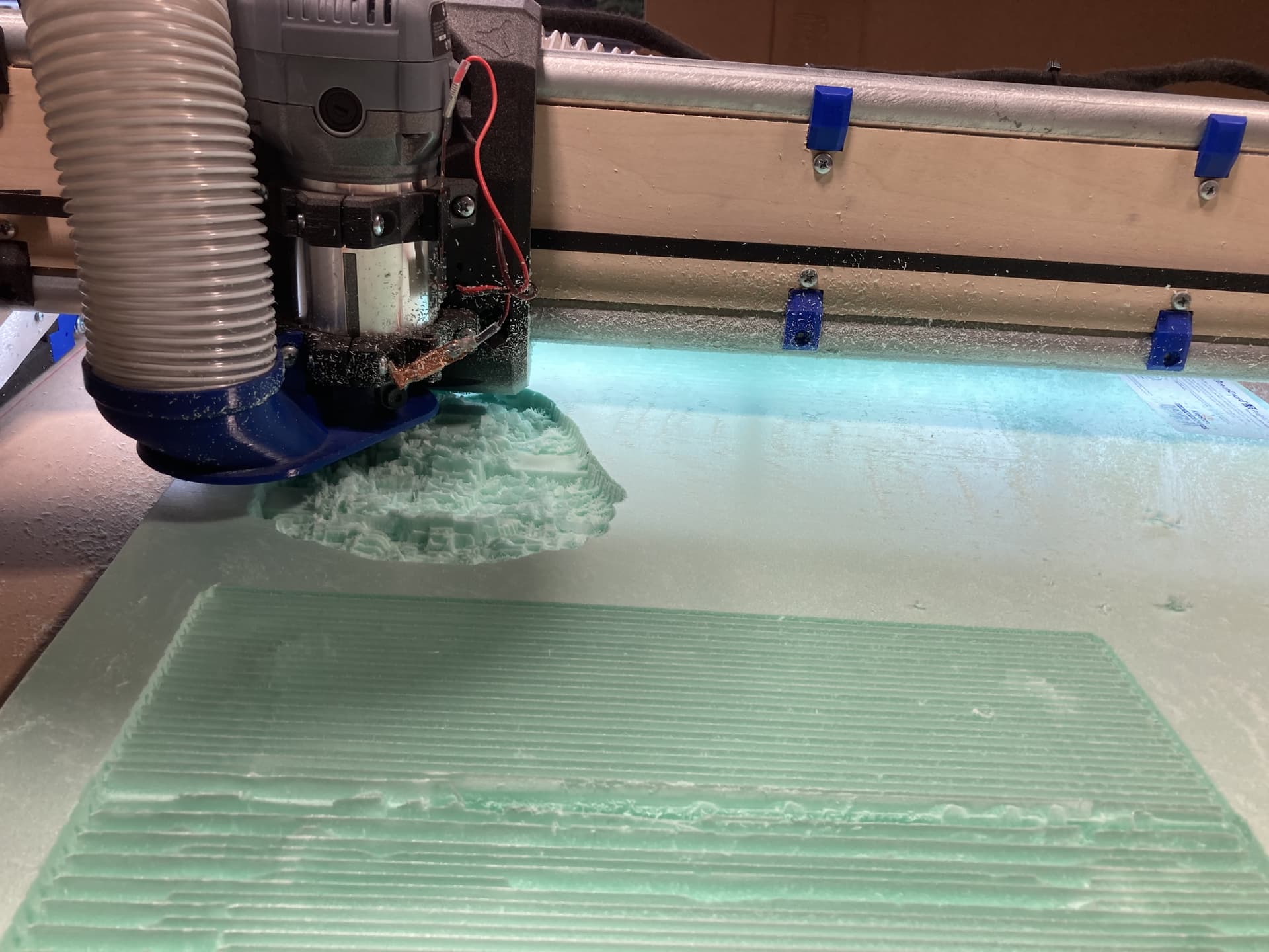 So we finally made sawdust…but first a HUGE shout out to Jonathan at NorthWoods for his invaluable telephone tech support helping us get the LR4 squared up and zeroed in today. Our final numbers were less than .02mm difference over the full width X axis and our diagonals were less than .25mm over the full 10 ft table. I think I articulated those correctly. Jonathan can correct me, but these really low numbers are a true testament to the LR4 design and the quality of Jonathan’s build.