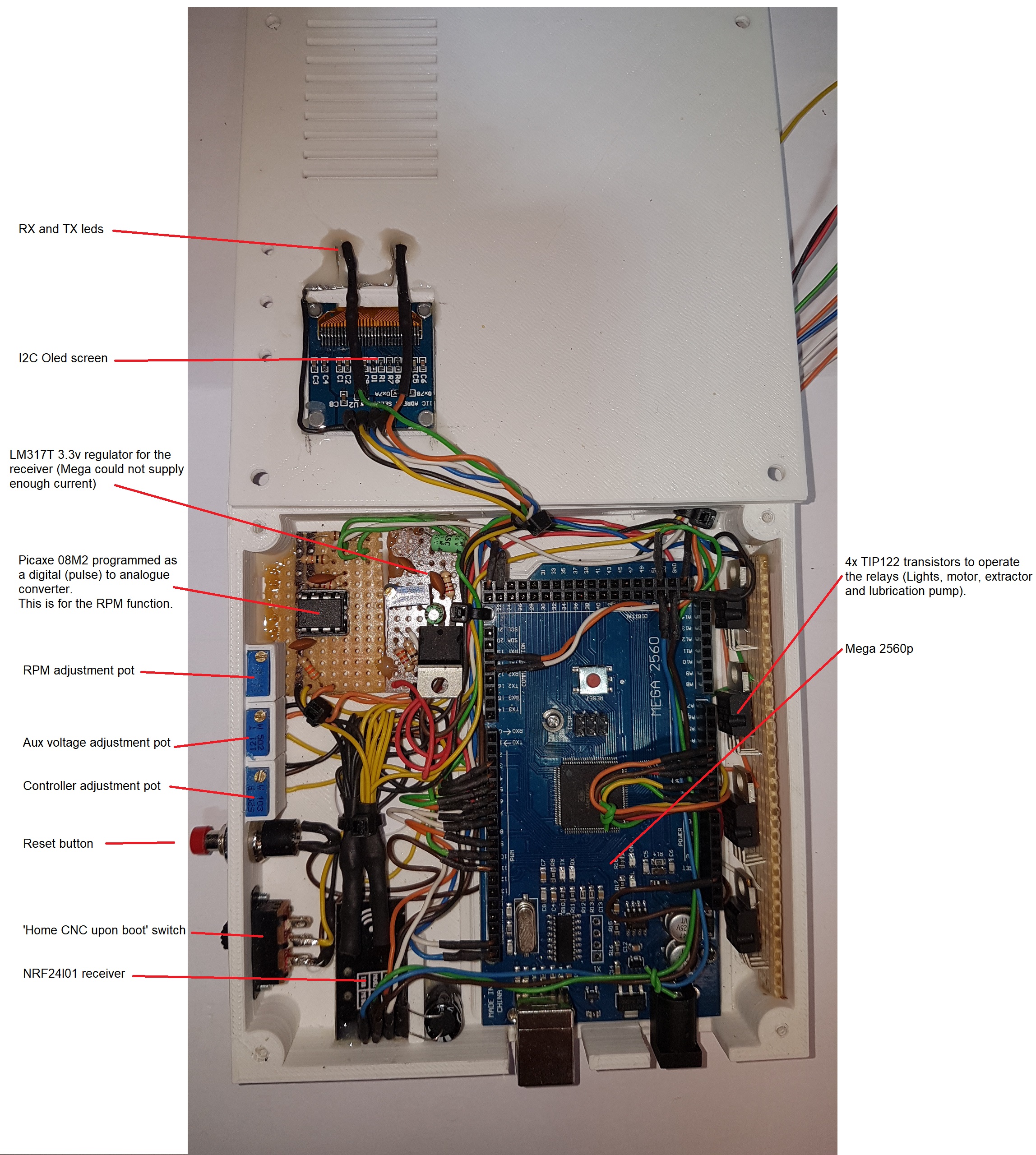 The receiver is mounted under the CNC with the relays. This talks to the Rambo controller on it’s own serial port, so you can still use Repetier on the USB socket and the LCD screen all at the same time.